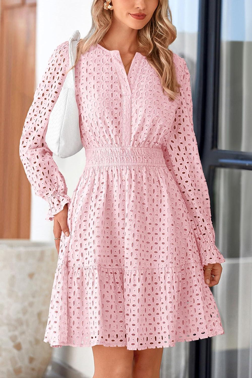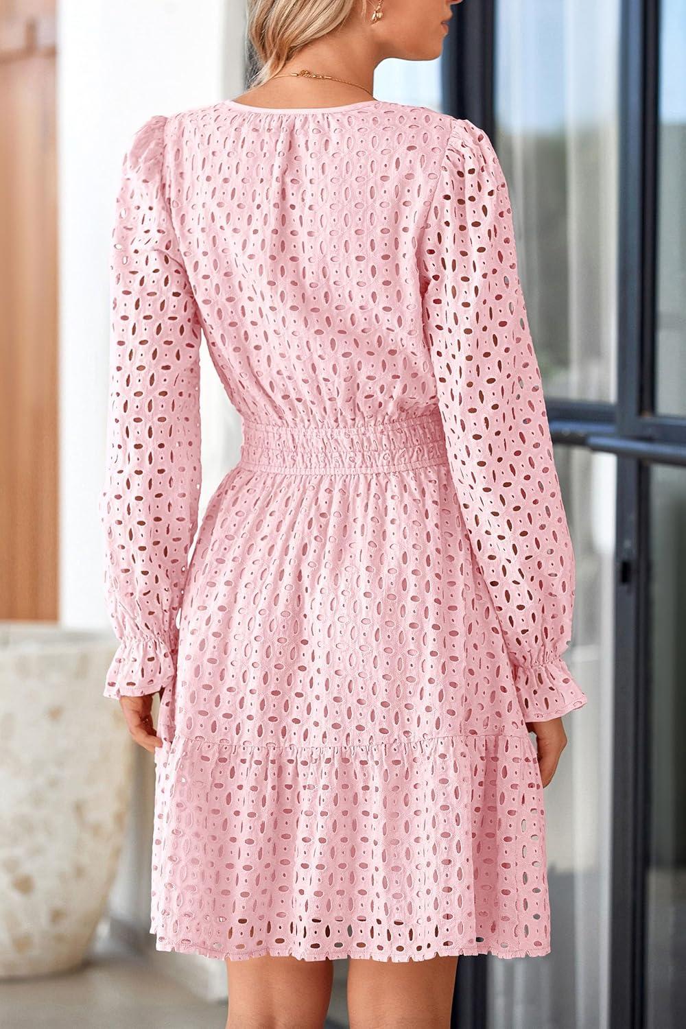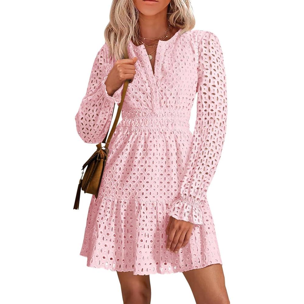 PRETTYGARDEN Women’s 2025 Long Sleeve Mini Dress Eyelet V Neck A Line Casual Elegant Holiday Wedding Guest Party Dresses(Pink)