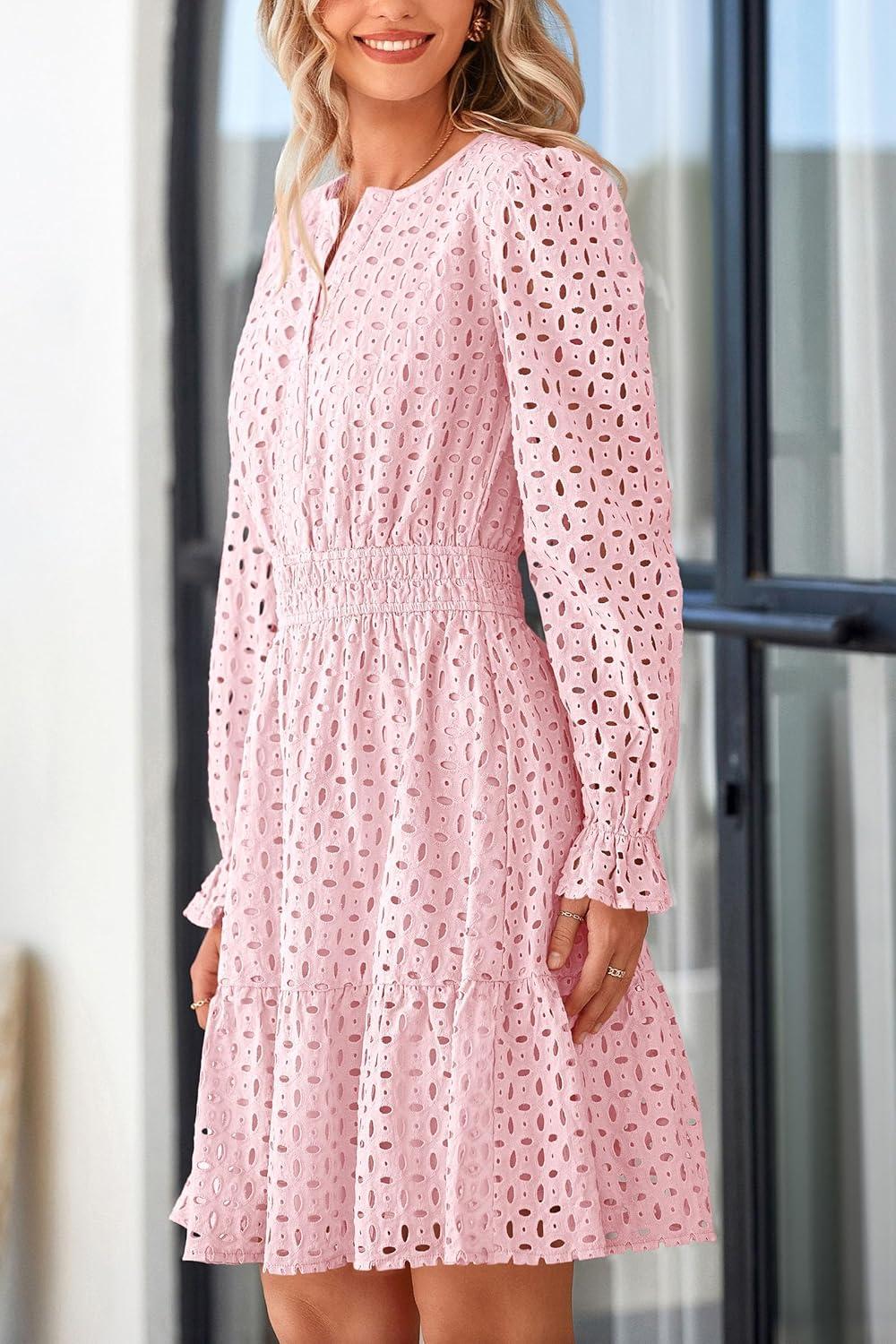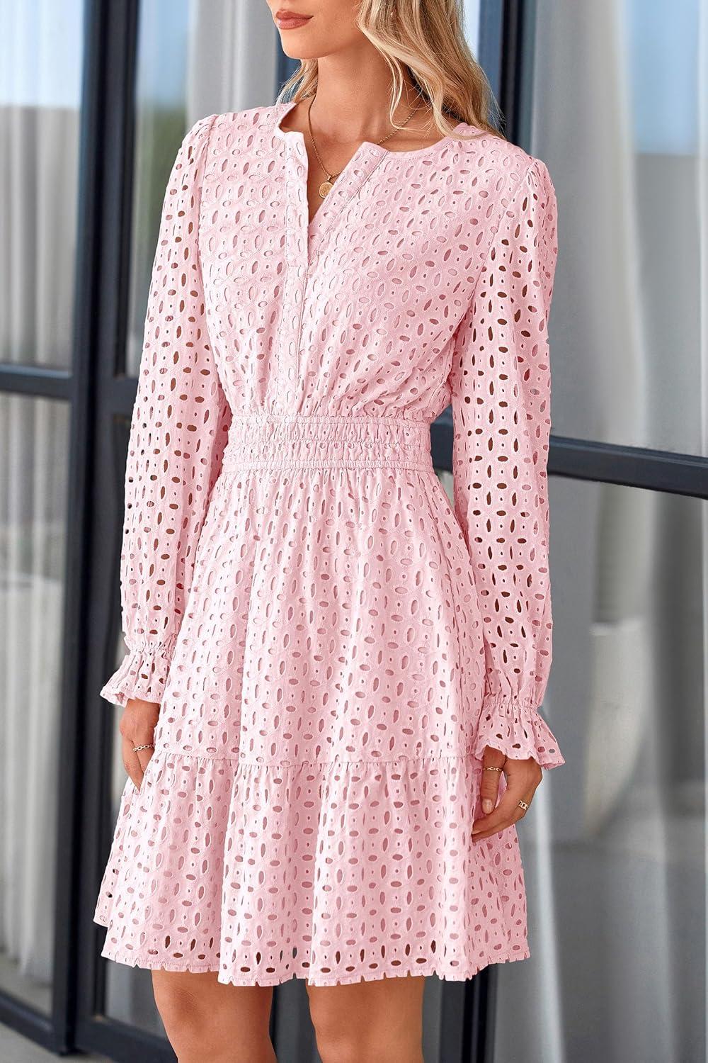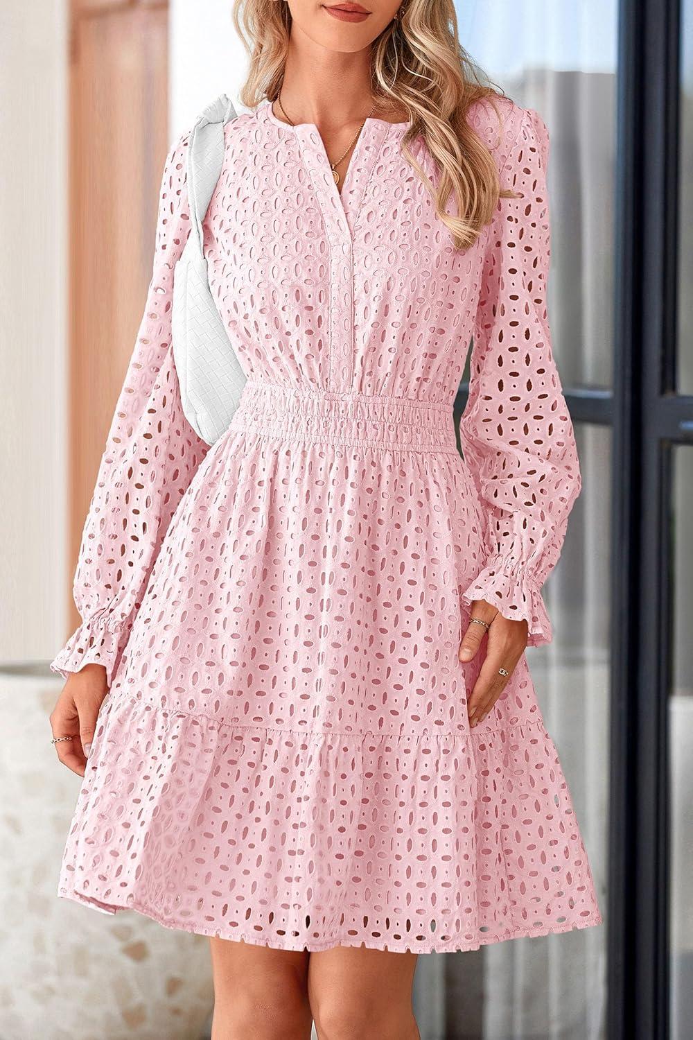 PRETTYGARDEN Women’s 2025 Long Sleeve Mini Dress Eyelet V Neck A Line Casual Elegant Holiday Wedding Guest Party Dresses(Pink)