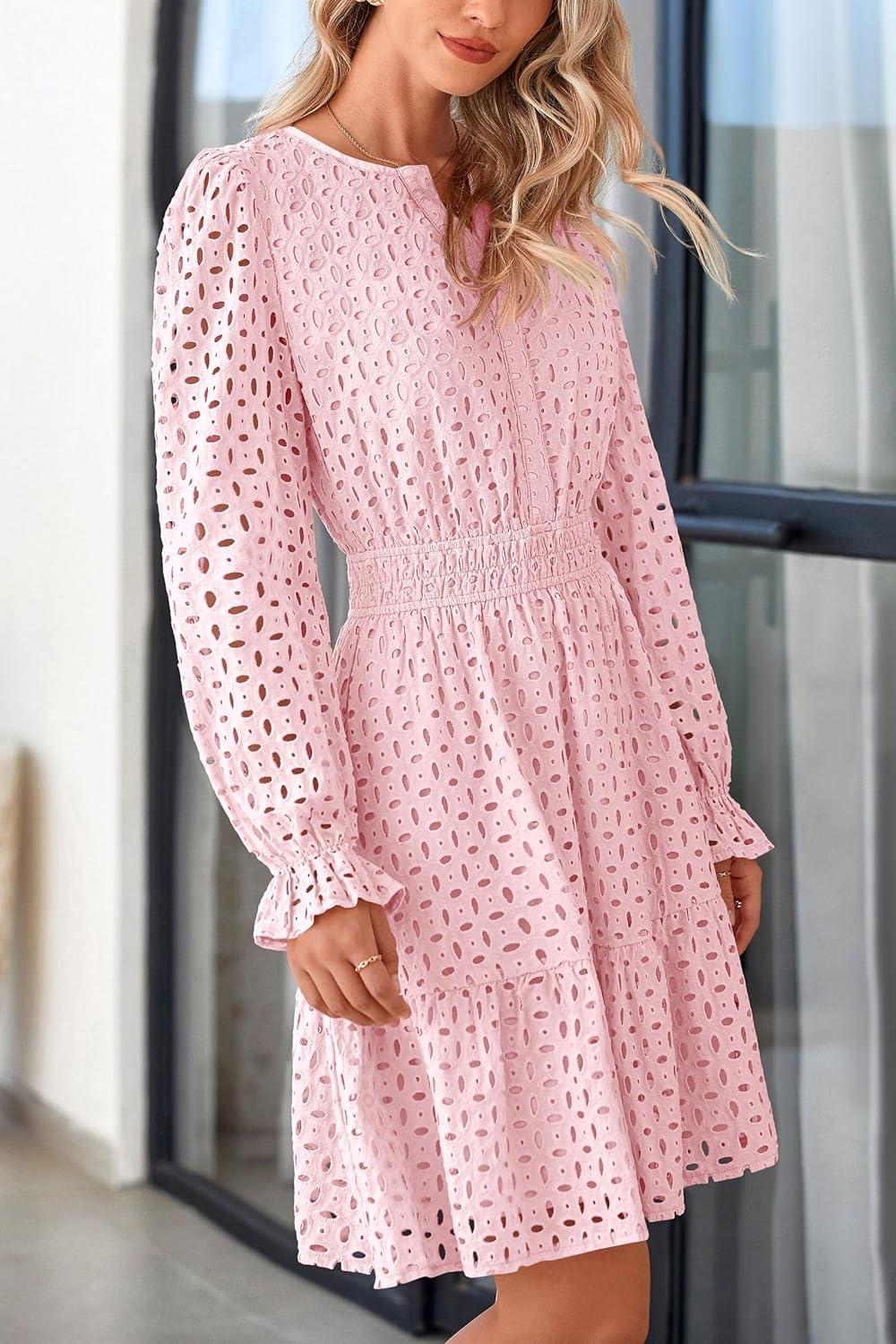 PRETTYGARDEN Women's 2025 Long Sleeve Mini Dress Eyelet V Neck A Line Casual Elegant Holiday Wedding Guest Party Dresses(Pink)