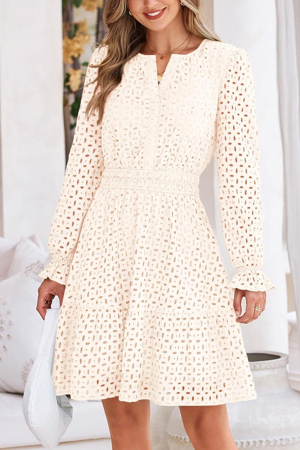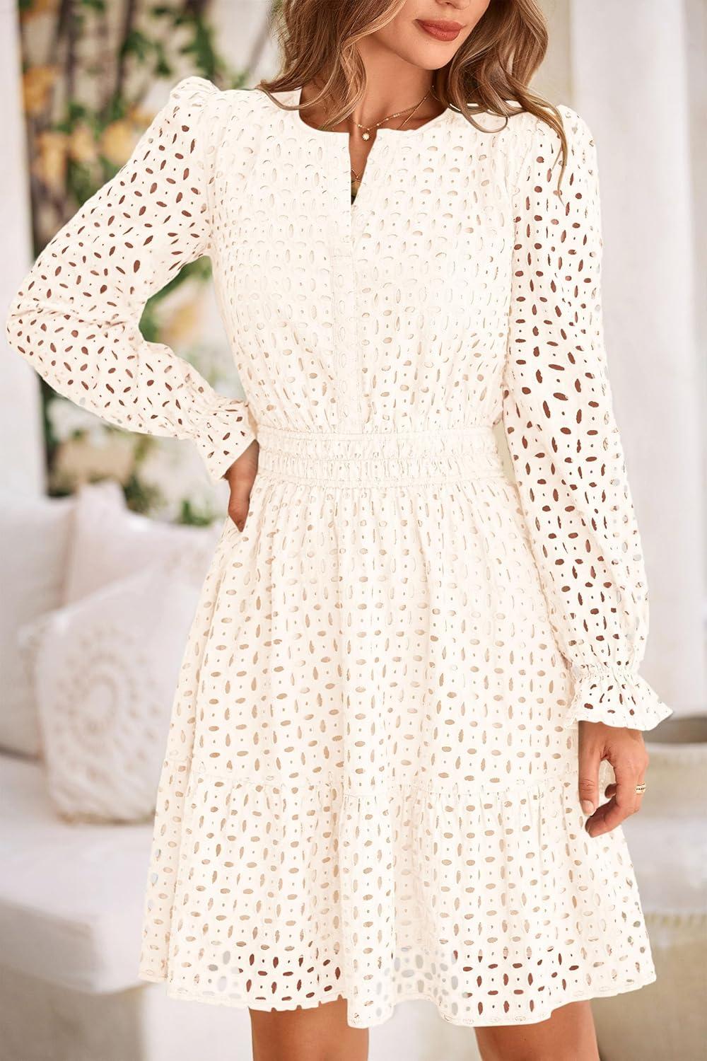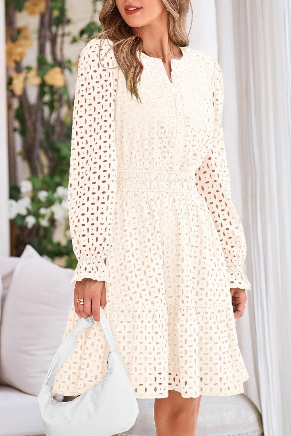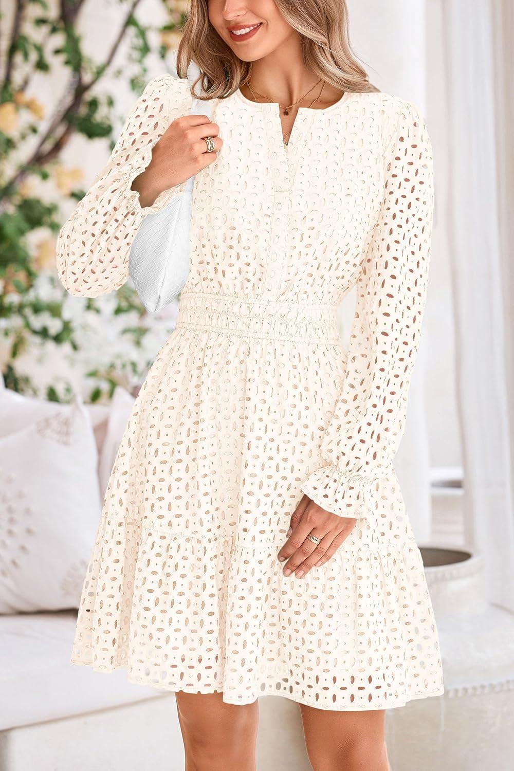 PRETTYGARDEN Women’s 2025 Long Sleeve Mini Dress Eyelet V Neck A Line Casual Elegant Holiday Wedding Guest Party Dresses(White)