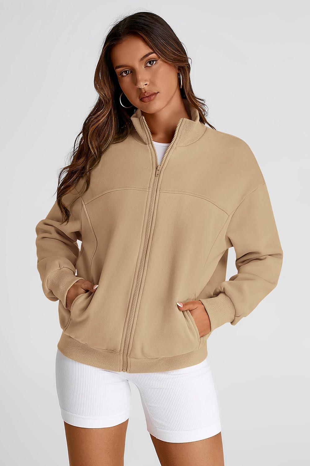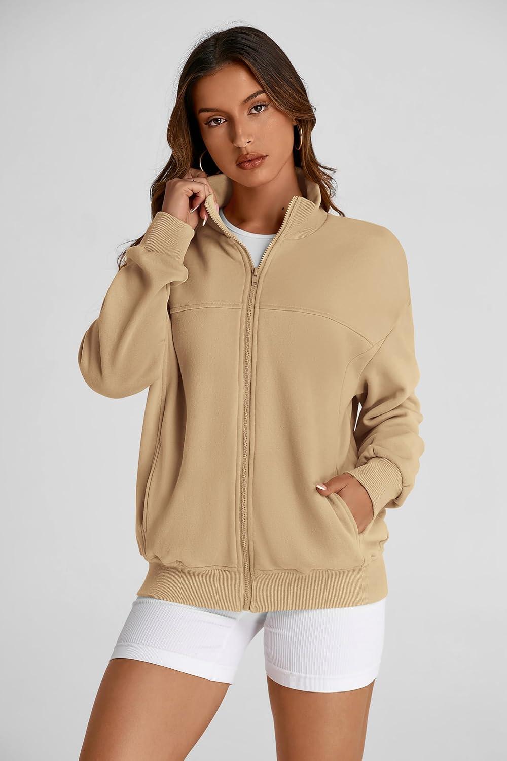 PRETTYGARDEN Women's 2025 Spring Fall Fashion Full Zip Up Sweatshirt Long Sleeve Loose Fit Trendy Casual Jacket with Pockets(Khaki)
