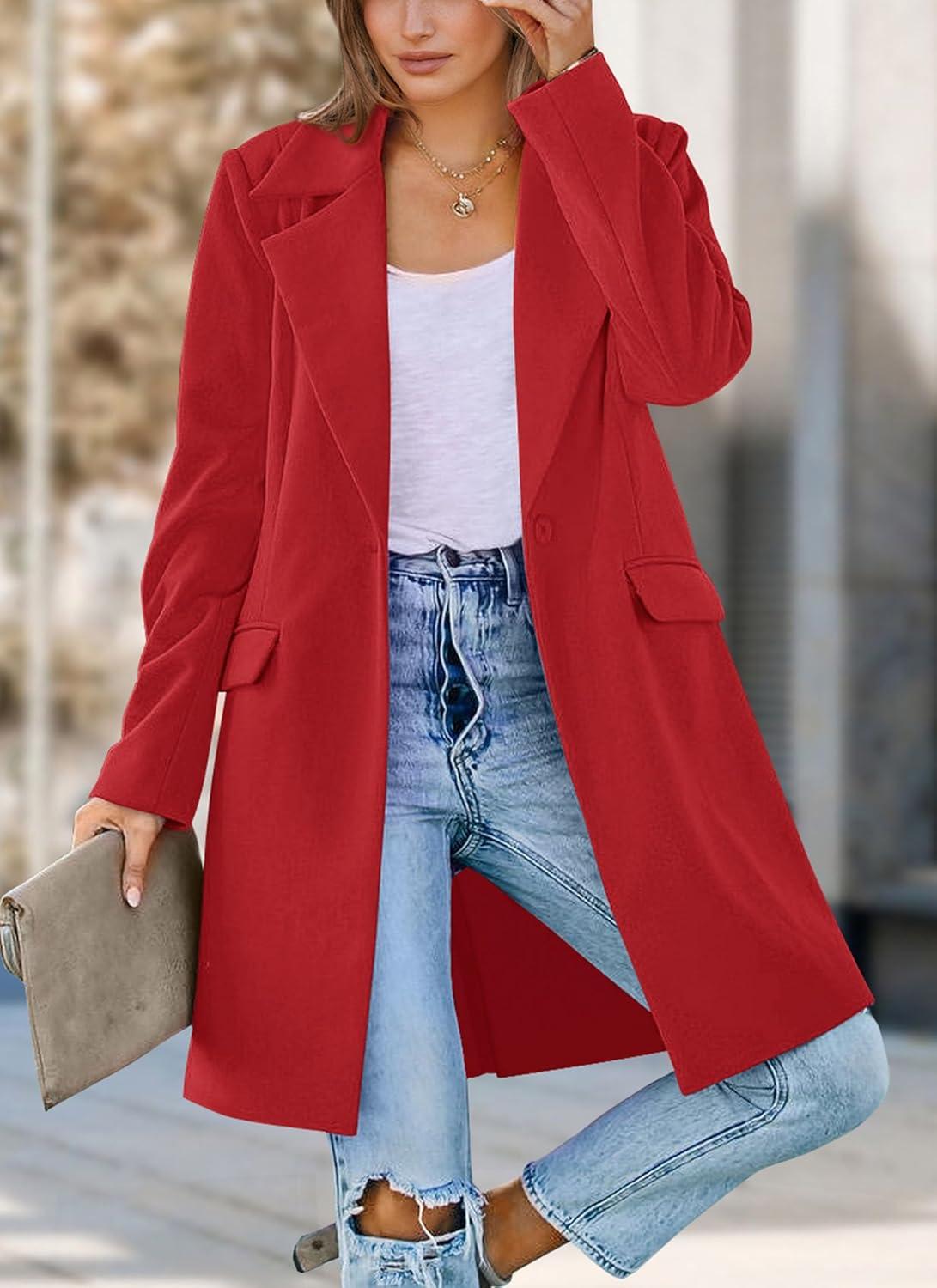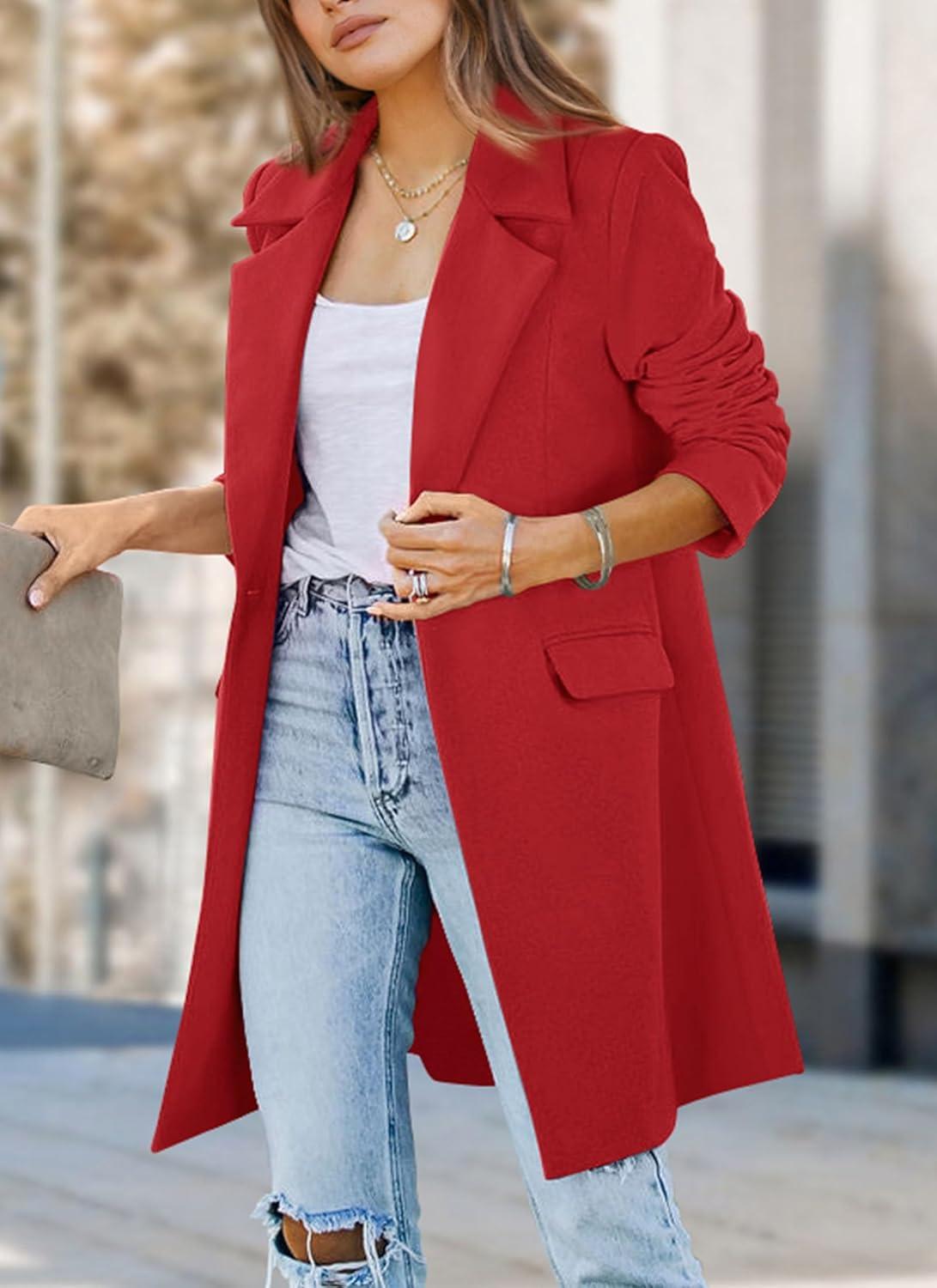 PRETTYGARDEN Women's 2025 Spring Fall Long Blazer Jackets Long Sleeve Lapel Pockets Loose Fit Work Casual Blazers Outerwear(Red)