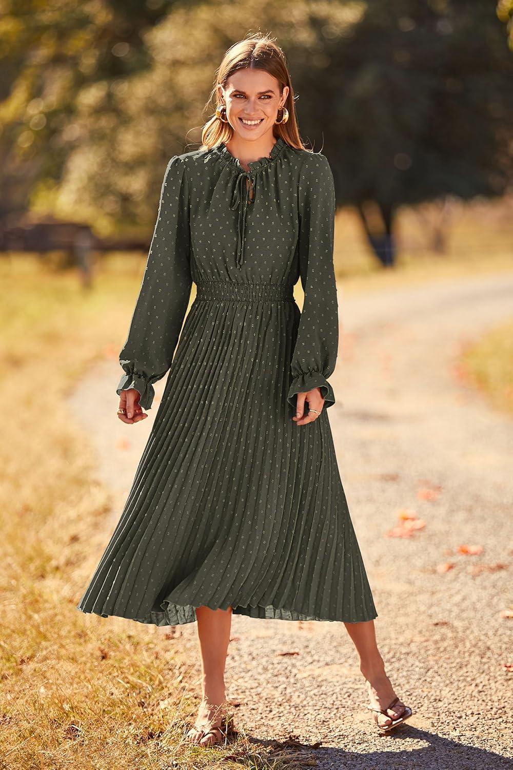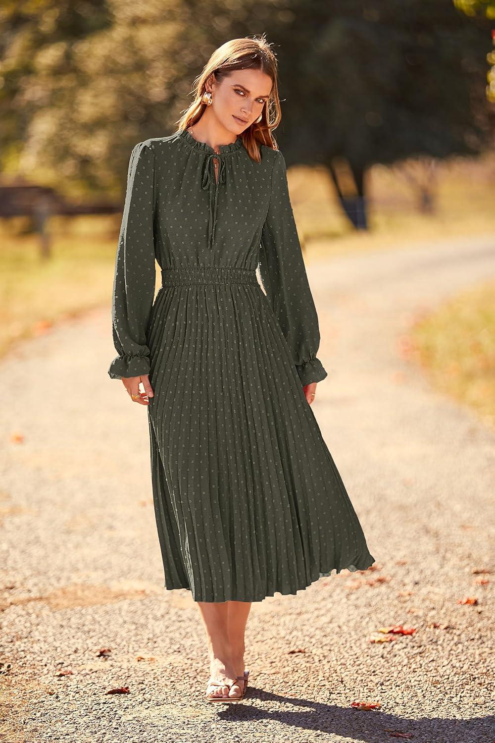 PRETTYGARDEN Women’s 2025 Spring Fall Midi Dress Casual Long Sleeve V Neck Swiss Dot Pleated A Line Flowy Dresses(Army Green)