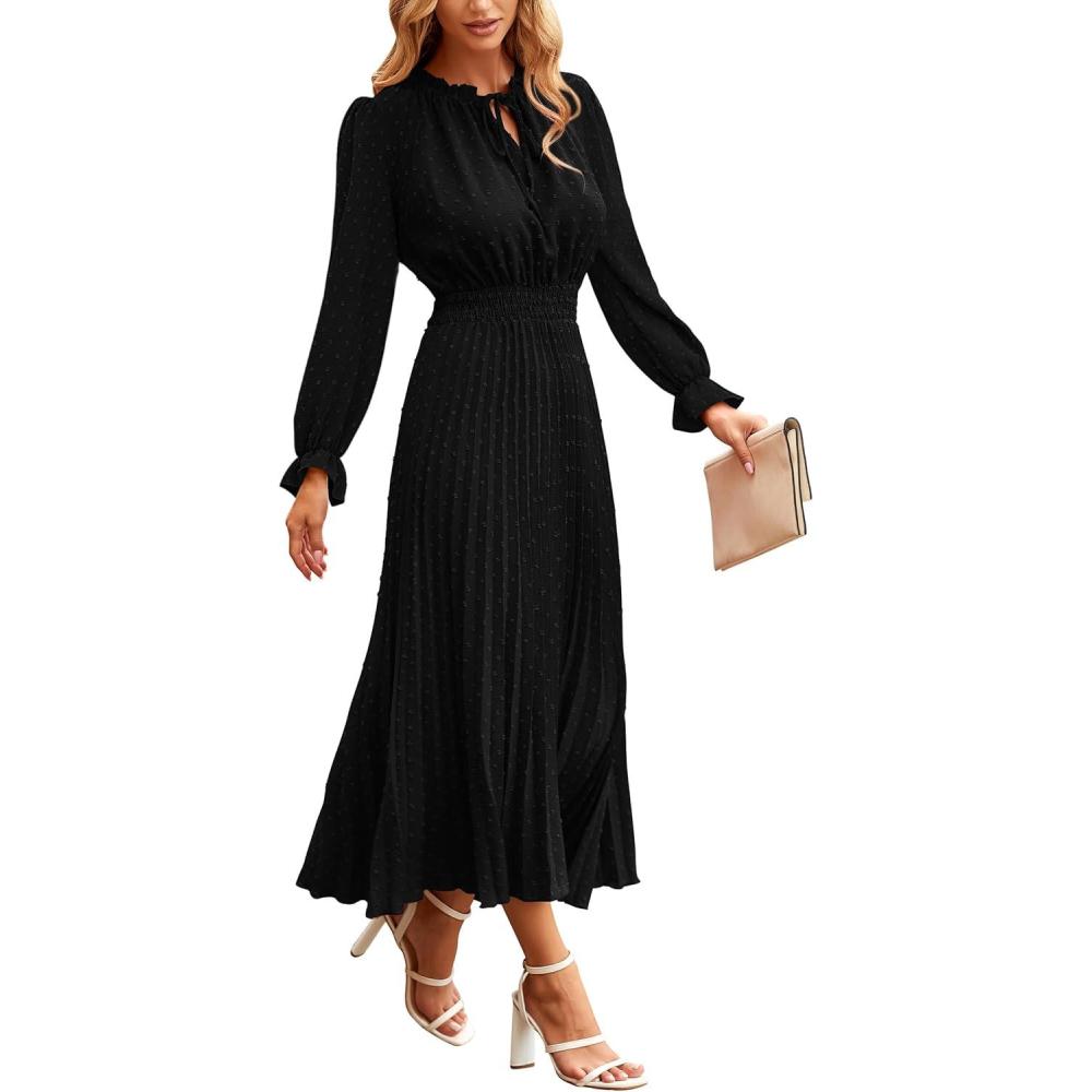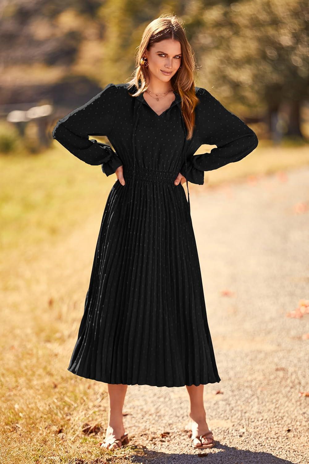 PRETTYGARDEN Women's 2025 Spring Fall Midi Dress Casual Long Sleeve V Neck Swiss Dot Pleated A Line Flowy Dresses(Black)
