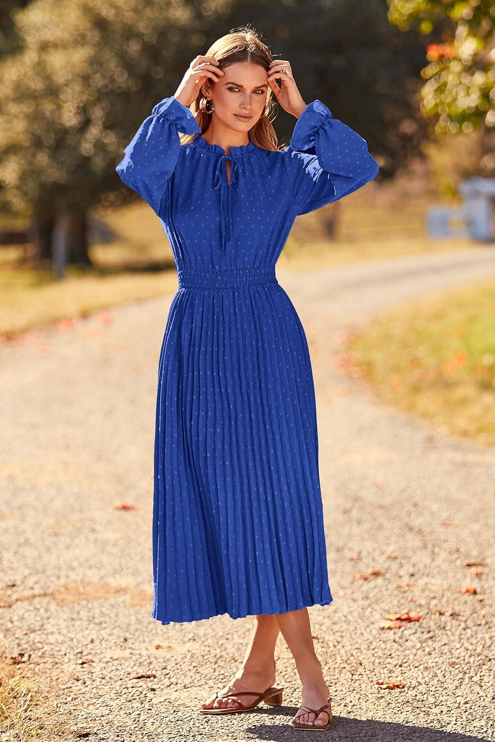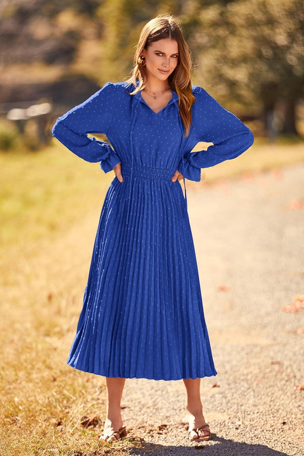 PRETTYGARDEN Women's 2025 Spring Fall Midi Dress Casual Long Sleeve V Neck Swiss Dot Pleated A Line Flowy Dresses(Blue)