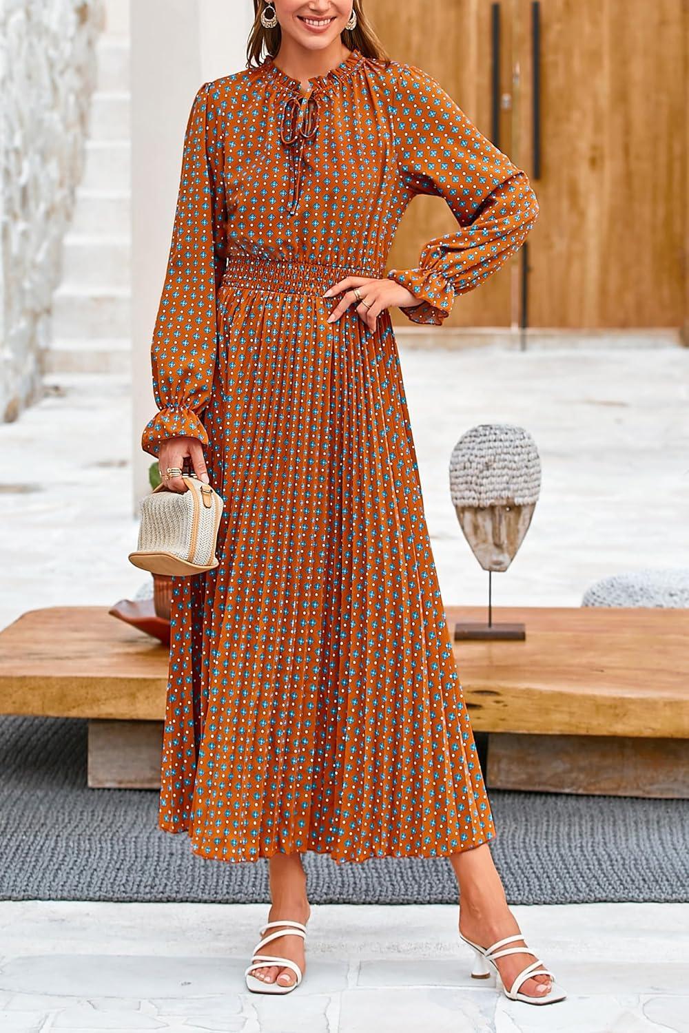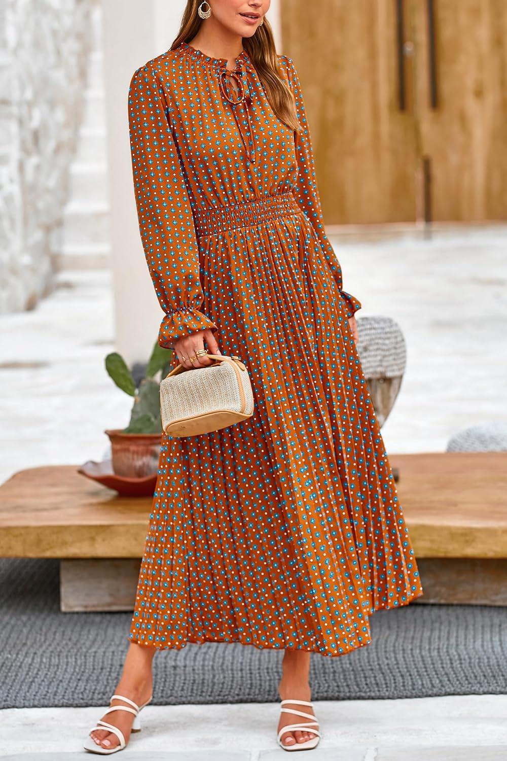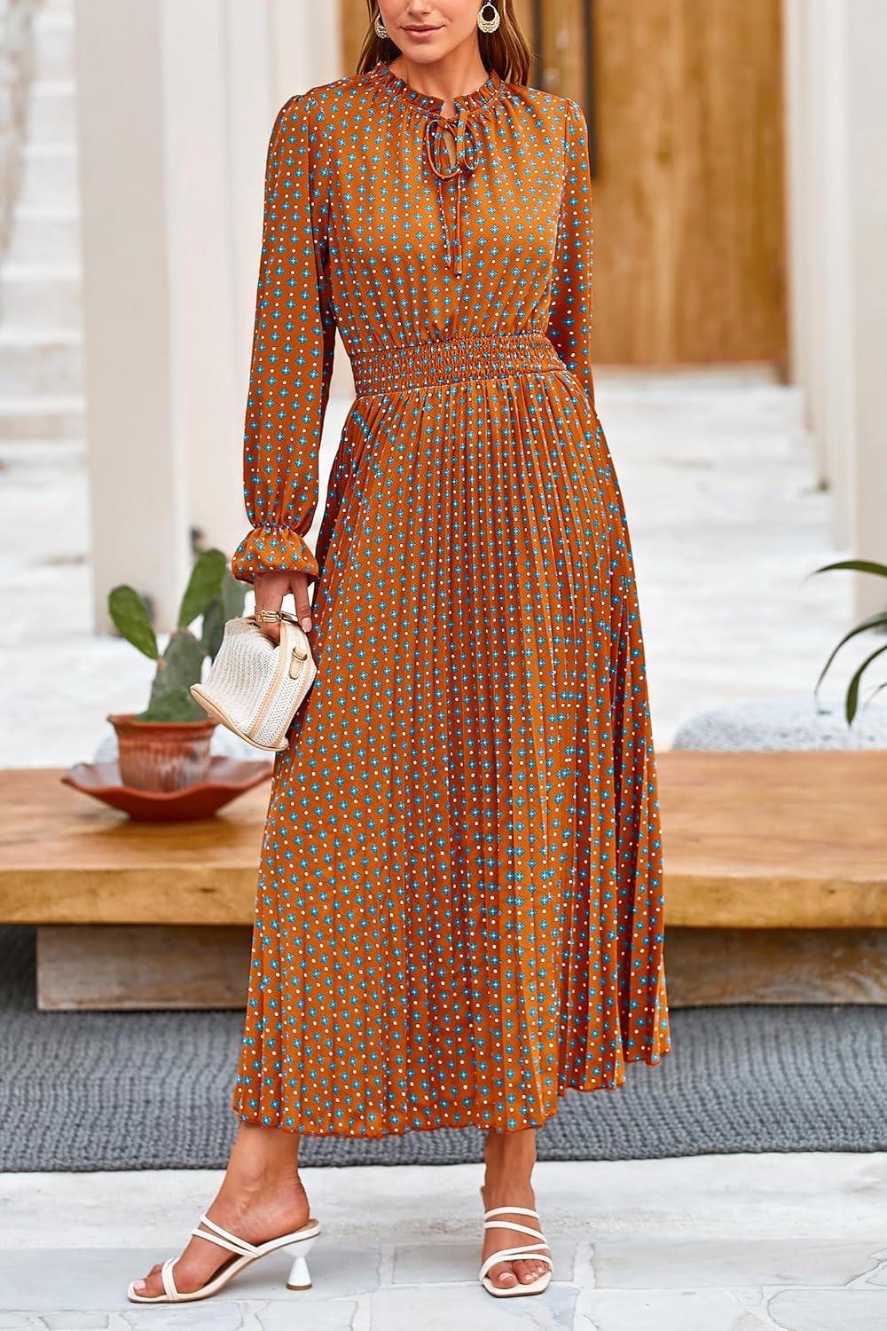 PRETTYGARDEN Women’s 2025 Spring Fall Midi Dress Casual Long Sleeve V Neck Swiss Dot Pleated A Line Flowy Dresses(Brown Leaves)