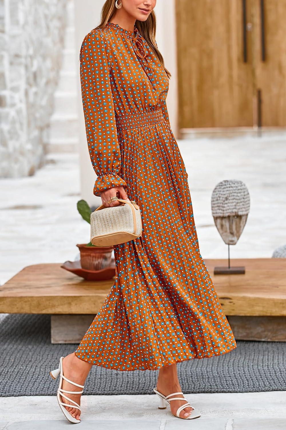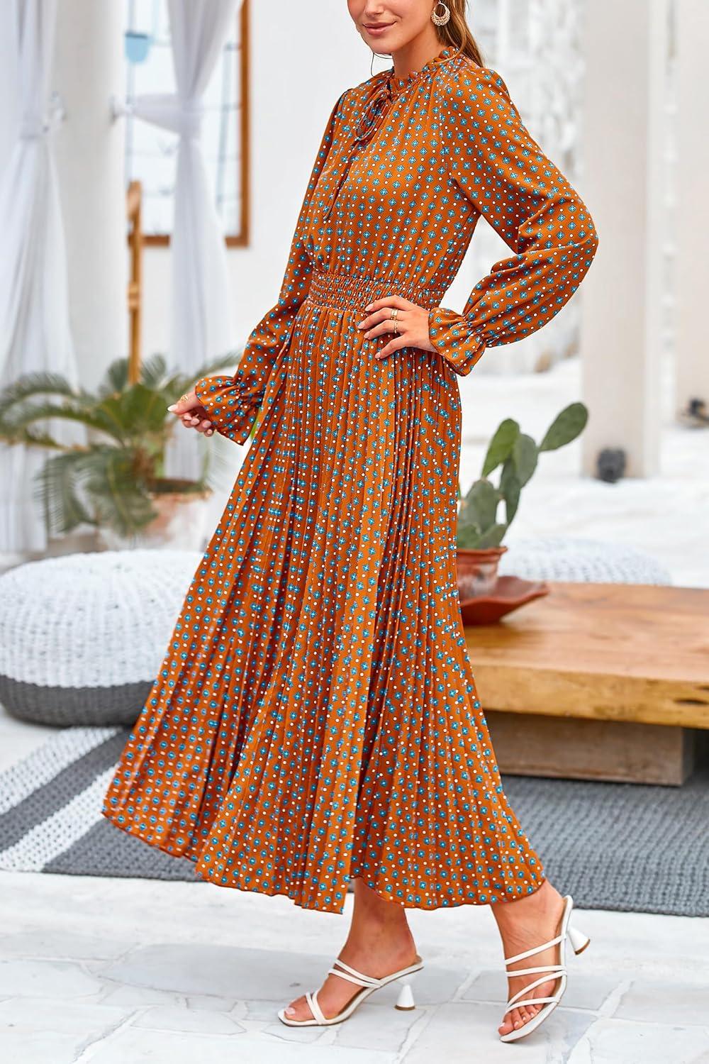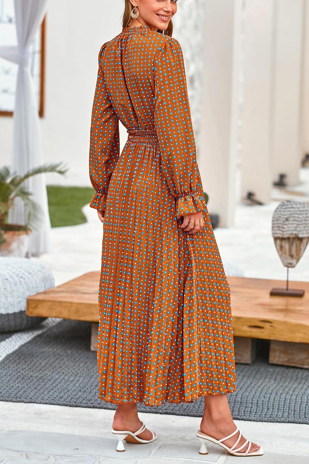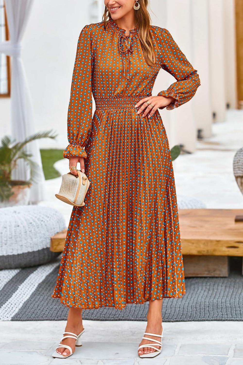 PRETTYGARDEN Women’s 2025 Spring Fall Midi Dress Casual Long Sleeve V Neck Swiss Dot Pleated A Line Flowy Dresses(Brown Leaves)