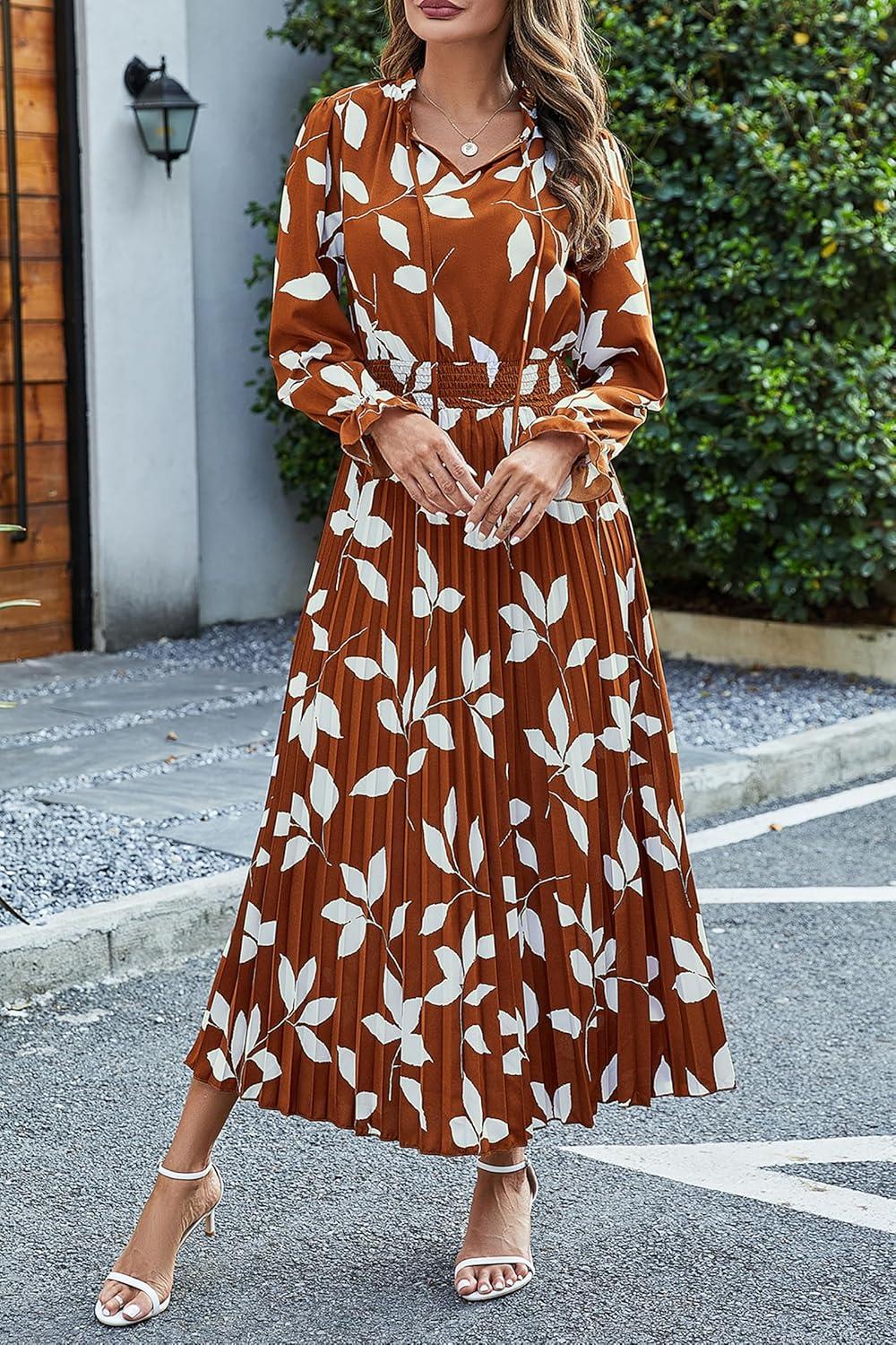 PRETTYGARDEN Women's 2025 Spring Fall Midi Dress Casual Long Sleeve V Neck Swiss Dot Pleated A Line Flowy Dresses(Brown Leaves)