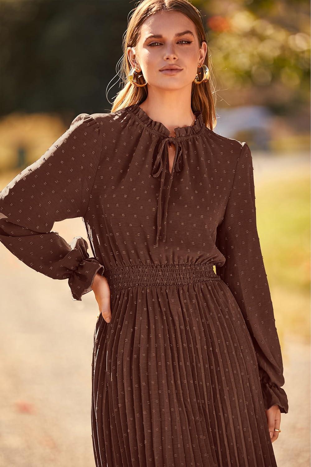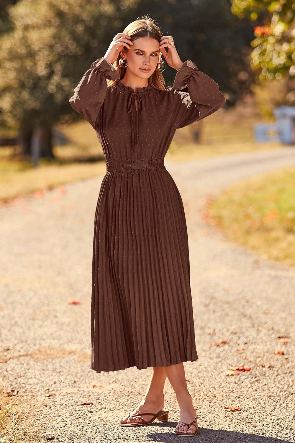 PRETTYGARDEN Women's 2025 Spring Fall Midi Dress Casual Long Sleeve V Neck Swiss Dot Pleated A Line Flowy Dresses(Dark Coffee)
