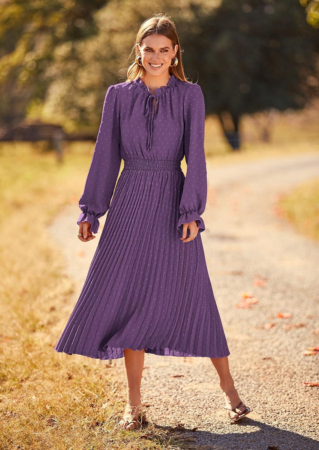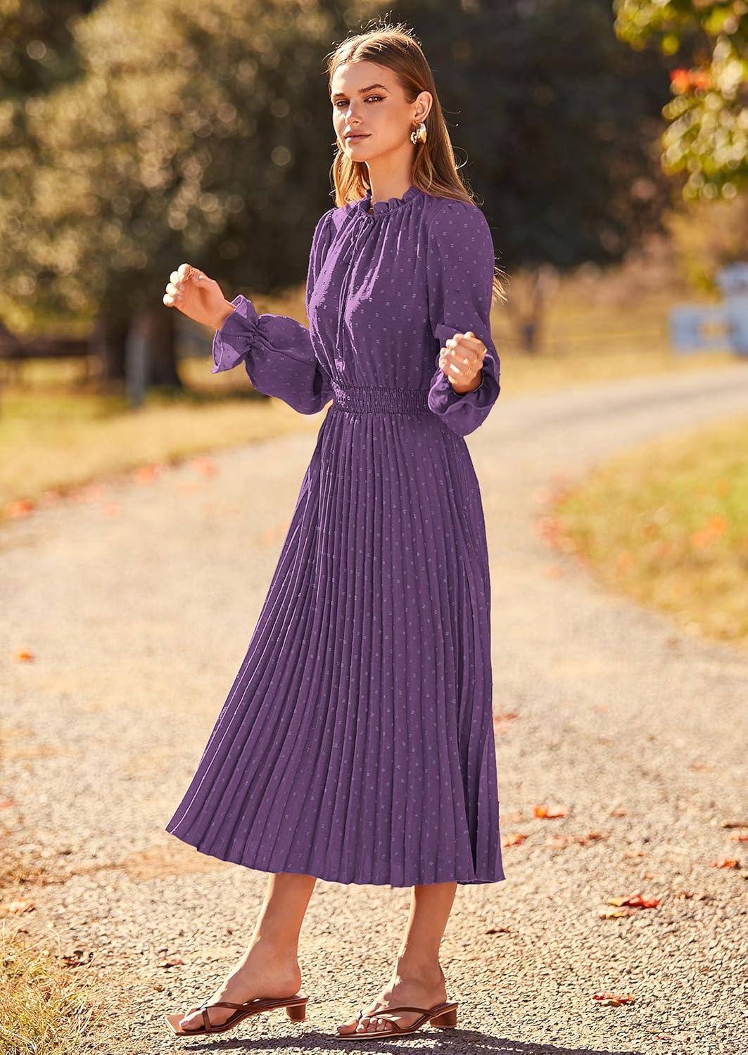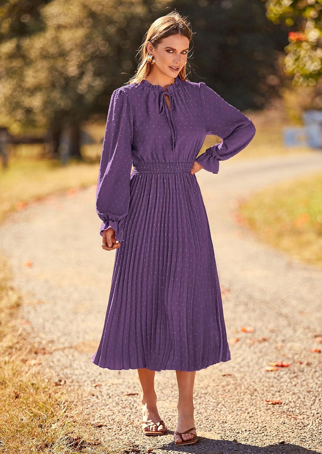 PRETTYGARDEN Women's 2025 Spring Fall Midi Dress Casual Long Sleeve V Neck Swiss Dot Pleated A Line Flowy Dresses(Dark Purple)