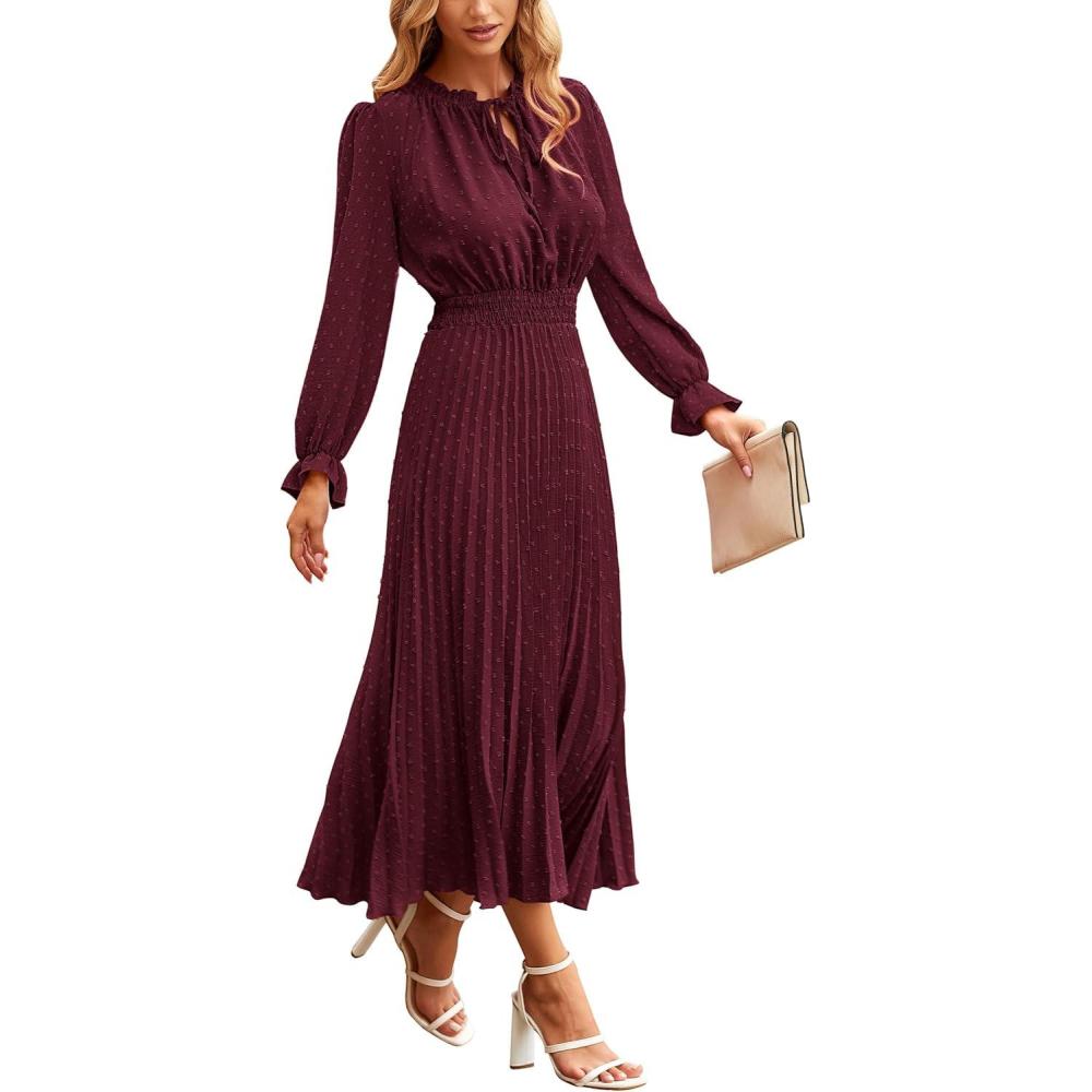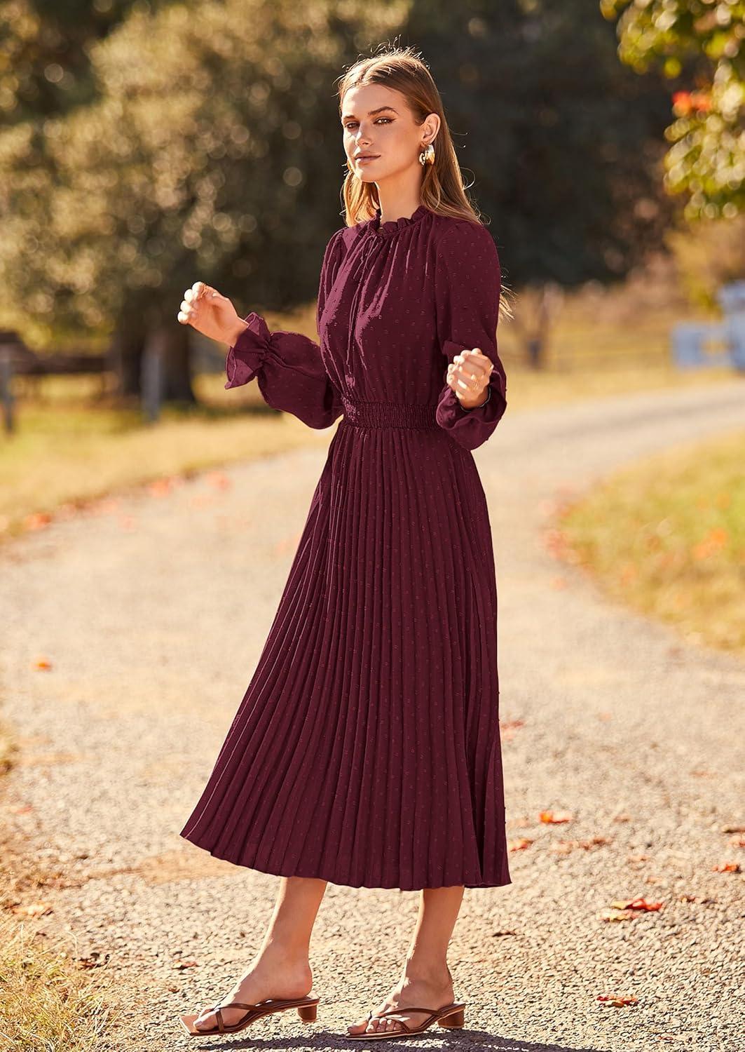 PRETTYGARDEN Women's 2025 Spring Fall Midi Dress Casual Long Sleeve V Neck Swiss Dot Pleated A Line Flowy Dresses(Dark Wine Red)