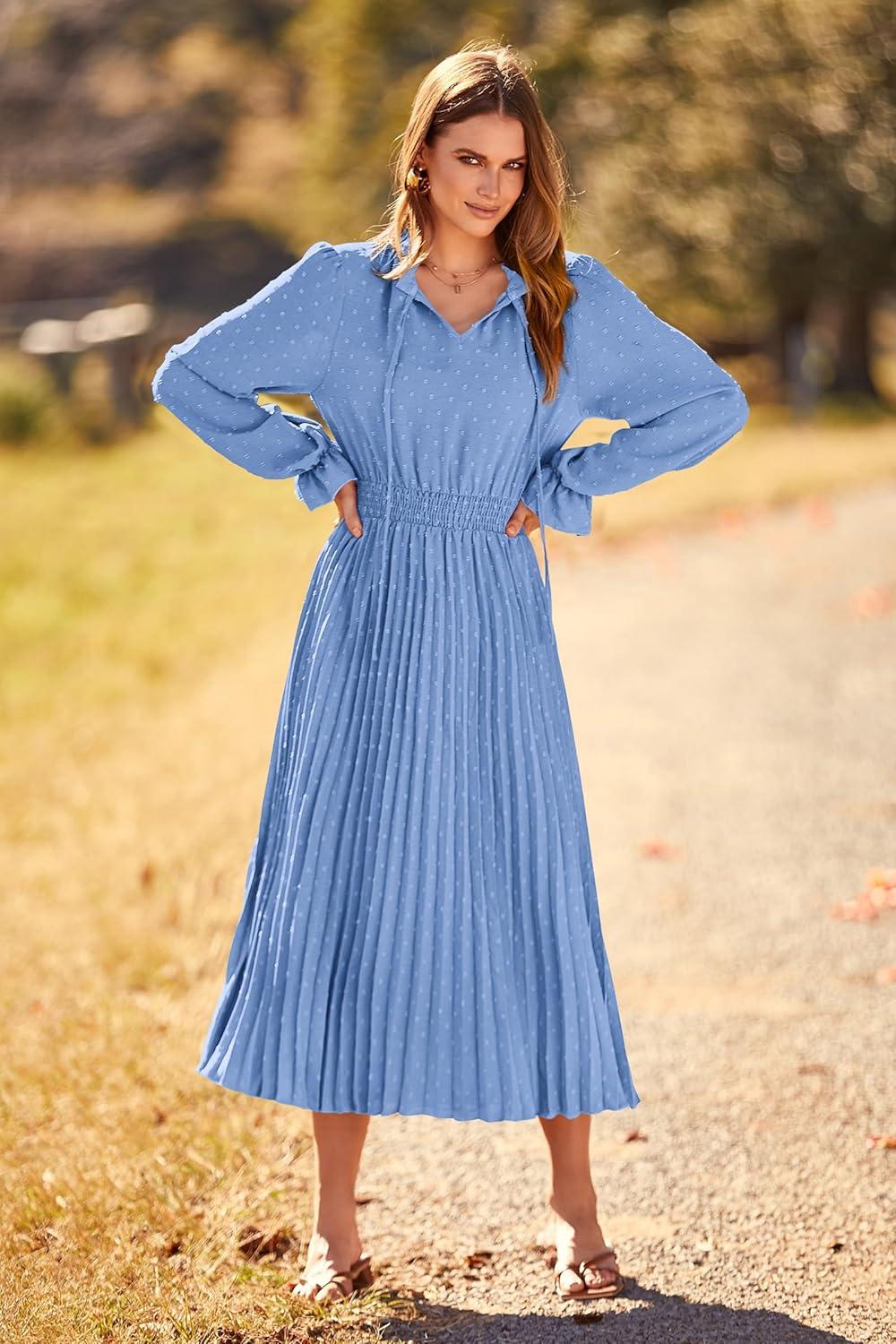 PRETTYGARDEN Women's 2025 Spring Fall Midi Dress Casual Long Sleeve V Neck Swiss Dot Pleated A Line Flowy Dresses(Light Blue)