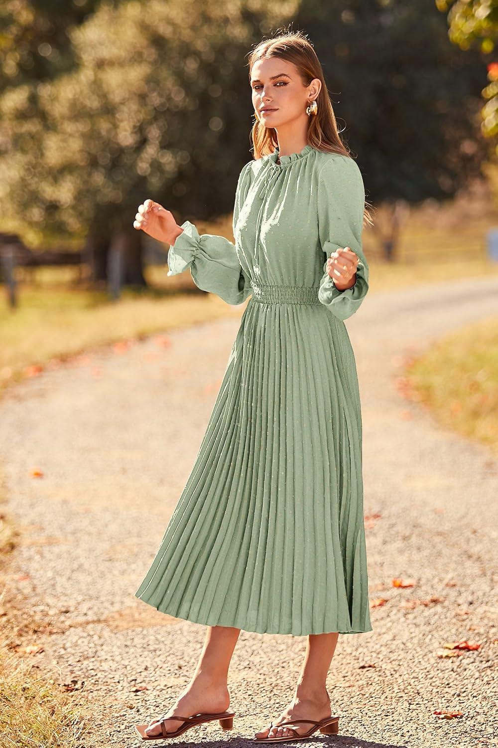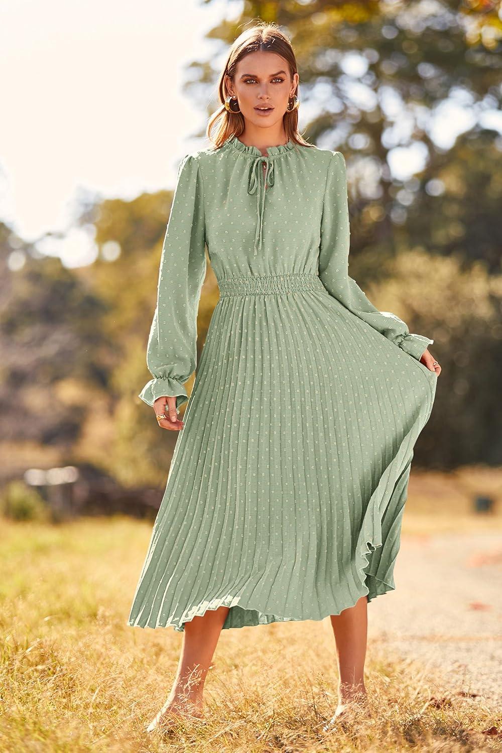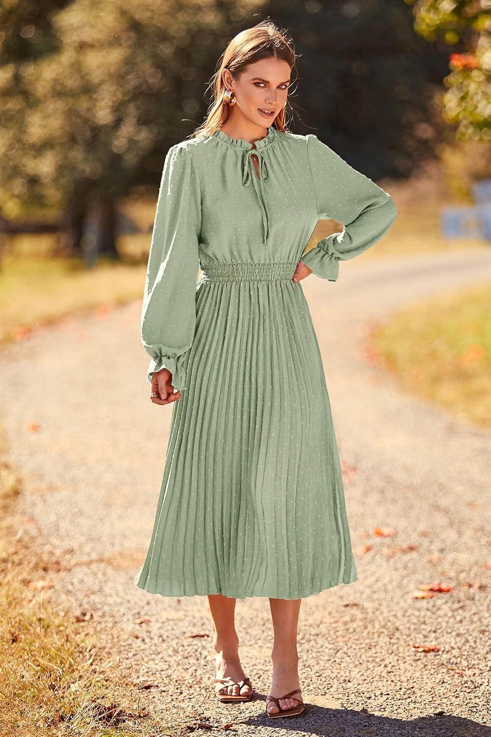 PRETTYGARDEN Women's 2025 Spring Fall Midi Dress Casual Long Sleeve V Neck Swiss Dot Pleated A Line Flowy Dresses(Light Green)