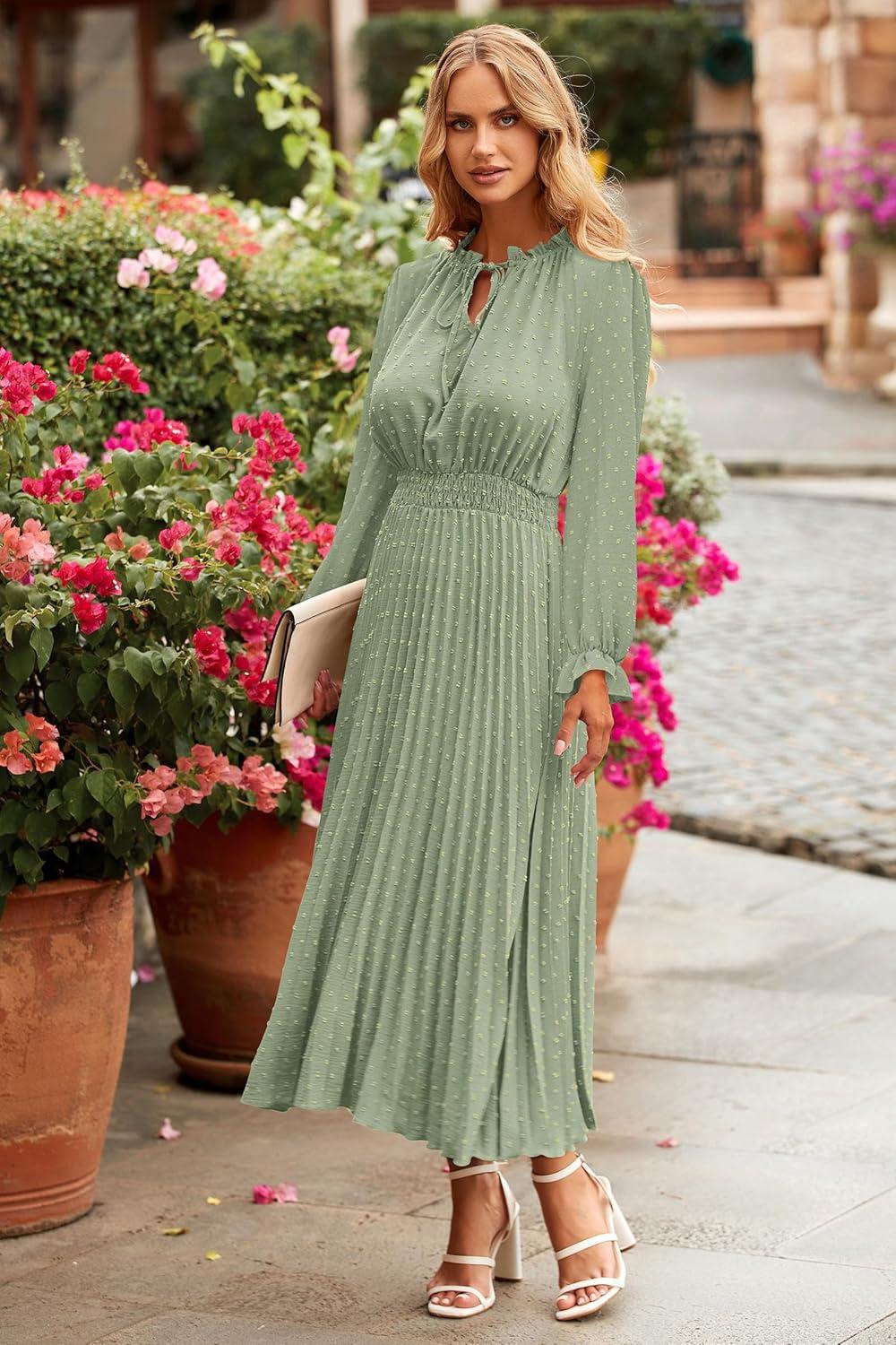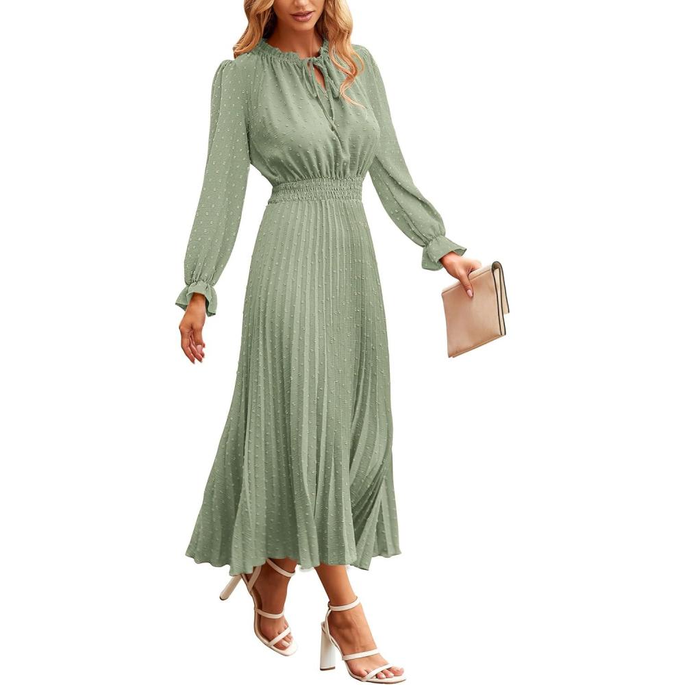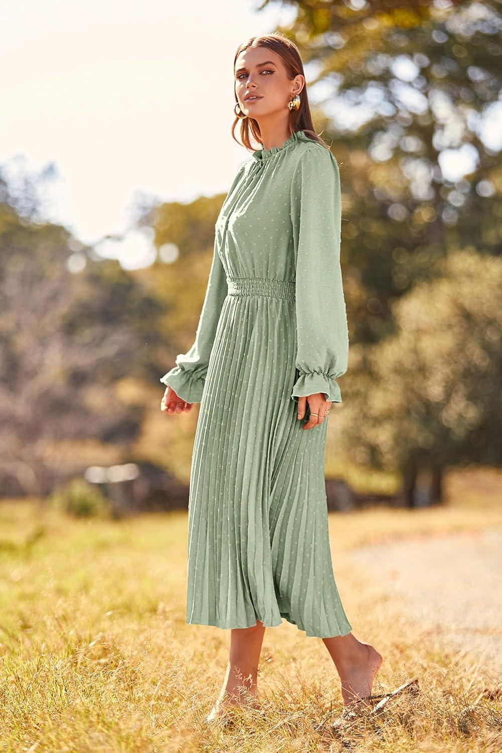 PRETTYGARDEN Women's 2025 Spring Fall Midi Dress Casual Long Sleeve V Neck Swiss Dot Pleated A Line Flowy Dresses(Light Green)