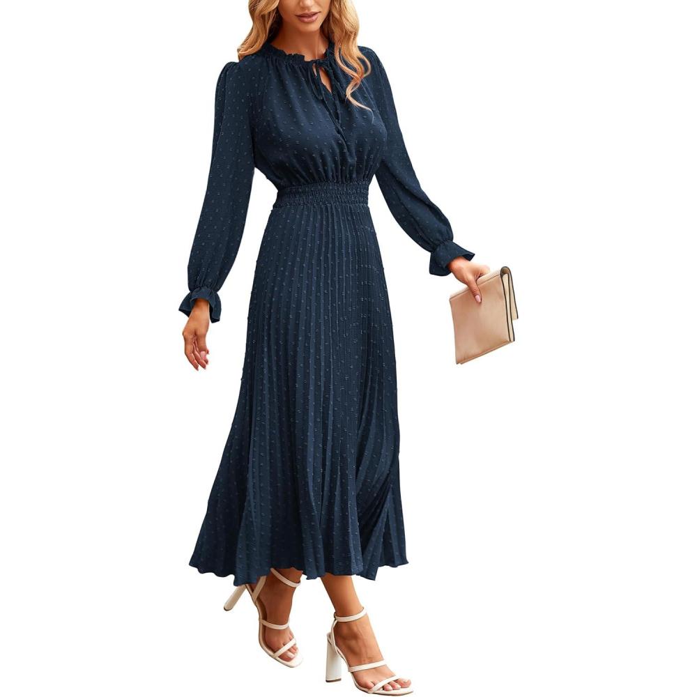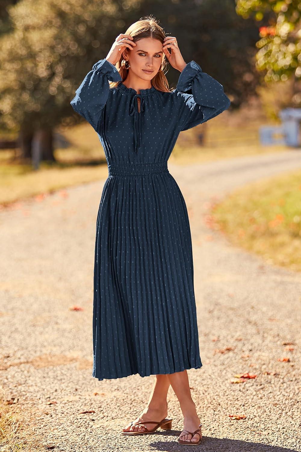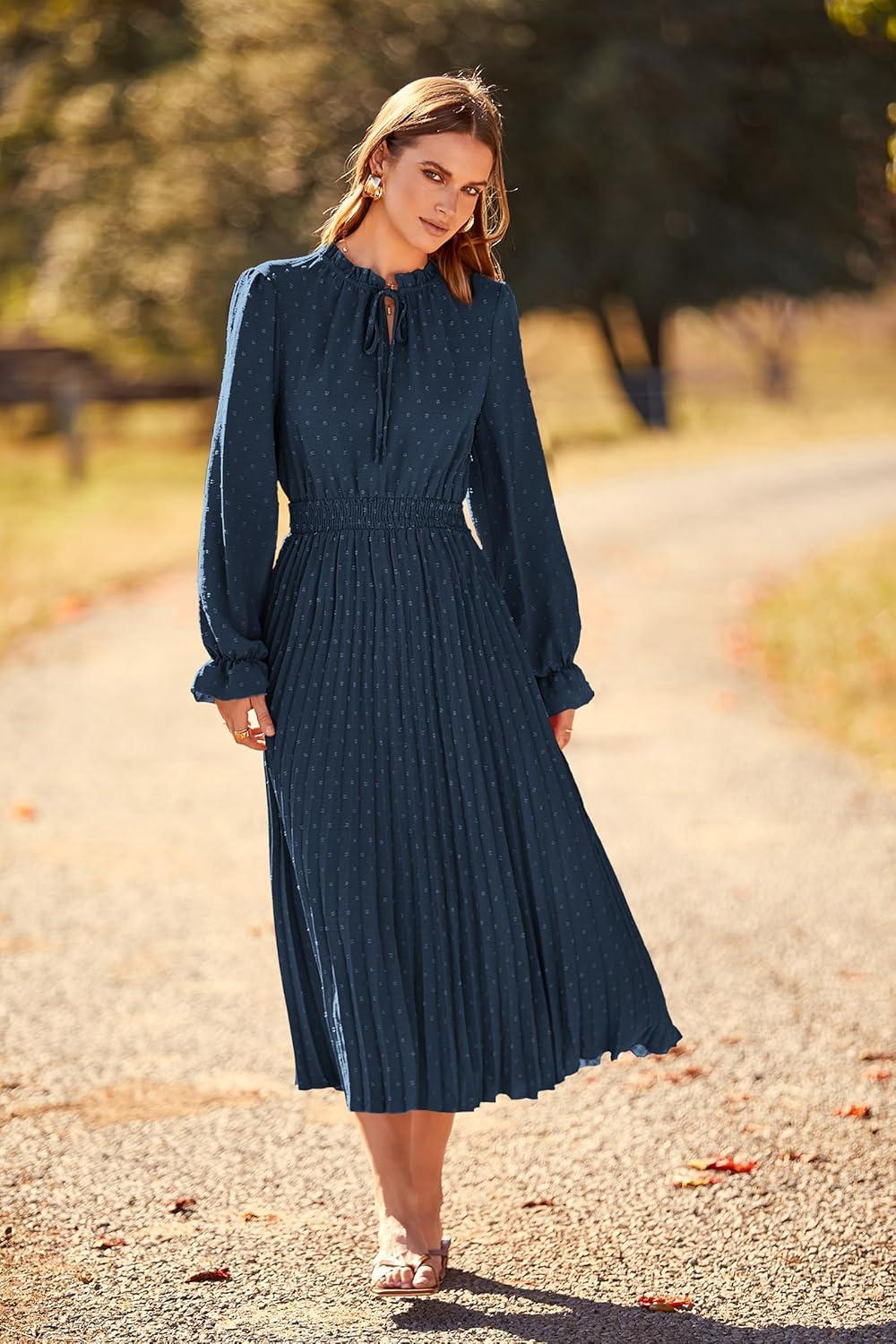 PRETTYGARDEN Women's 2025 Spring Fall Midi Dress Casual Long Sleeve V Neck Swiss Dot Pleated A Line Flowy Dresses(Navy)