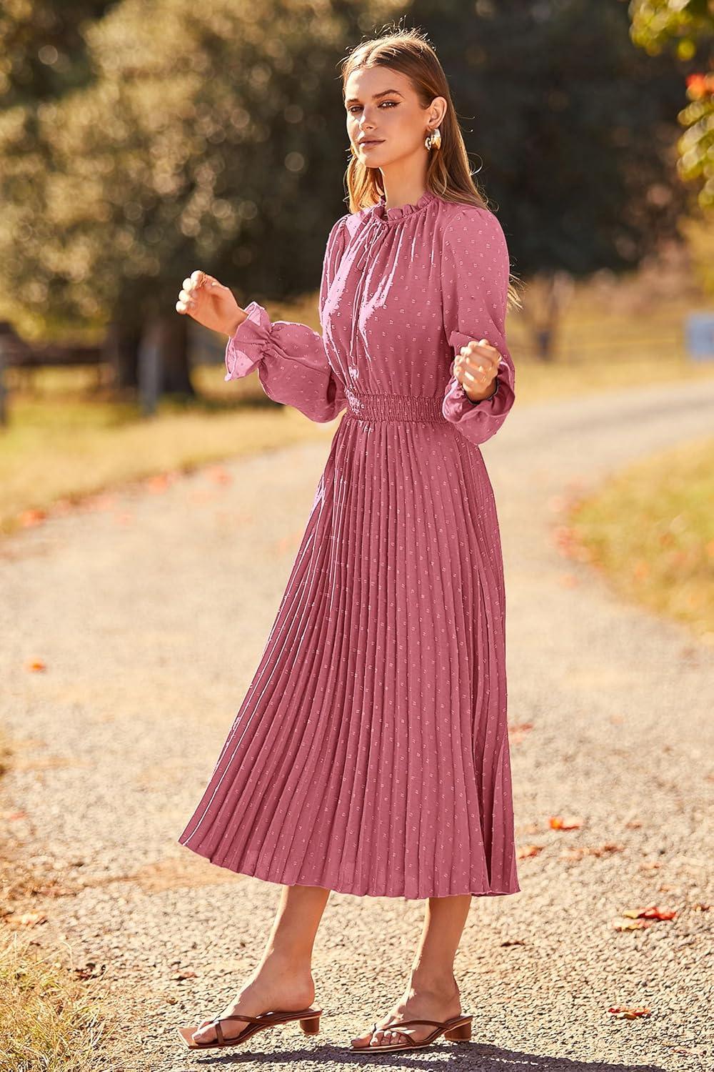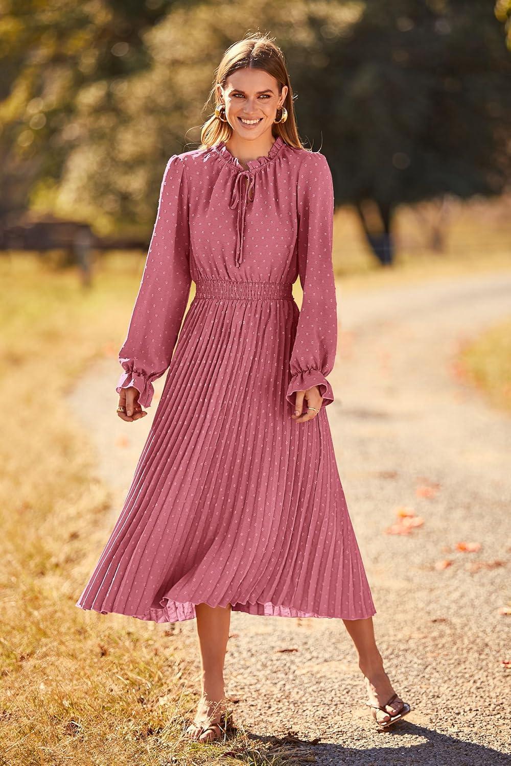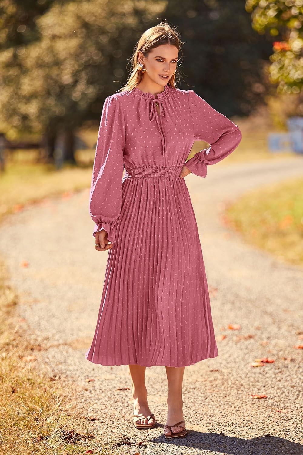 PRETTYGARDEN Women's 2025 Spring Fall Midi Dress Casual Long Sleeve V Neck Swiss Dot Pleated A Line Flowy Dresses(Pink)