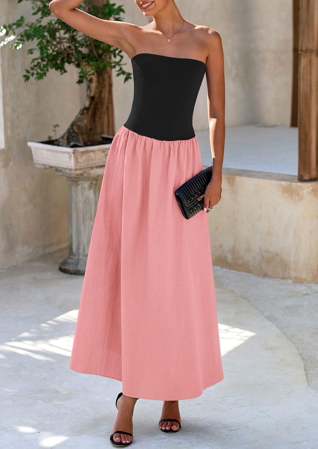 PRETTYGARDEN Women's 2025 Spring Strapless Maxi Dresses Patchwork Long Flowy Pockets Elegant Going Out Summer Tube Top Dress(Pink)