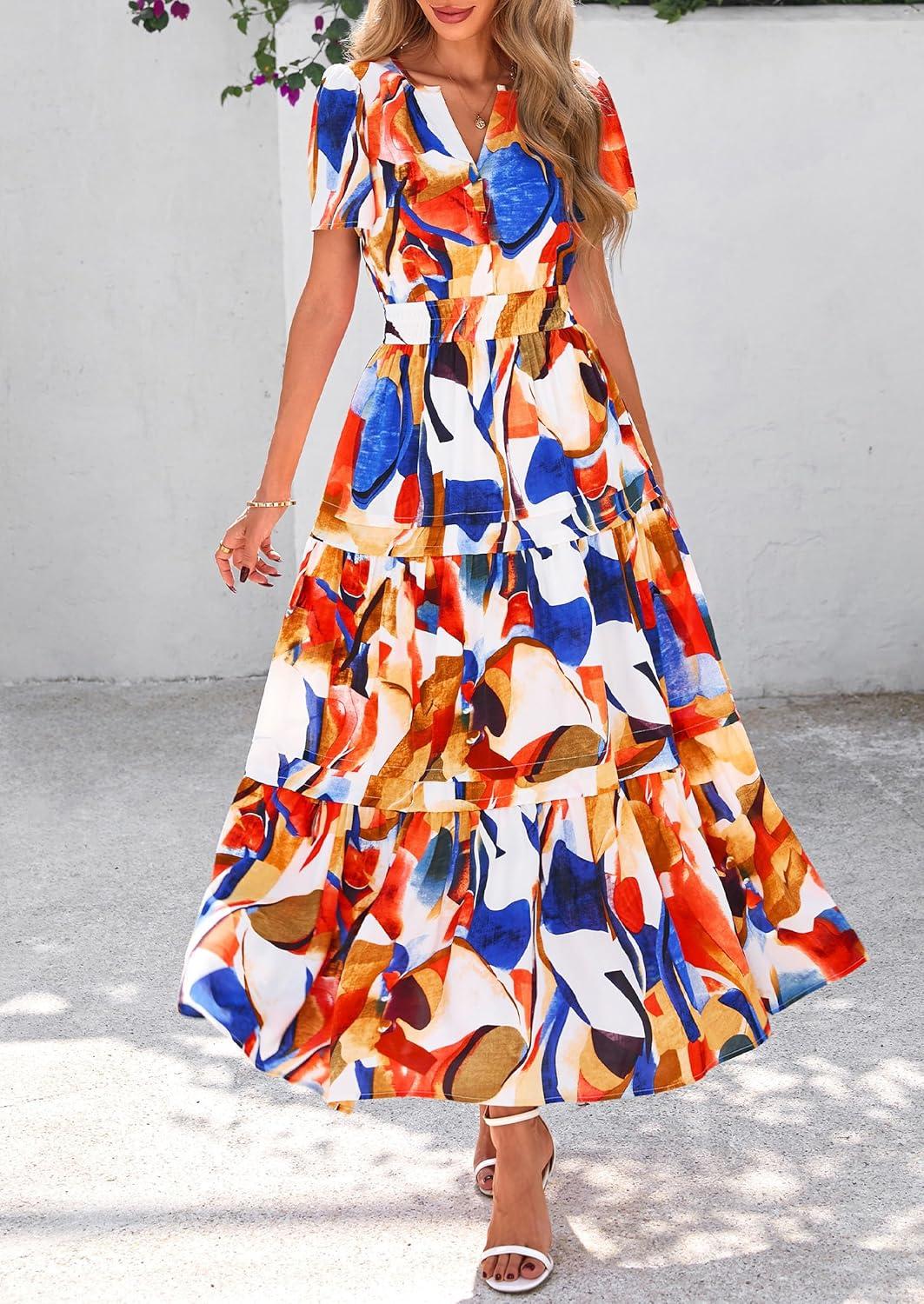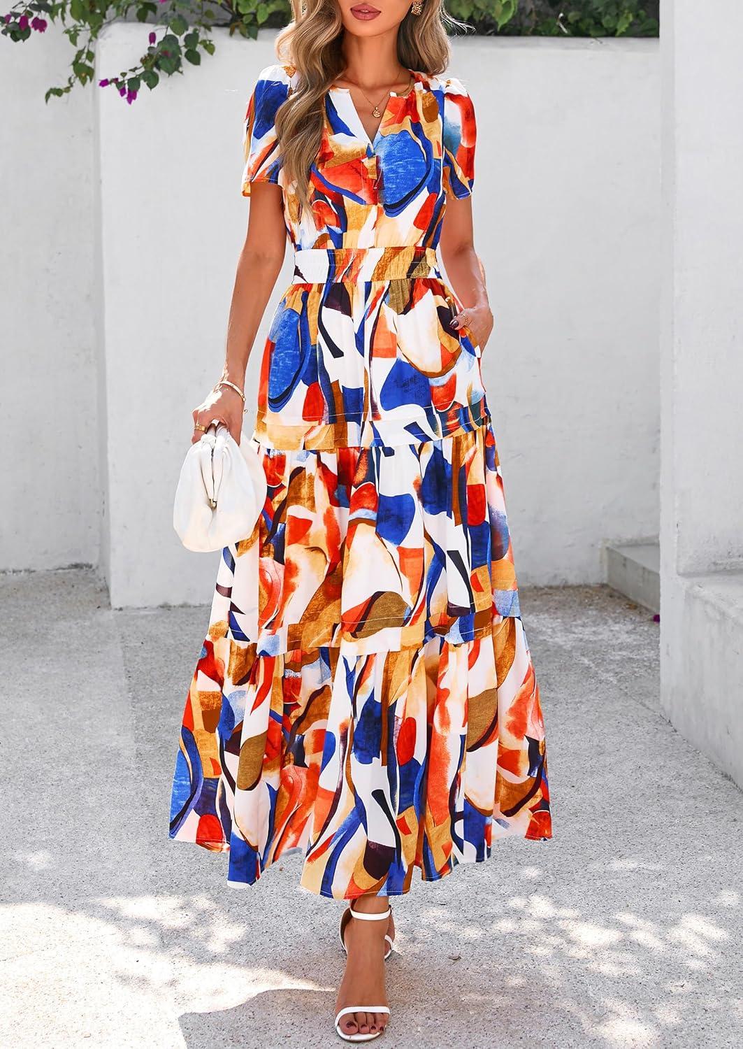 PRETTYGARDEN Women's 2025 Summer Boho Maxi Dresses Floral Short Sleeve V Neck A Line Tiered Flowy Long Beach Vacation Dress(Blue Watercolour)