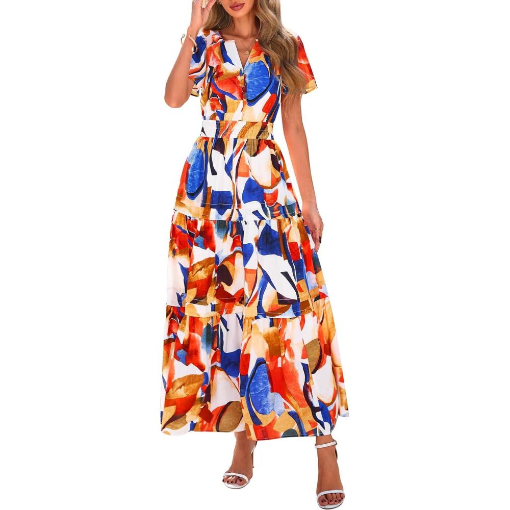 PRETTYGARDEN Women’s 2025 Summer Boho Maxi Dresses Floral Short Sleeve V Neck A Line Tiered Flowy Long Beach Vacation Dress(Blue Watercolour)