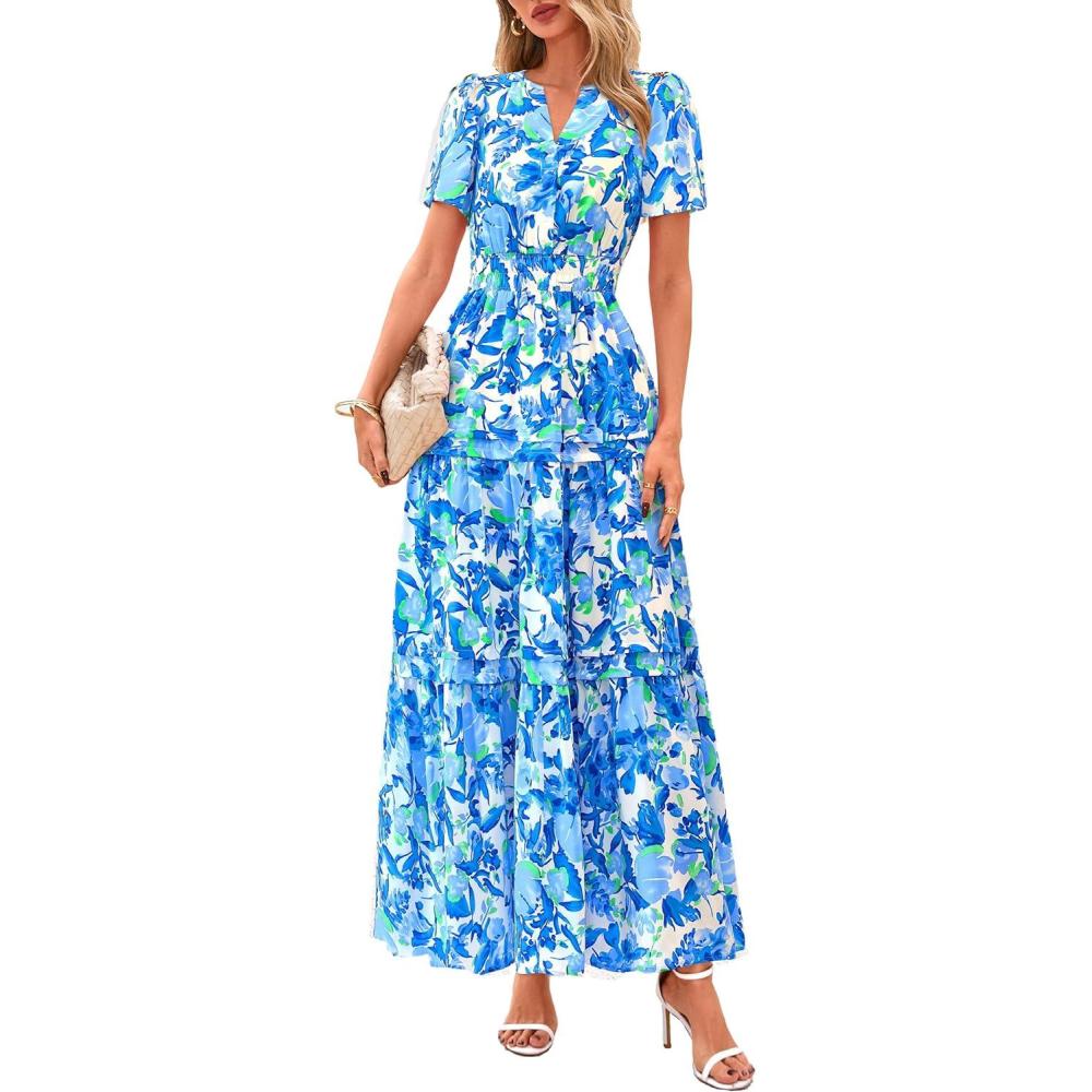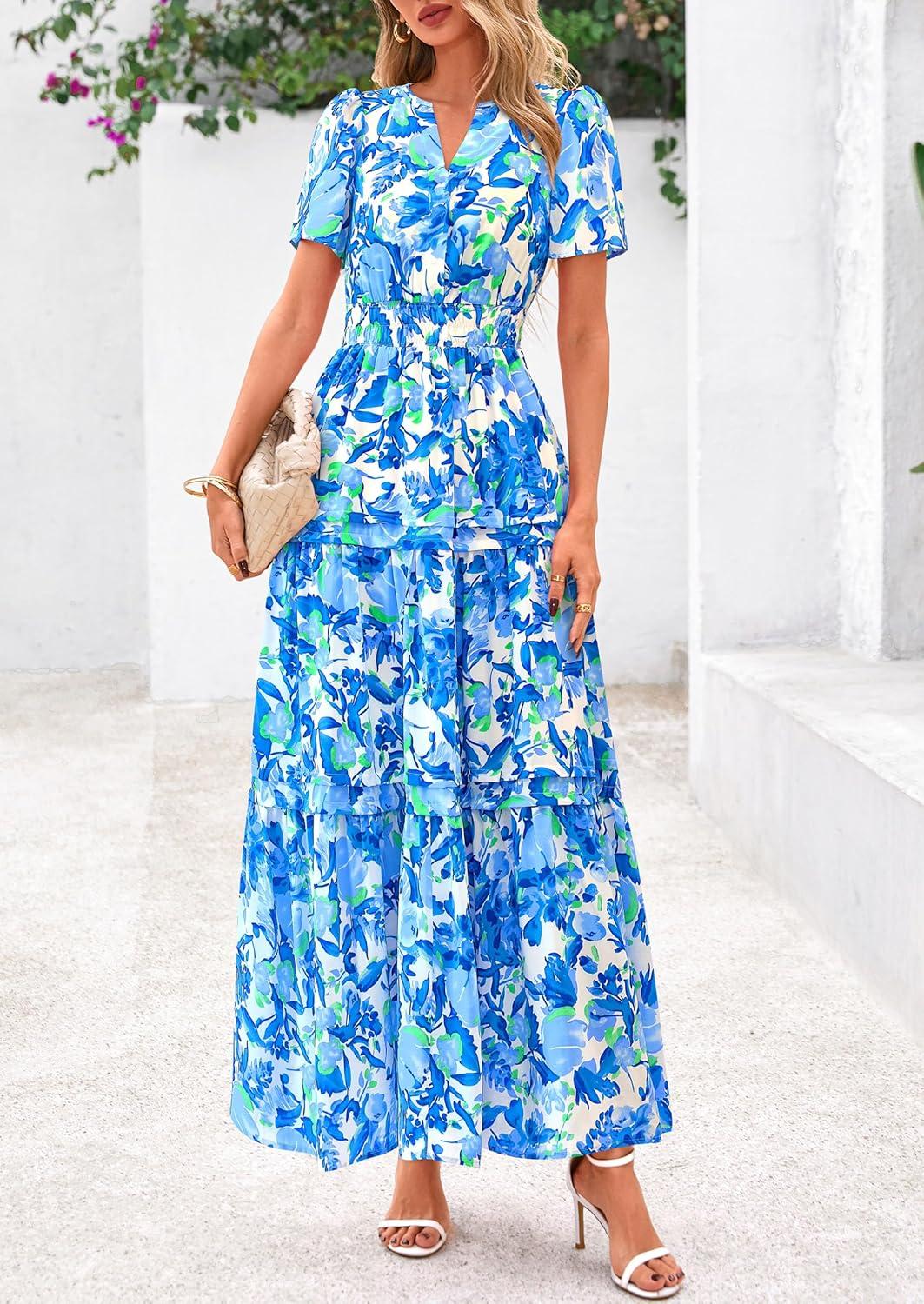 PRETTYGARDEN Women’s 2025 Summer Boho Maxi Dresses Floral Short Sleeve V Neck A Line Tiered Flowy Long Beach Vacation Dress(Floral Blue)