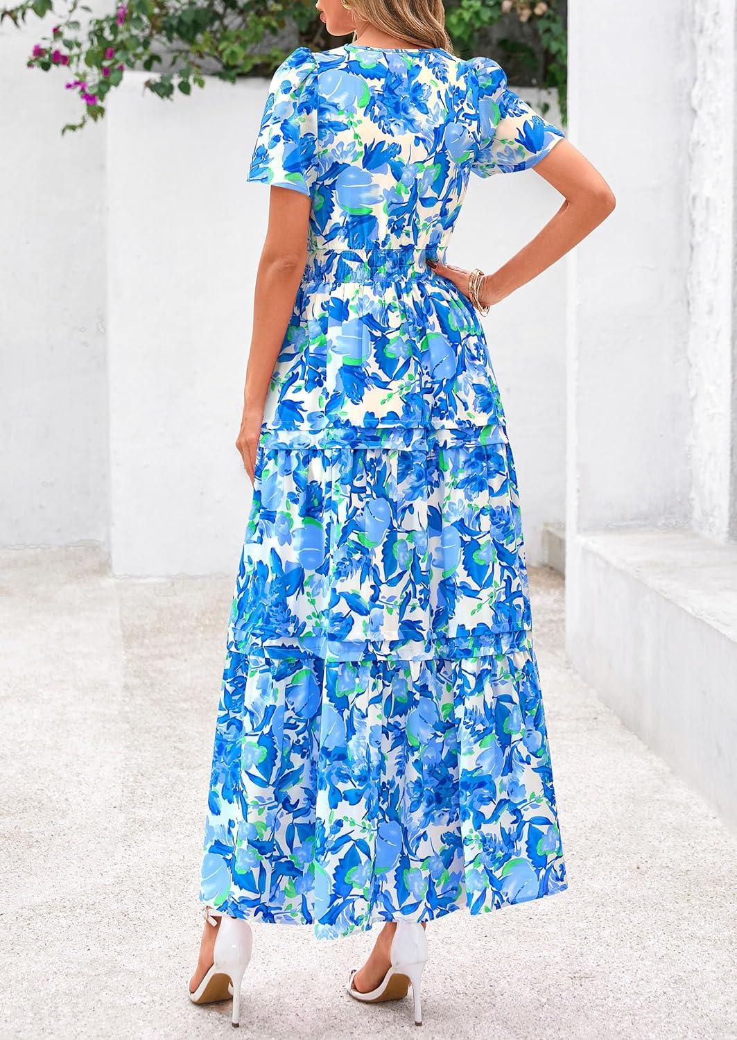 PRETTYGARDEN Women's 2025 Summer Boho Maxi Dresses Floral Short Sleeve V Neck A Line Tiered Flowy Long Beach Vacation Dress(Floral Blue)