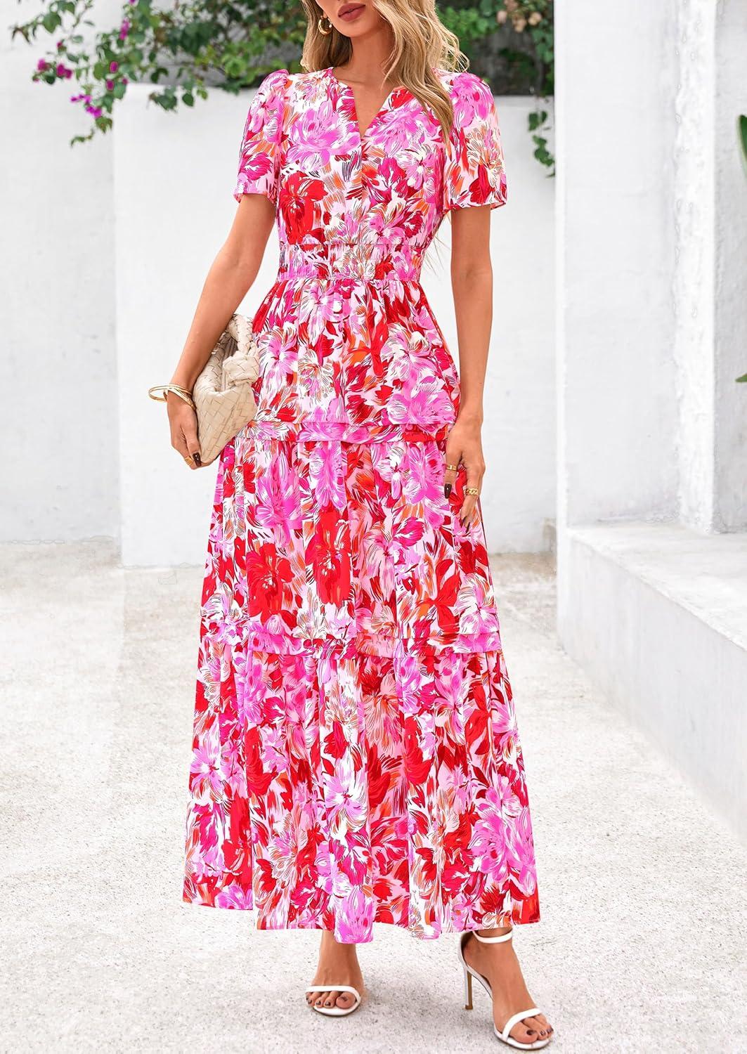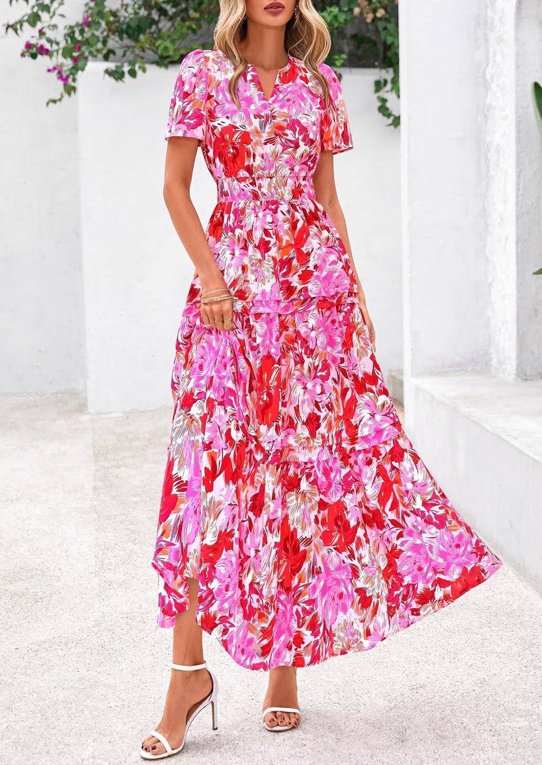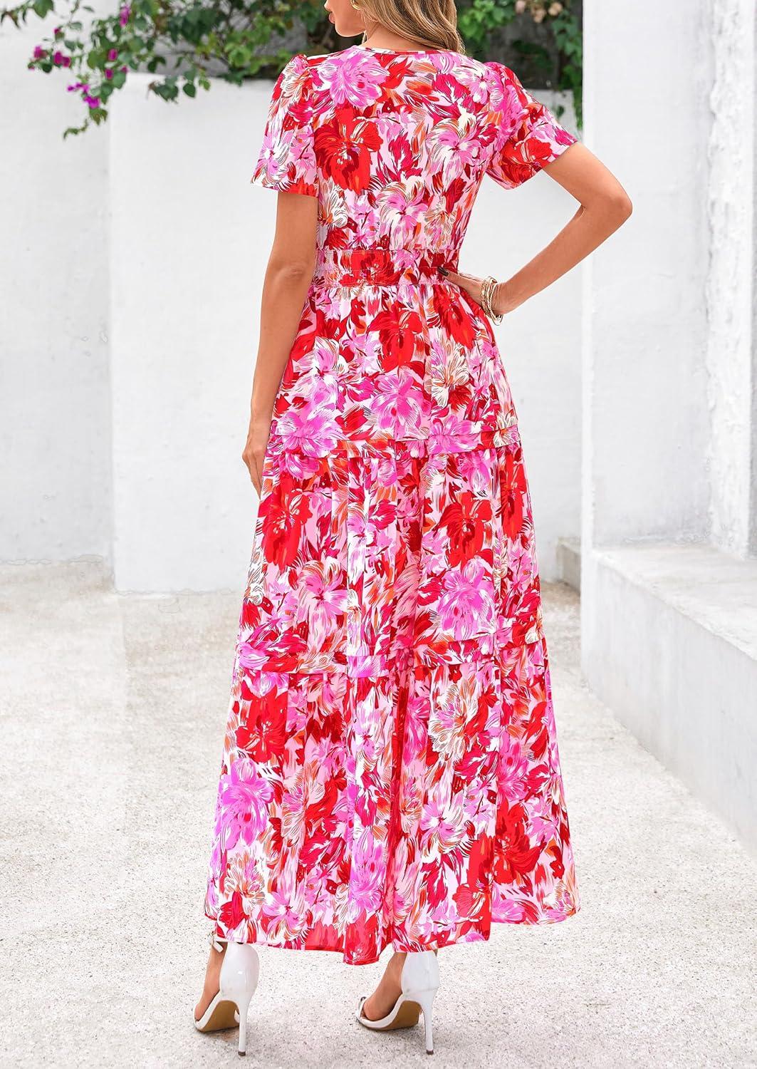 PRETTYGARDEN Women’s 2025 Summer Boho Maxi Dresses Floral Short Sleeve V Neck A Line Tiered Flowy Long Beach Vacation Dress(Floral Rose Red)