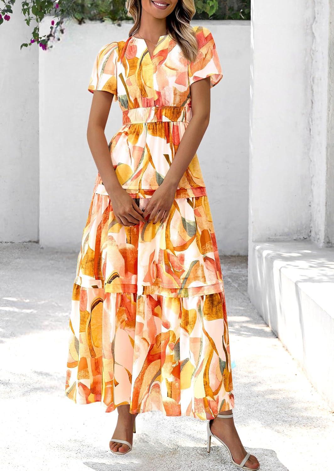 PRETTYGARDEN Women’s 2025 Summer Boho Maxi Dresses Floral Short Sleeve V Neck A Line Tiered Flowy Long Beach Vacation Dress(Red)
