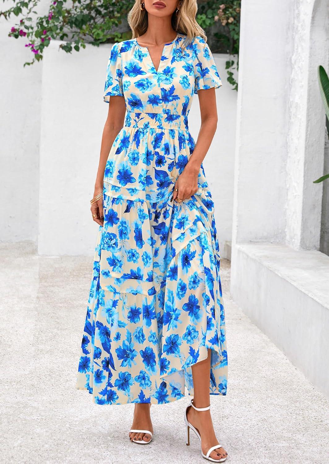 PRETTYGARDEN Women's 2025 Summer Boho Maxi Dresses Floral Short Sleeve V Neck A Line Tiered Flowy Long Beach Vacation Dress(White Blue Floral)