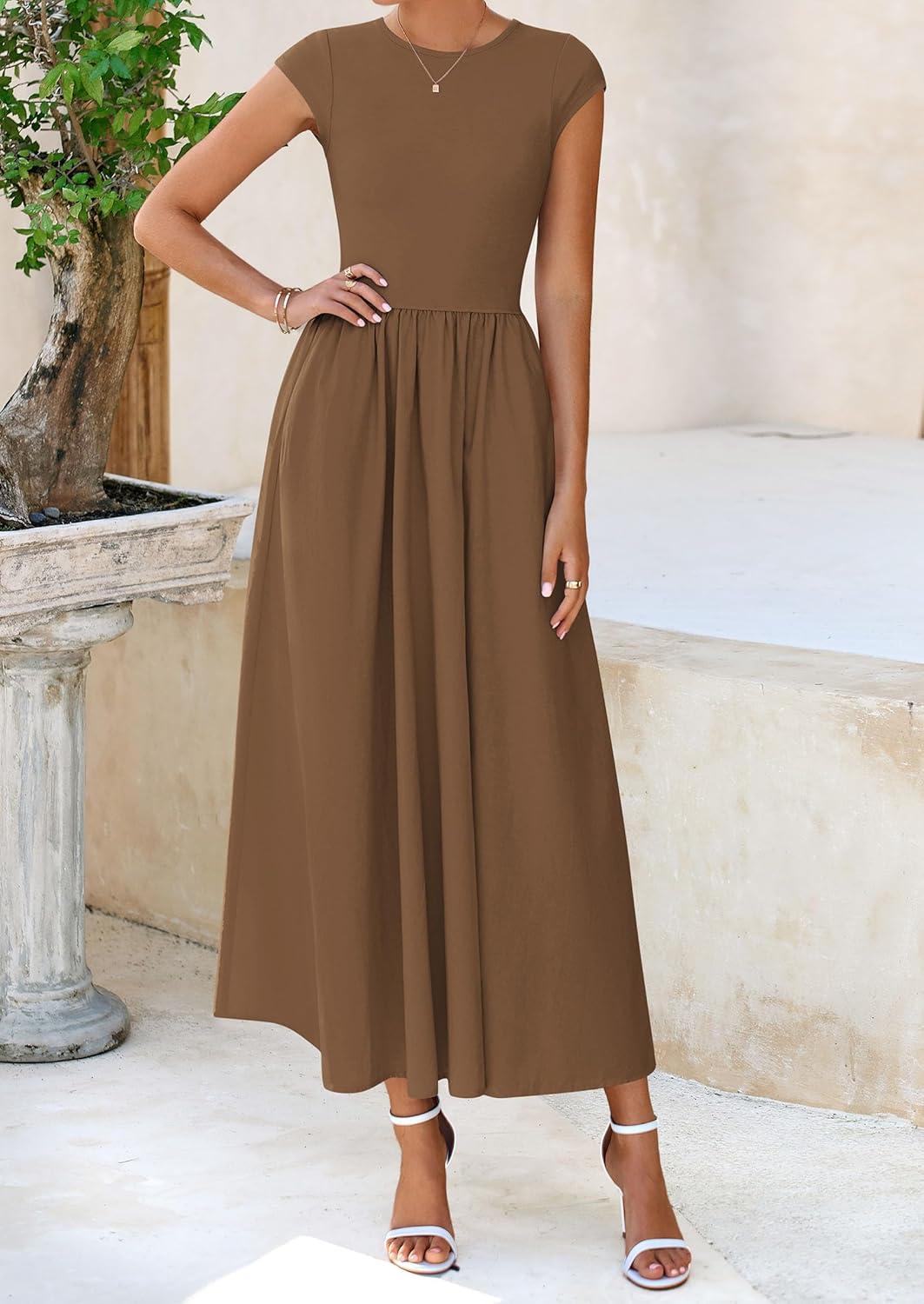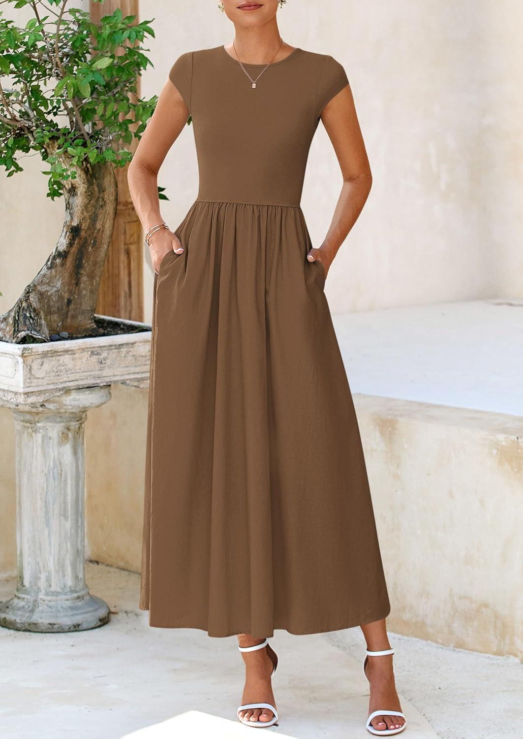 PRETTYGARDEN Women’s 2025 Summer Casual Long Dresses Cap Sleeve Patchwork A Line Flowy Modest Elegant Homecoming Maxi Dress(Dark Coffee)