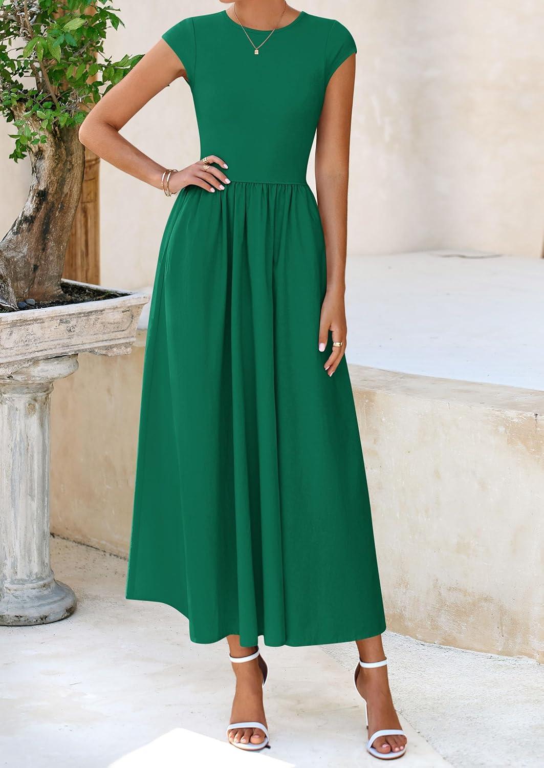 PRETTYGARDEN Women's 2025 Summer Casual Long Dresses Cap Sleeve Patchwork A Line Flowy Modest Elegant Homecoming Maxi Dress(Dark Green)
