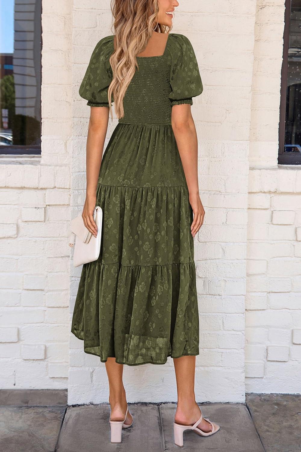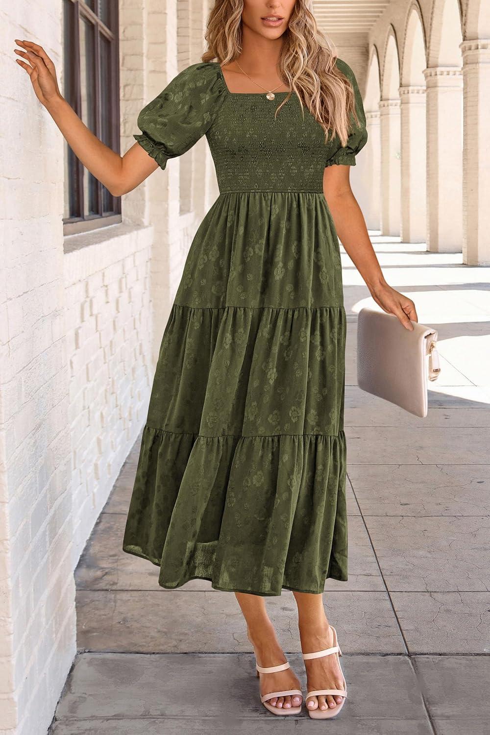 PRETTYGARDEN Women's 2025 Summer Casual Midi Dresses Square Neck Short Sleeve Smocked A Line Floral Flowy Elegant Boho Dress(Army Green)