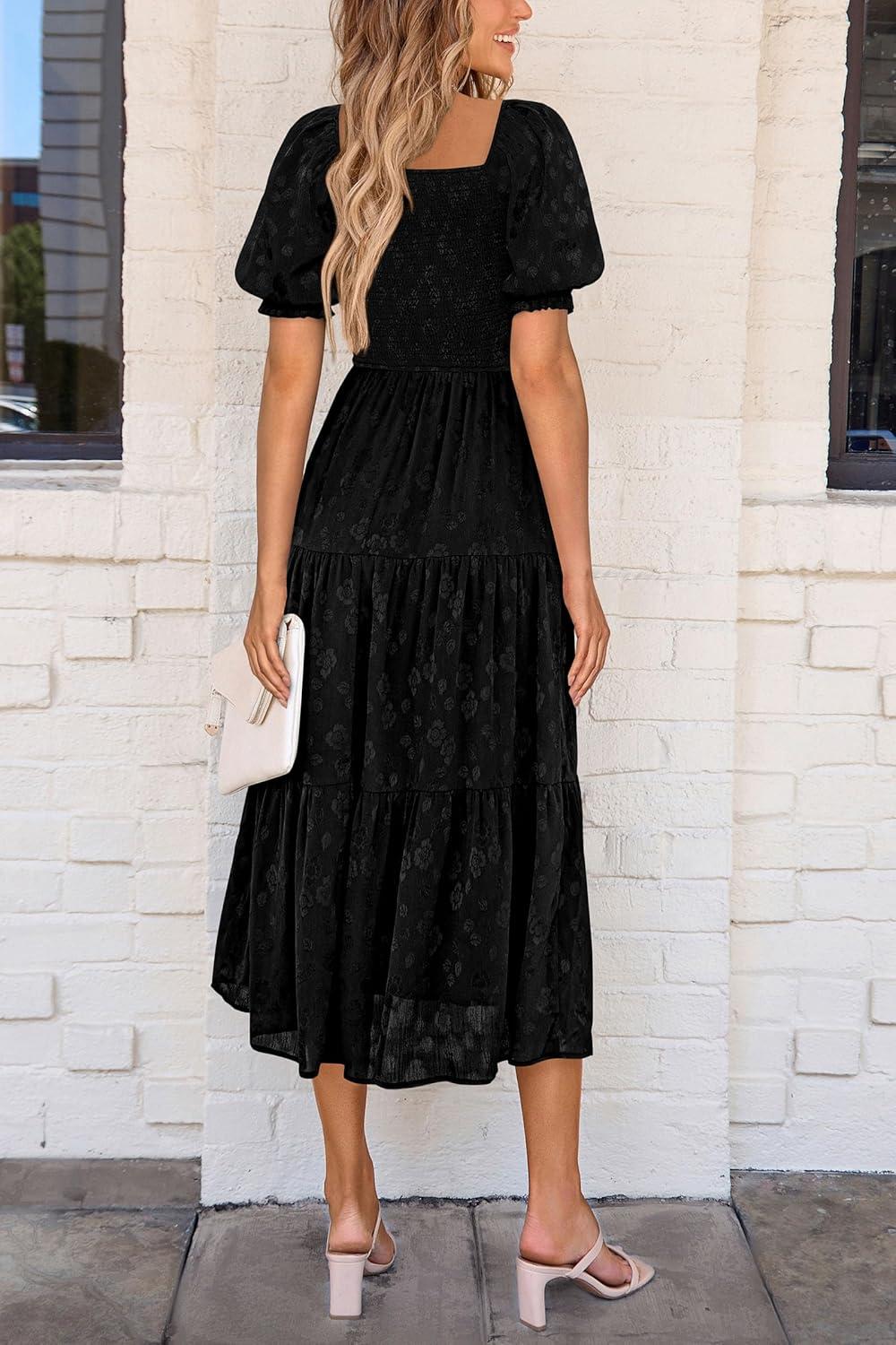 PRETTYGARDEN Women's 2025 Summer Casual Midi Dresses Square Neck Short Sleeve Smocked A Line Floral Flowy Elegant Boho Dress(Black)