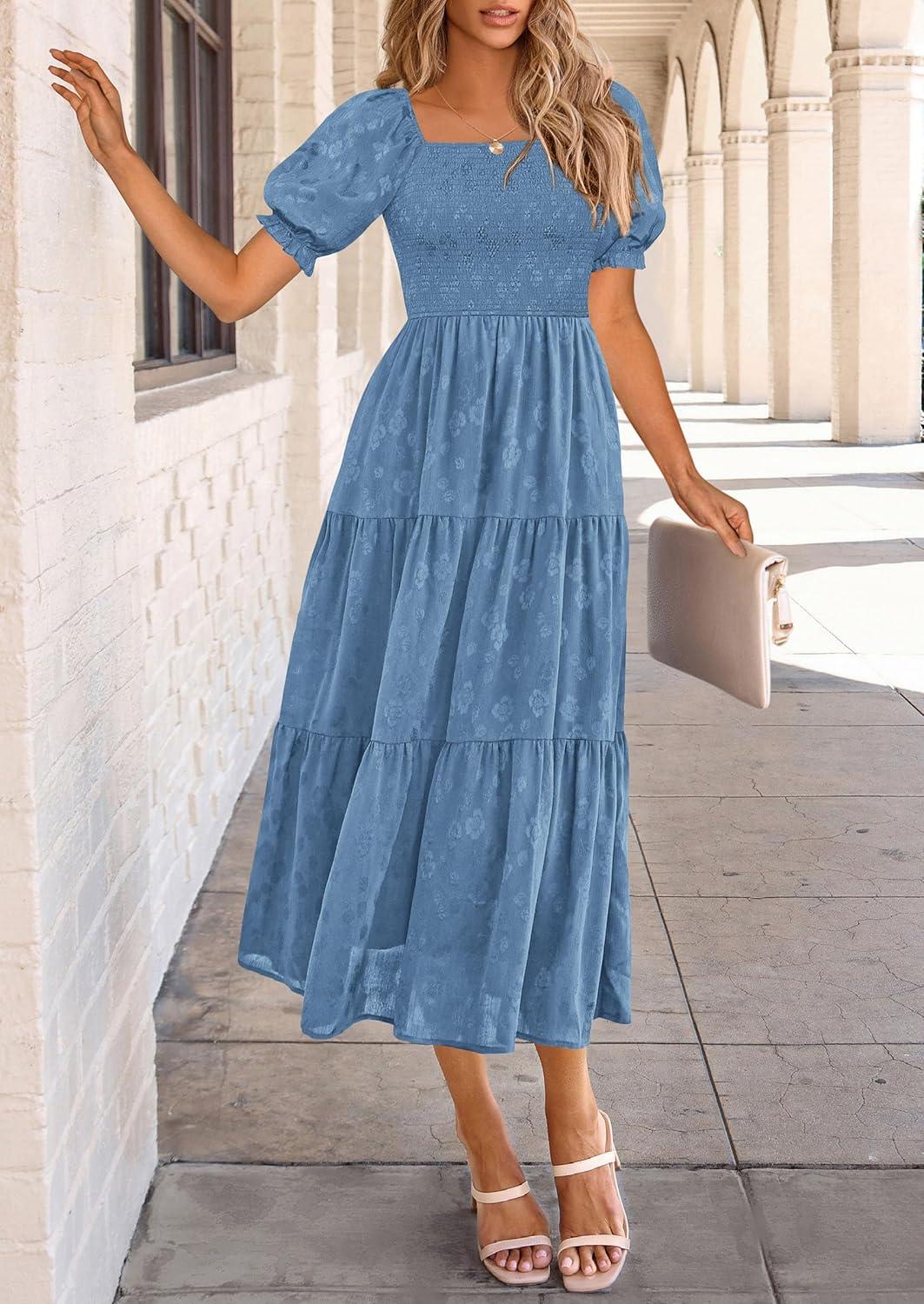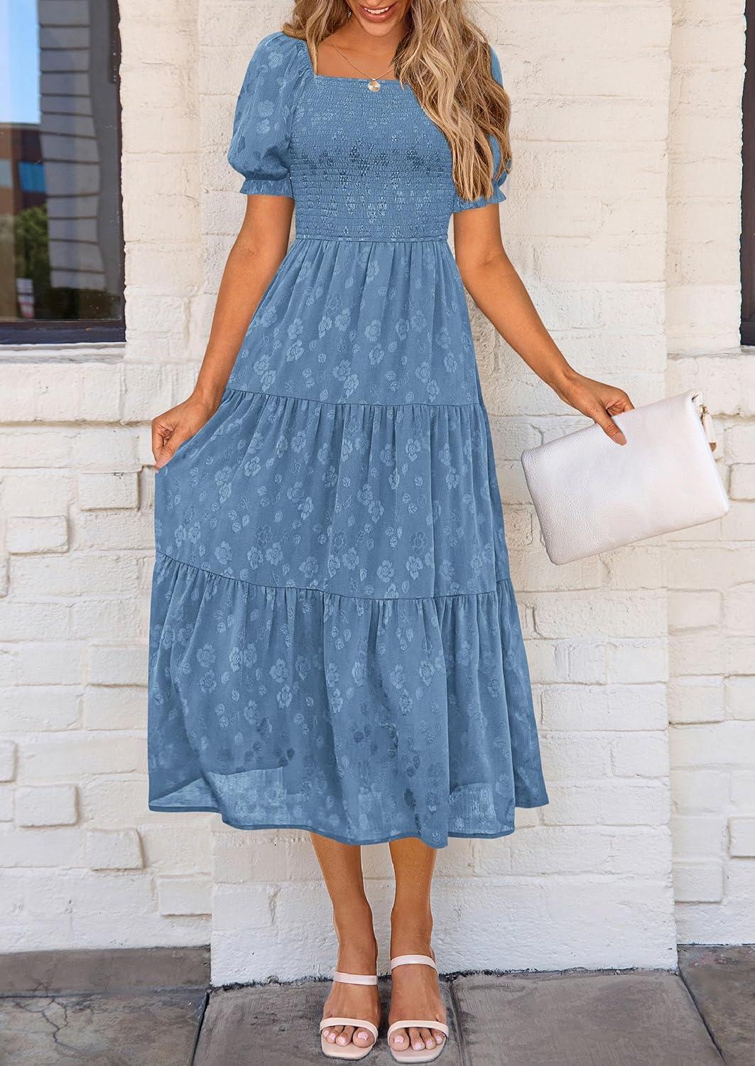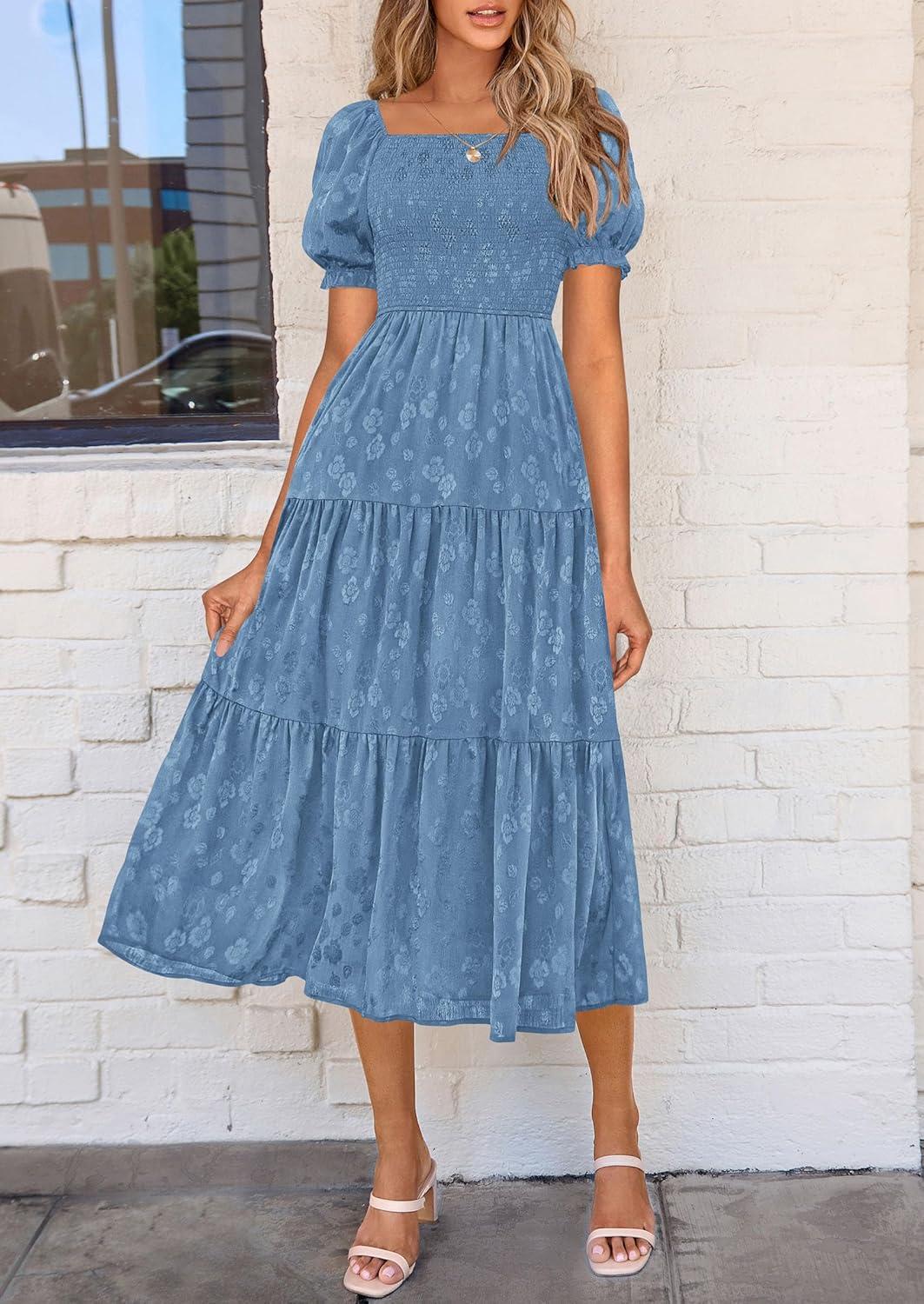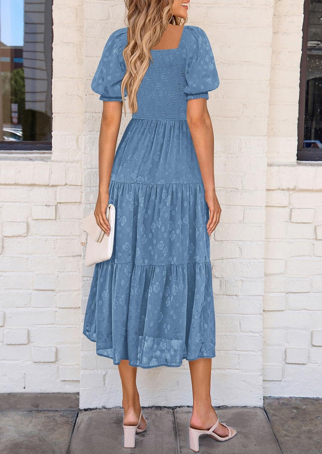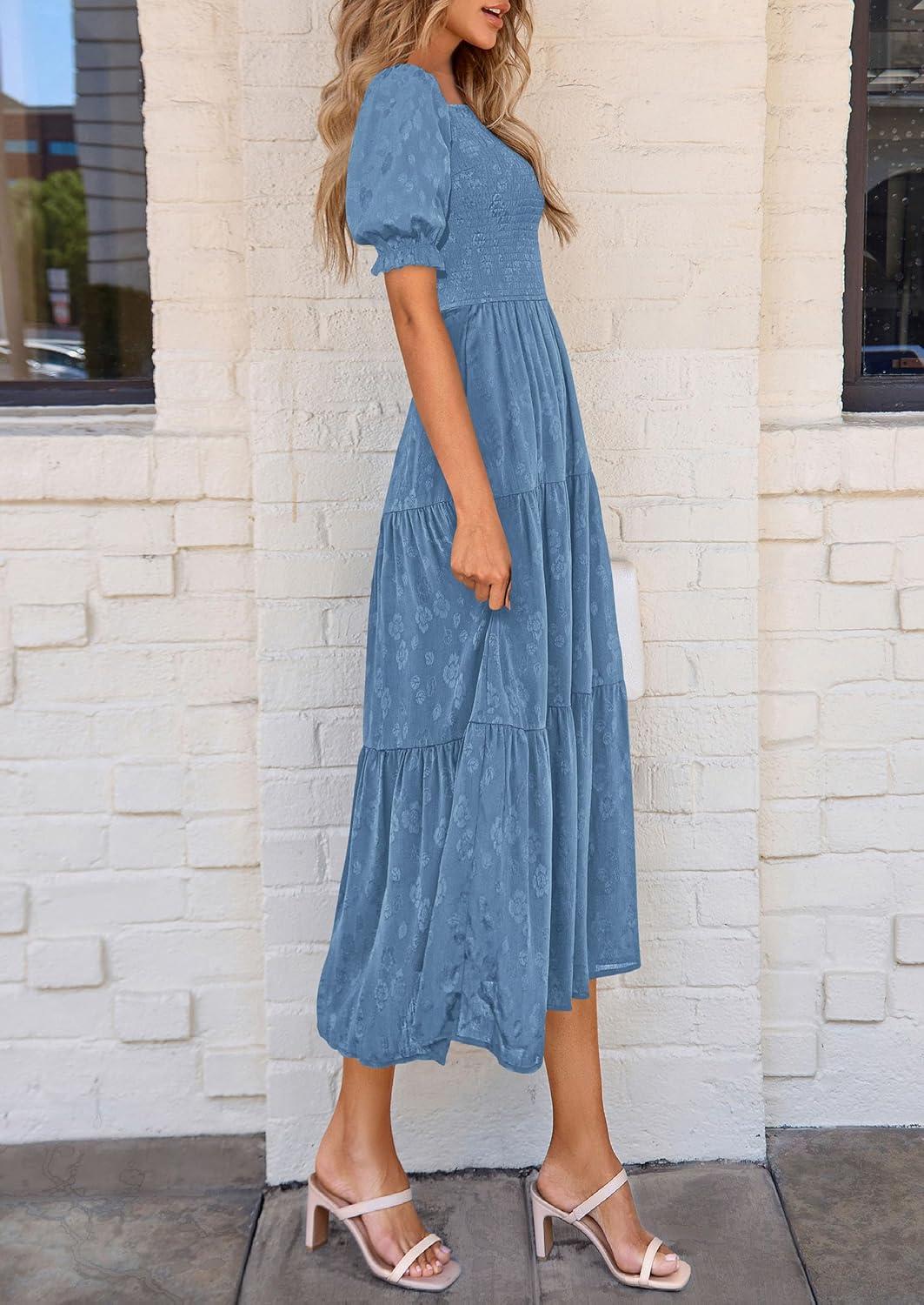 PRETTYGARDEN Women's 2025 Summer Casual Midi Dresses Square Neck Short Sleeve Smocked A Line Floral Flowy Elegant Boho Dress(Blue)