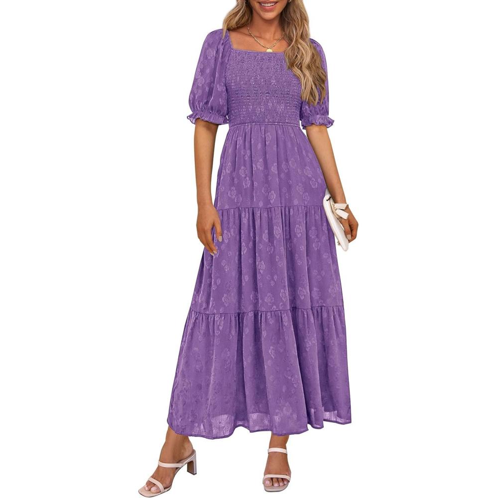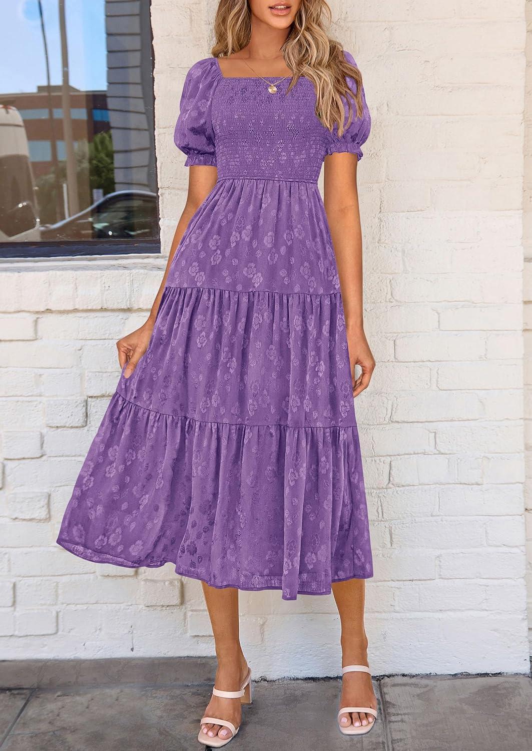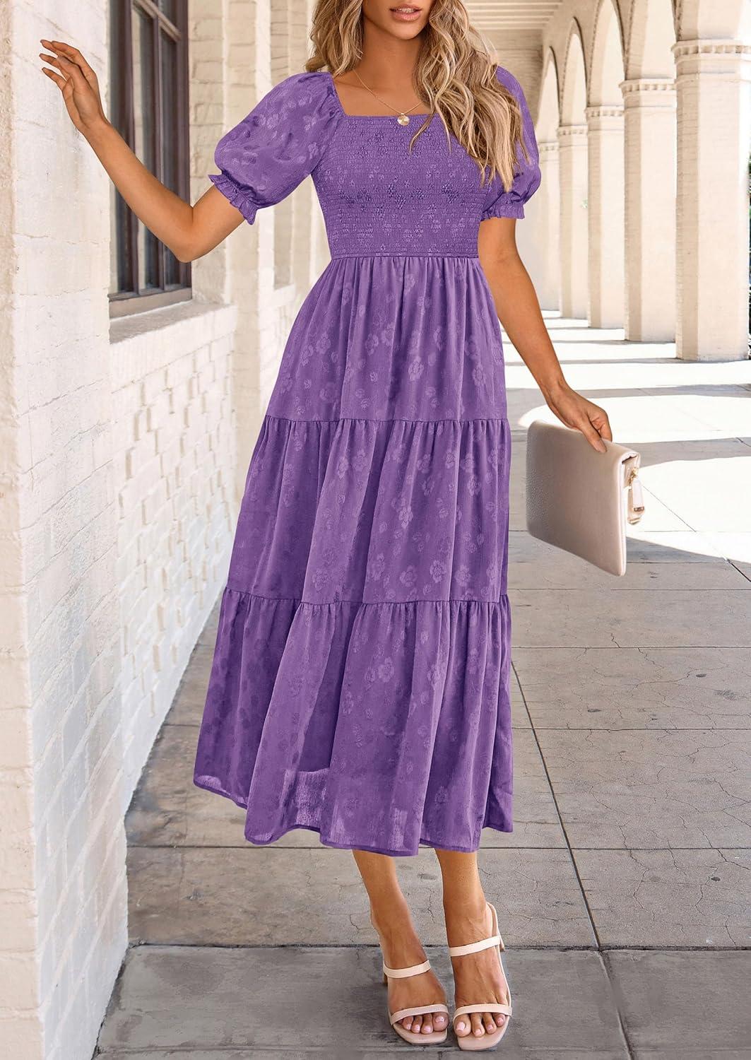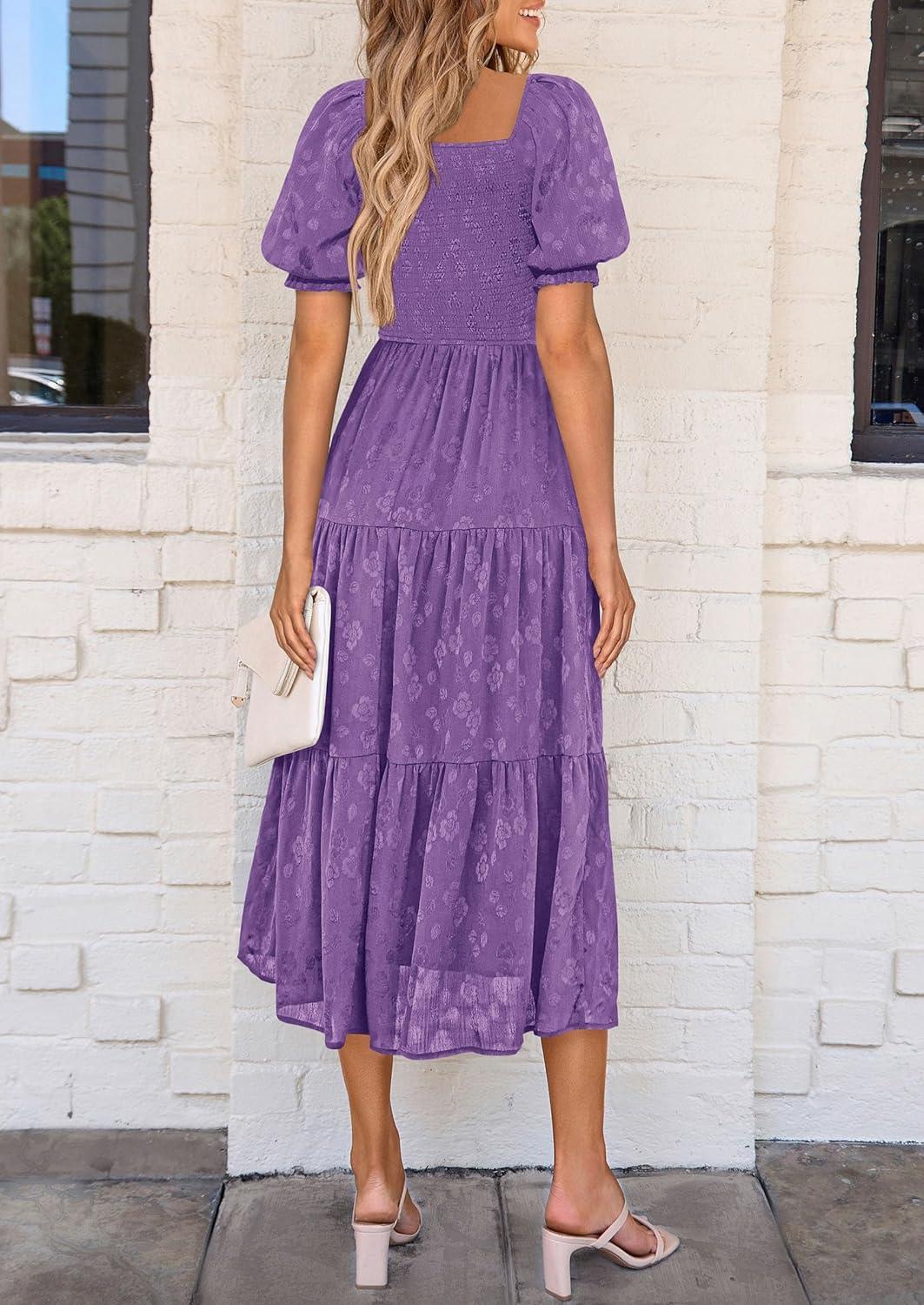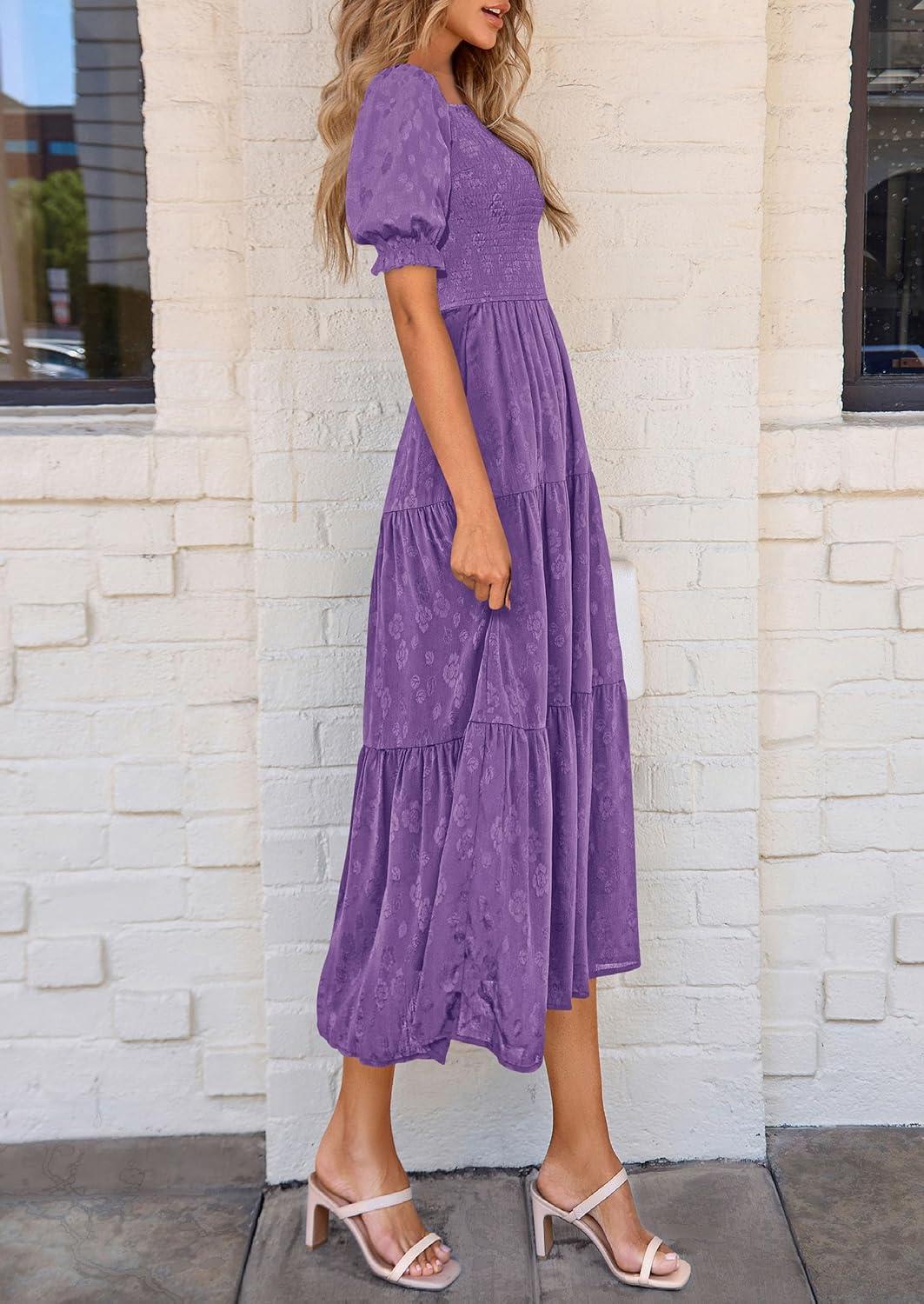 PRETTYGARDEN Women's 2025 Summer Casual Midi Dresses Square Neck Short Sleeve Smocked A Line Floral Flowy Elegant Boho Dress(Dark Purple)