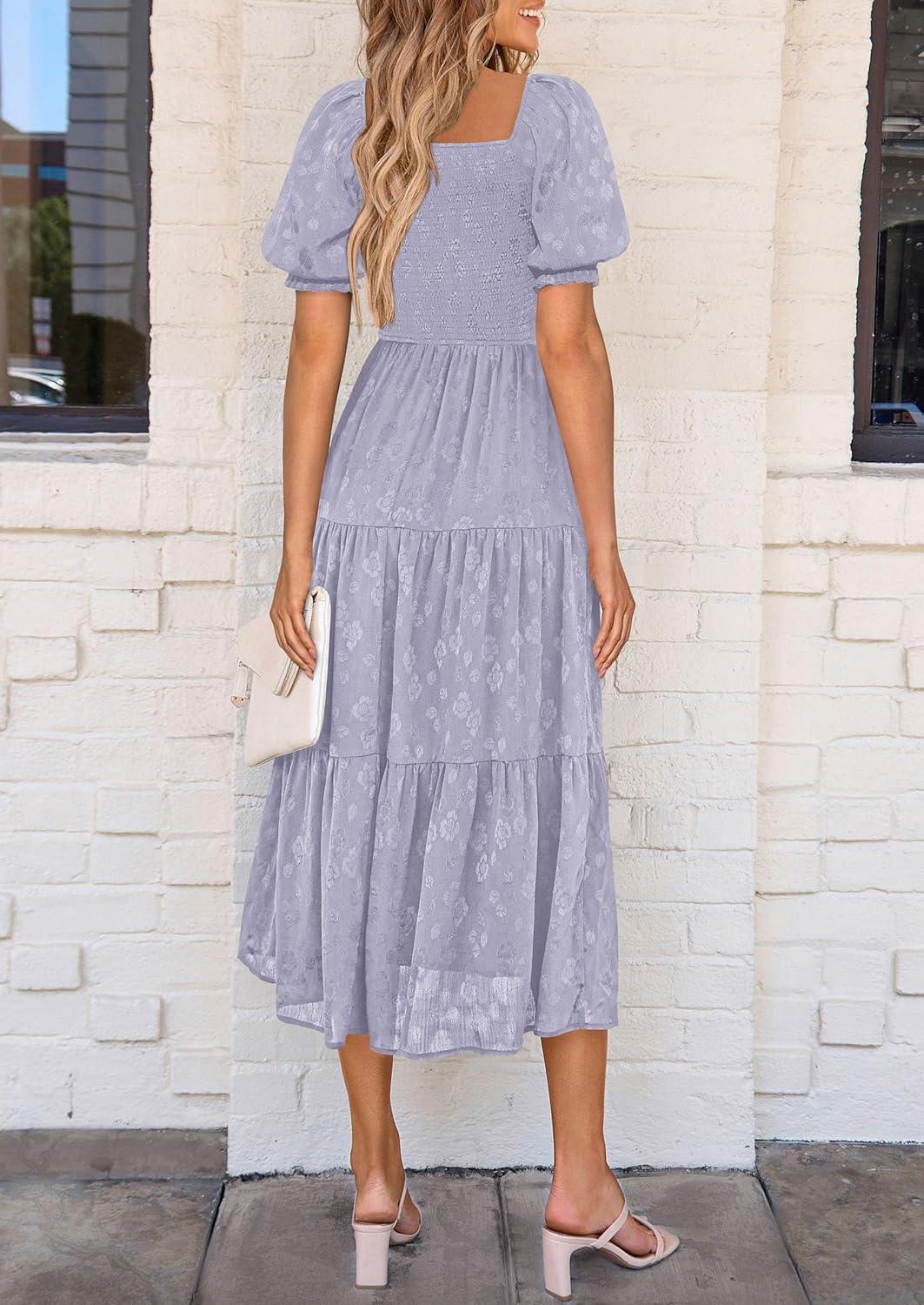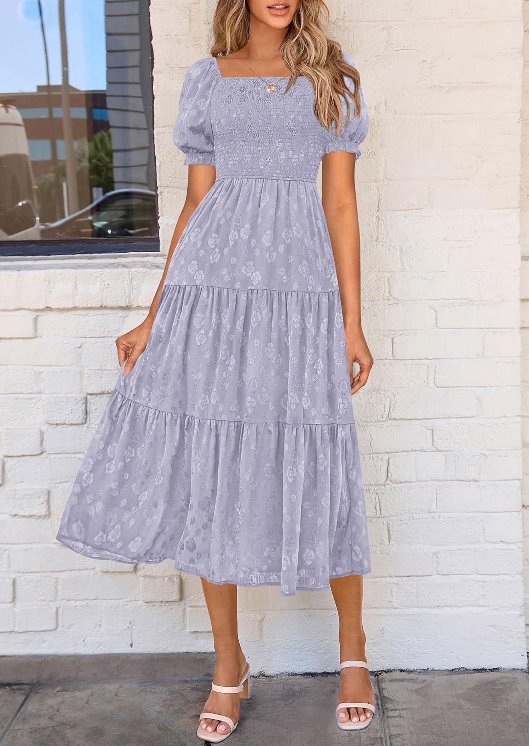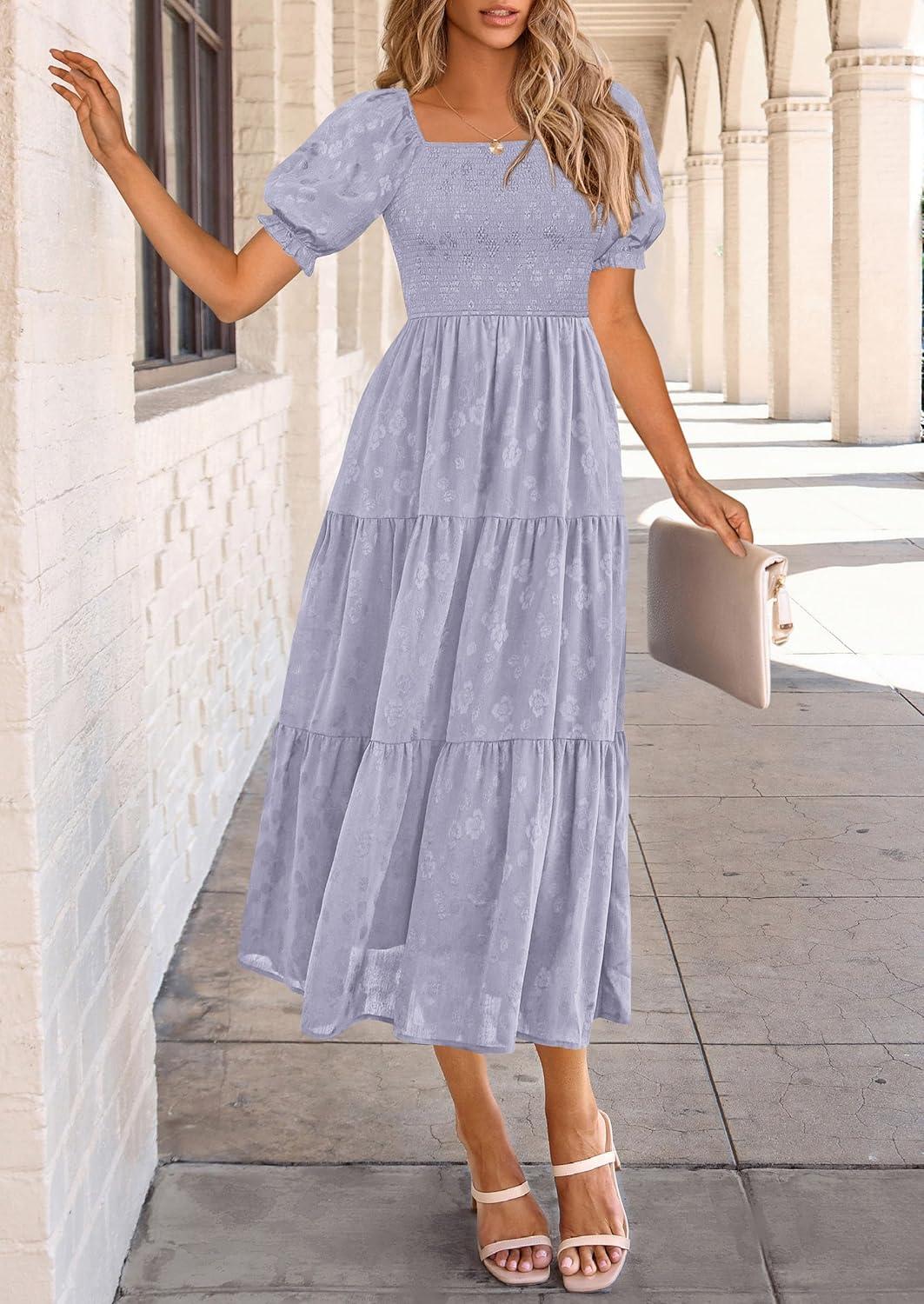 PRETTYGARDEN Women's 2025 Summer Casual Midi Dresses Square Neck Short Sleeve Smocked A Line Floral Flowy Elegant Boho Dress(Grey Blue)