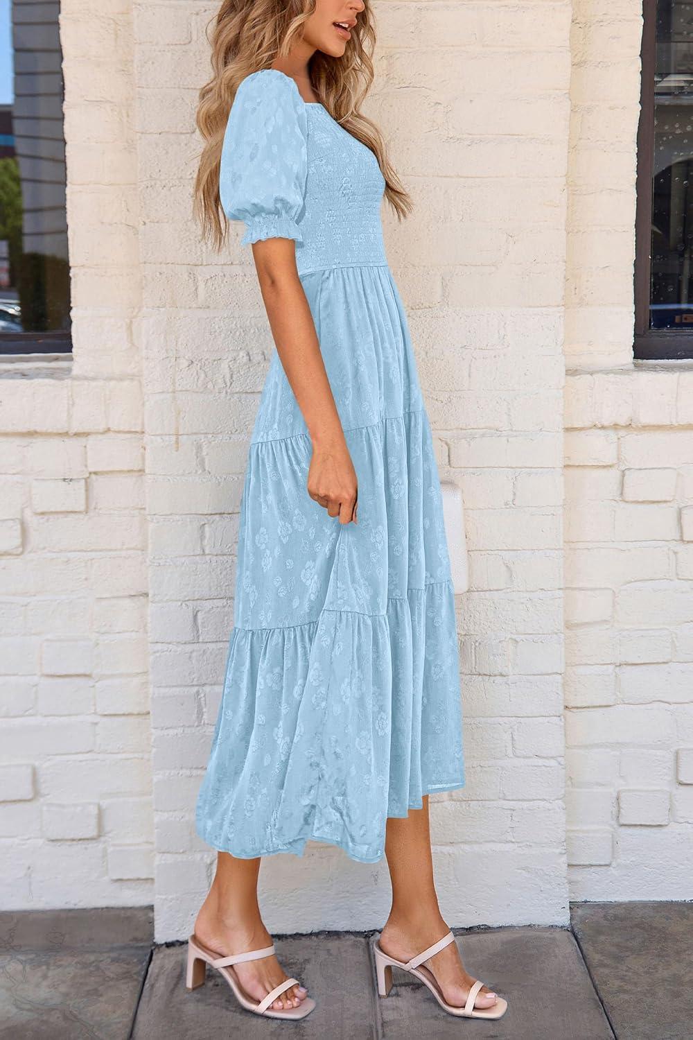 PRETTYGARDEN Women's 2025 Summer Casual Midi Dresses Square Neck Short Sleeve Smocked A Line Floral Flowy Elegant Boho Dress(Light Blue)