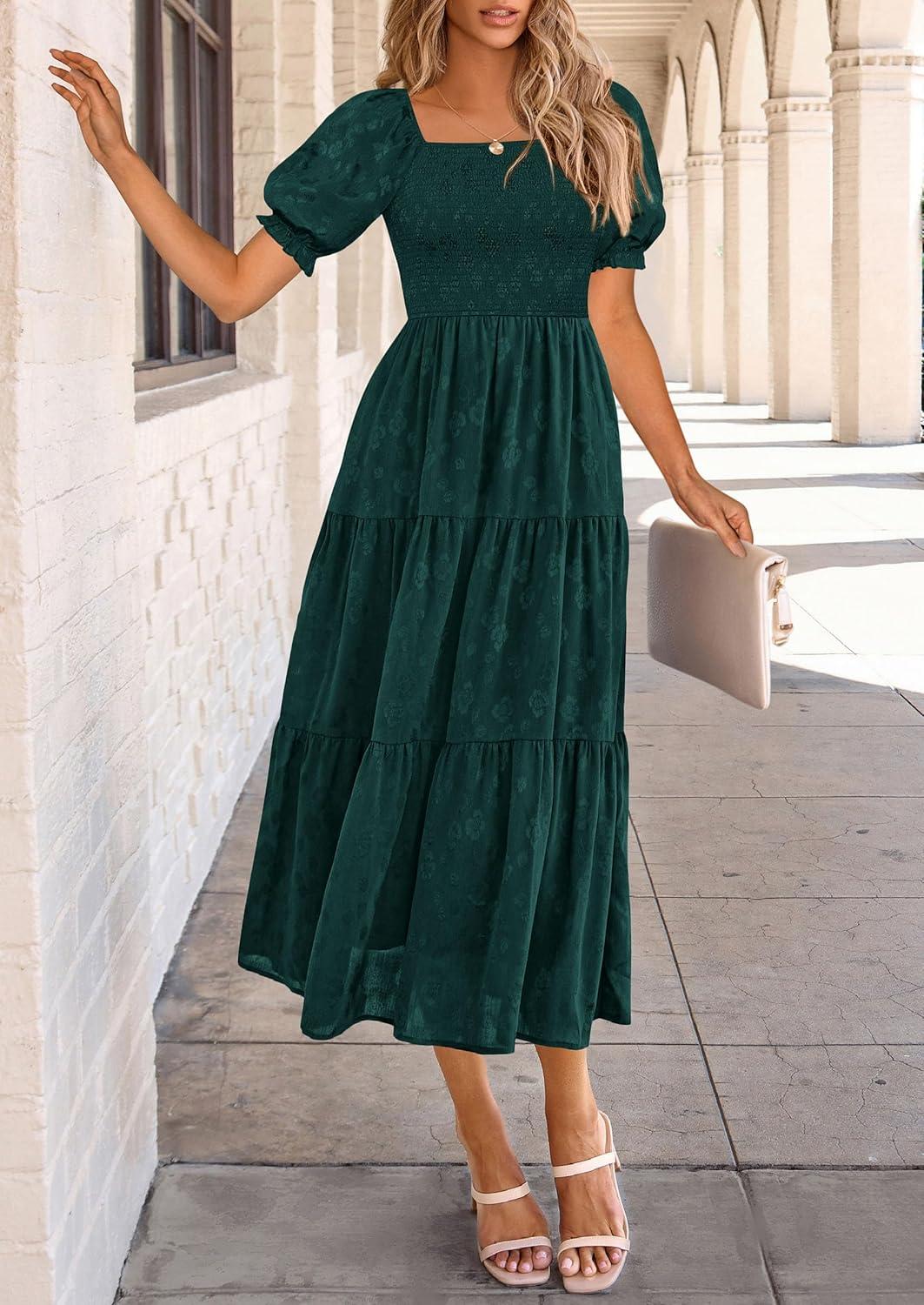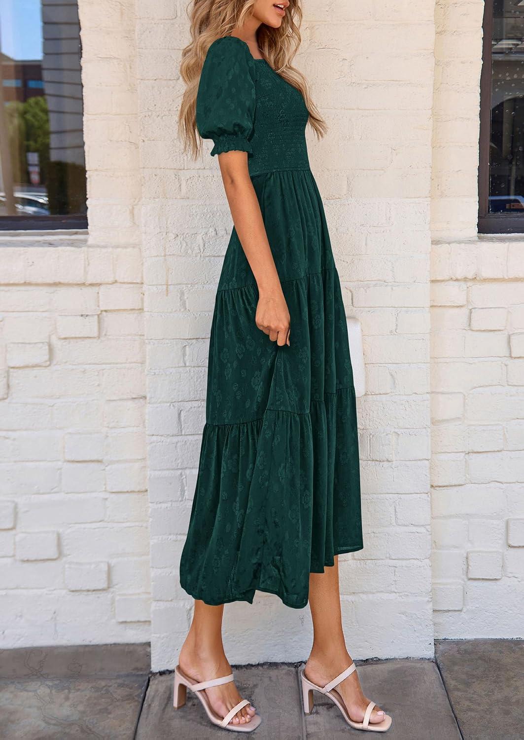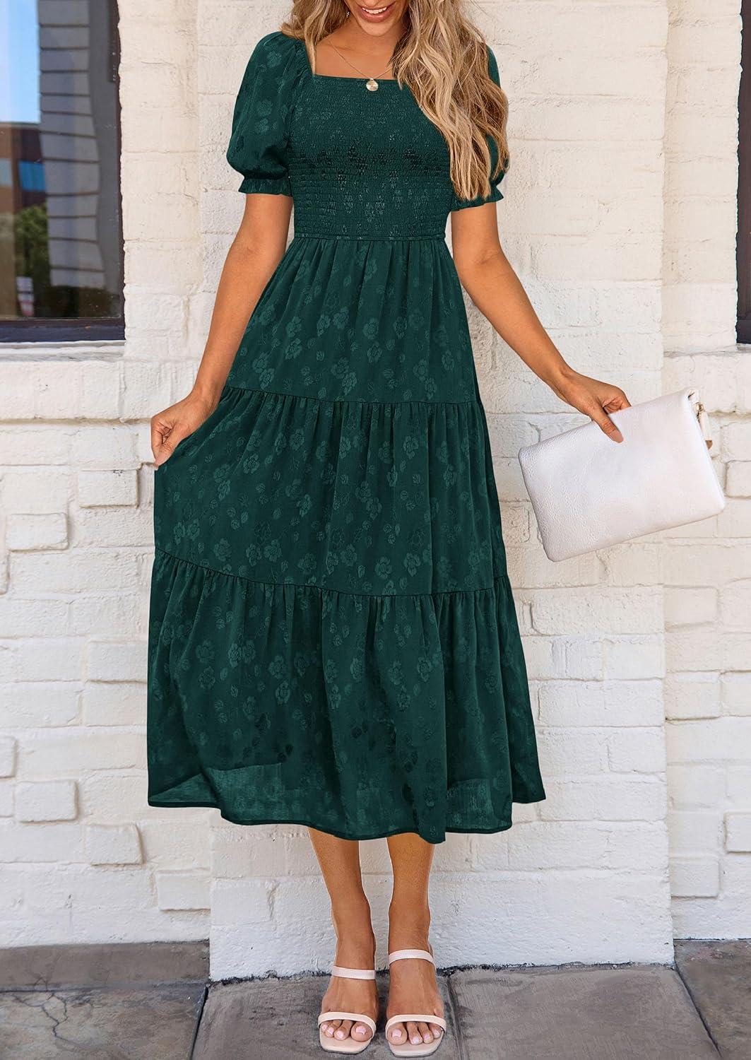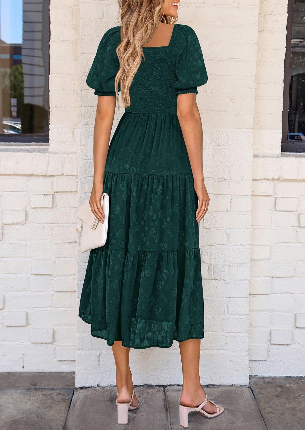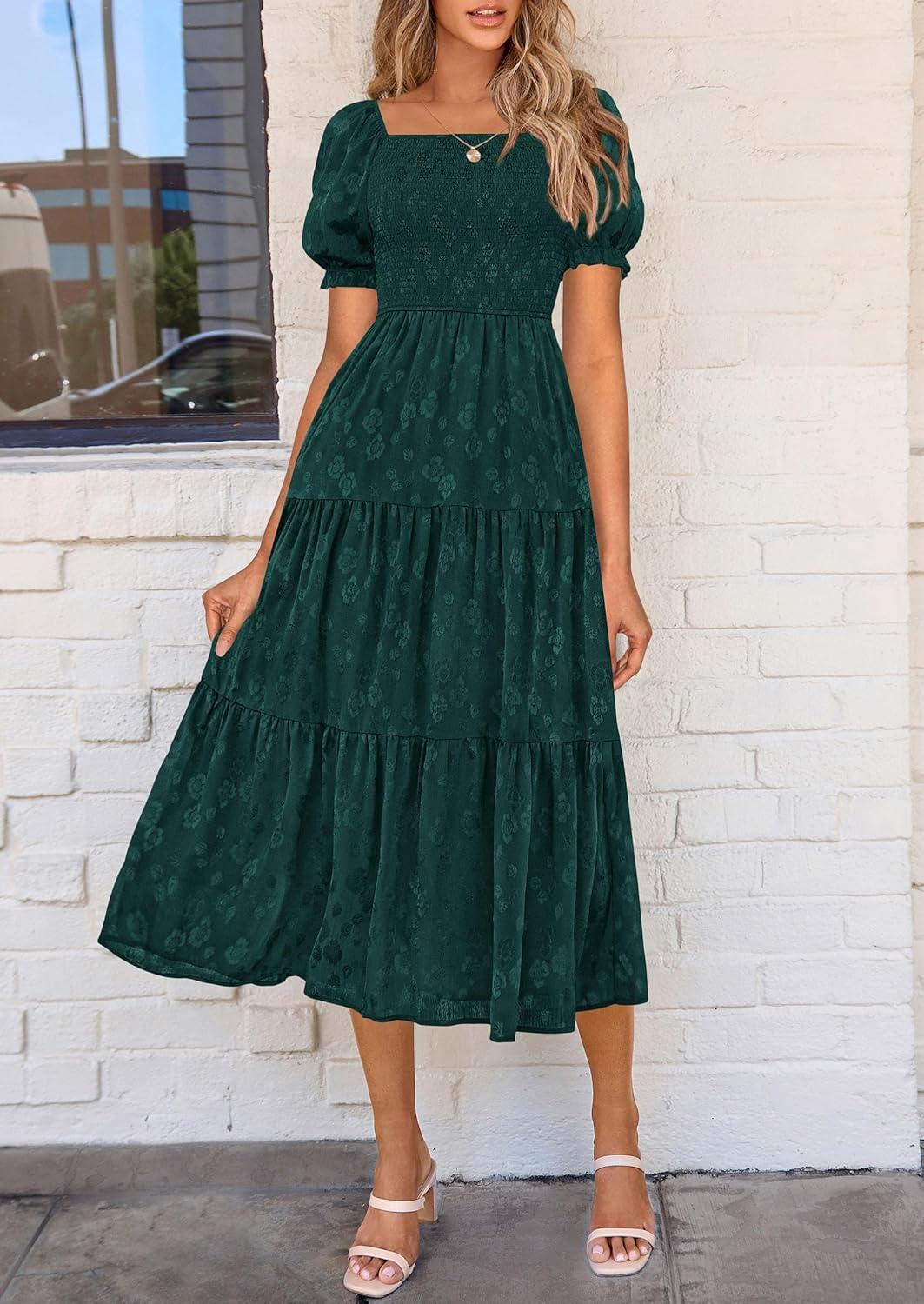 PRETTYGARDEN Women's 2025 Summer Casual Midi Dresses Square Neck Short Sleeve Smocked A Line Floral Flowy Elegant Boho Dress(Malachite Green)
