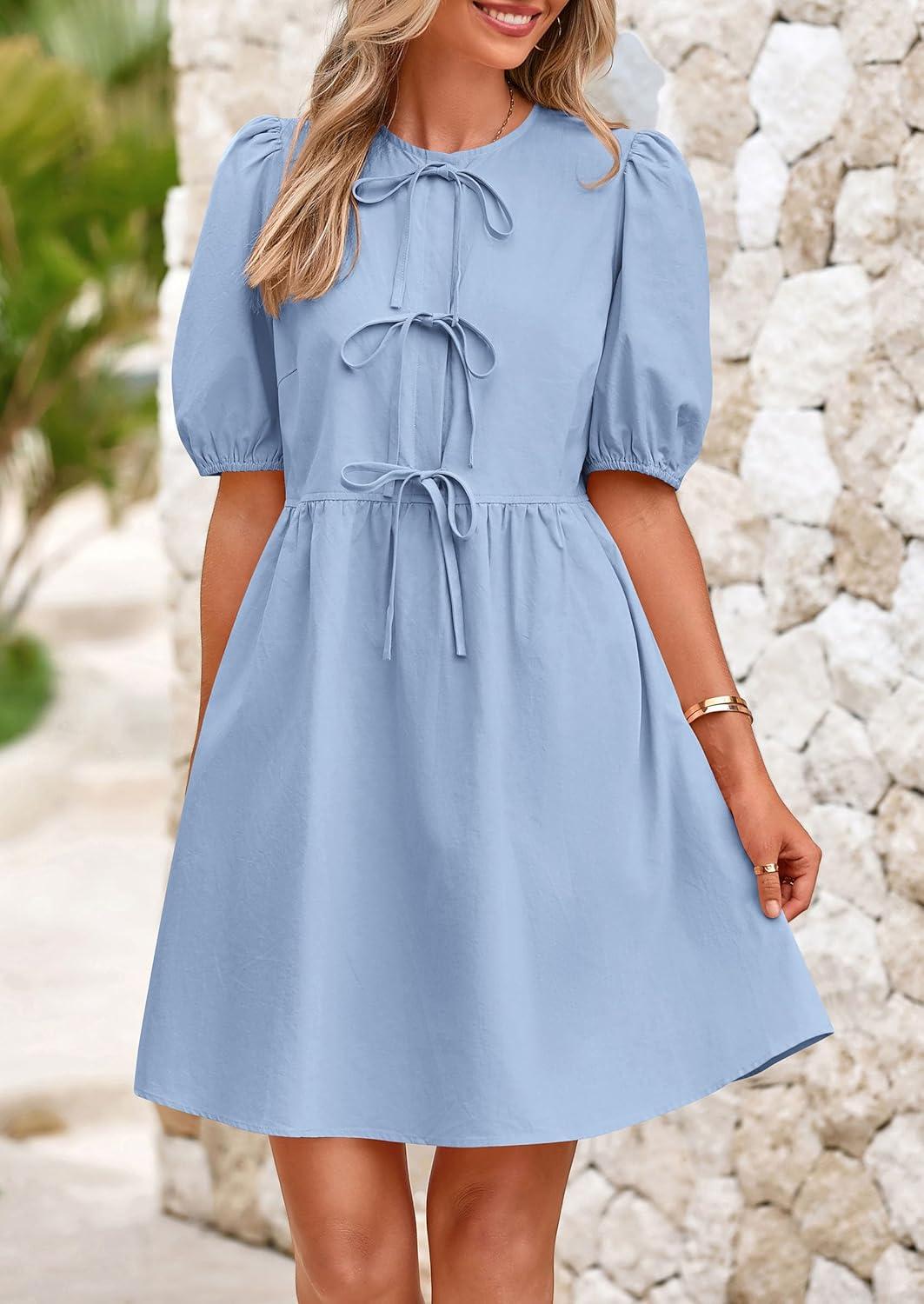 PRETTYGARDEN Womens 2025 Summer Casual Short Sleeve Dresses A Line Bow Tie Front Babydoll Loose Cute Mini Dress with Pockets(Light Blue)