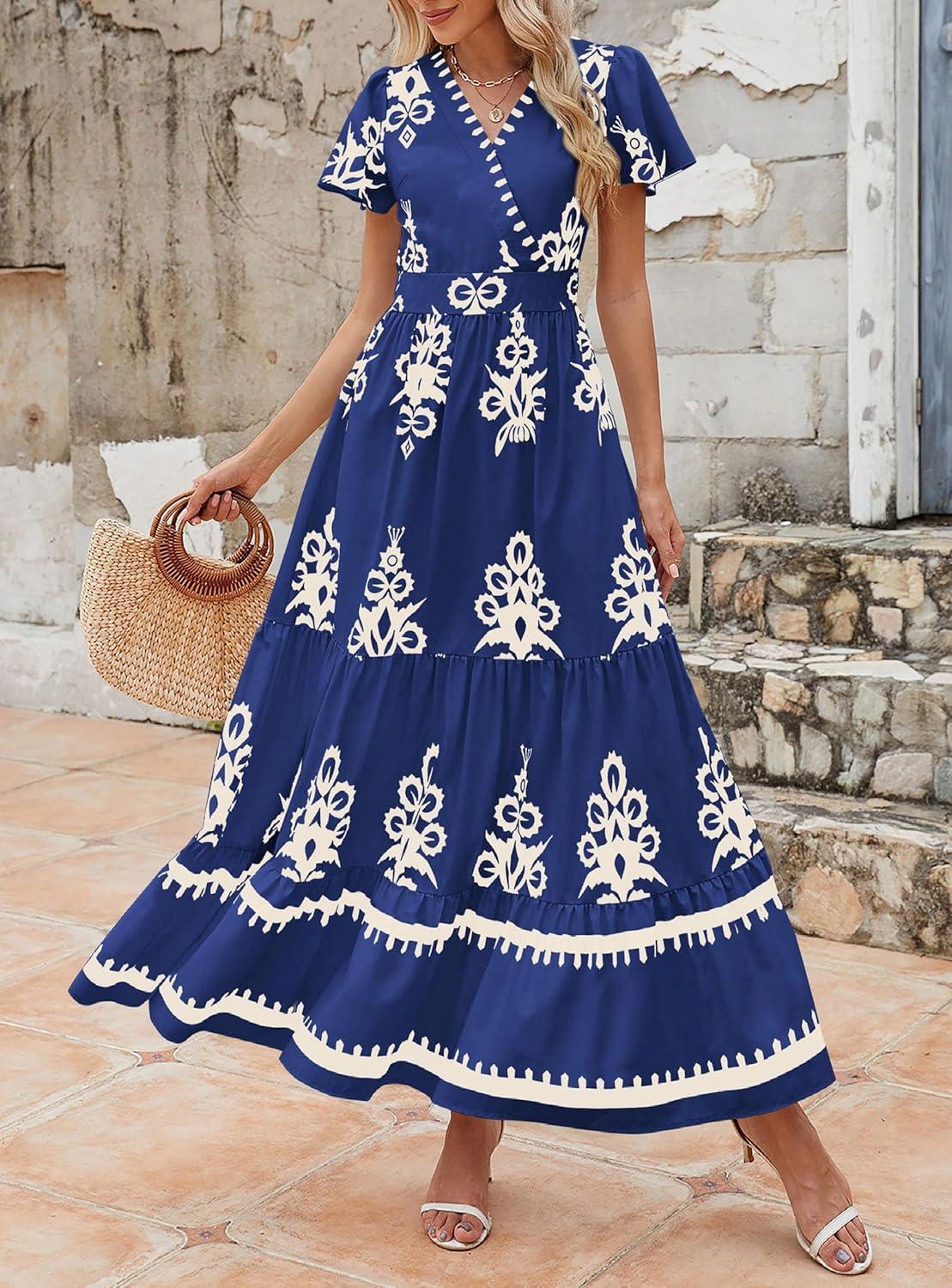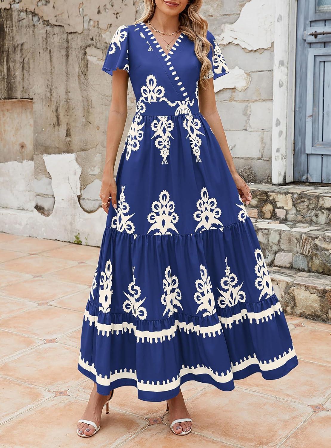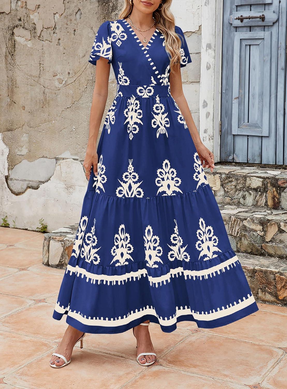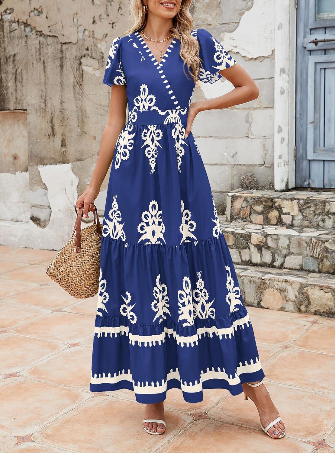 PRETTYGARDEN Womens 2025 Summer Casual V Neck Boho Maxi Dress Flowy Aline Bell Sleeve Tiered Floral Dresses with Pocket(Floral Royal Blue White)