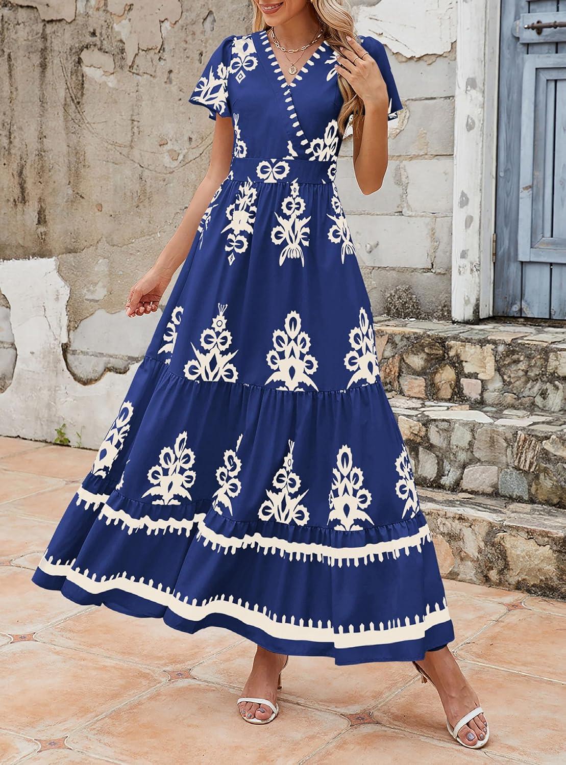 PRETTYGARDEN Womens 2025 Summer Casual V Neck Boho Maxi Dress Flowy Aline Bell Sleeve Tiered Floral Dresses with Pocket(Floral Navy White)