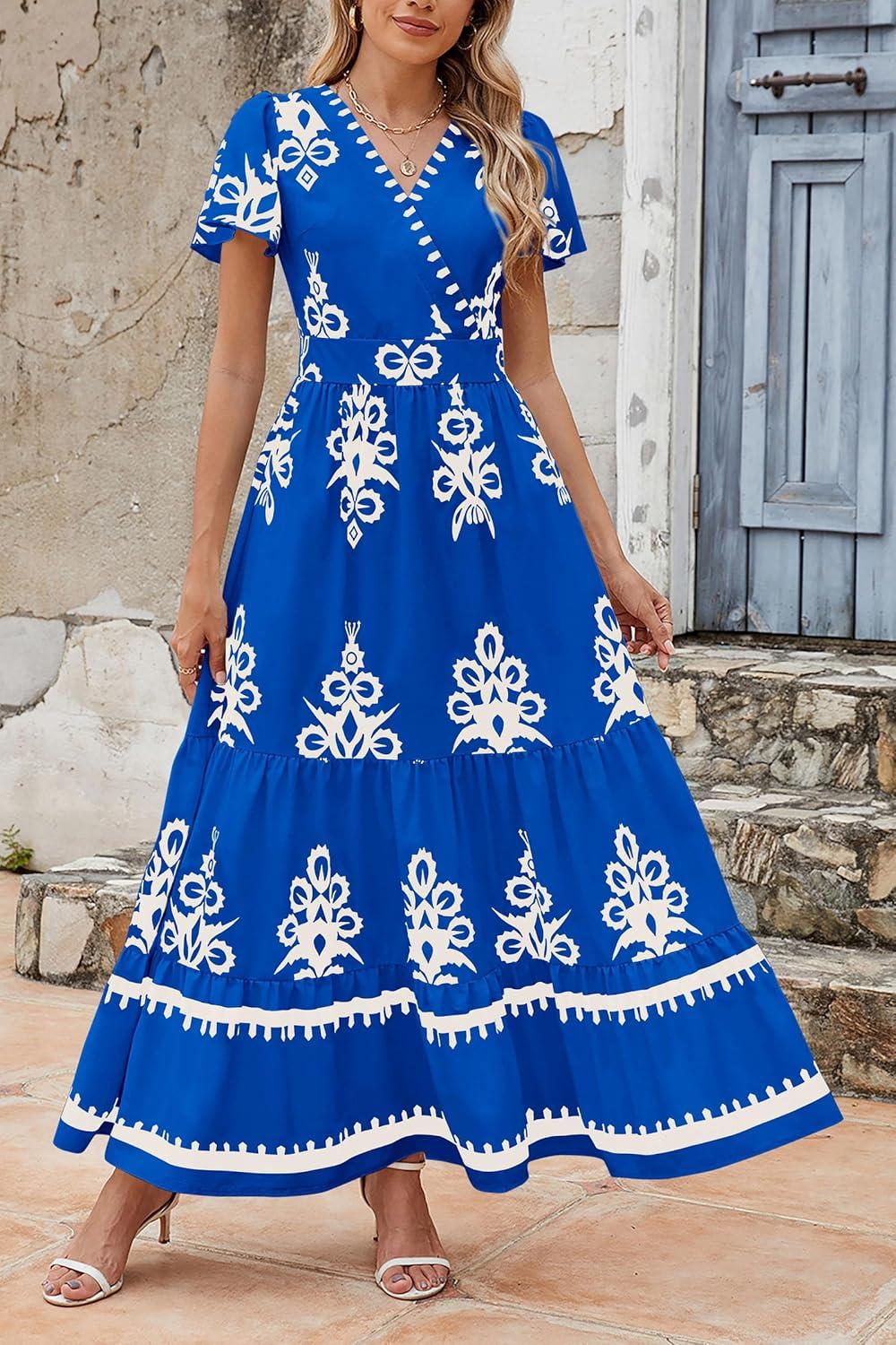 PRETTYGARDEN Womens 2025 Summer Casual V Neck Boho Maxi Dress Flowy Aline Bell Sleeve Tiered Floral Dresses with Pocket(Floral Royal Blue White)