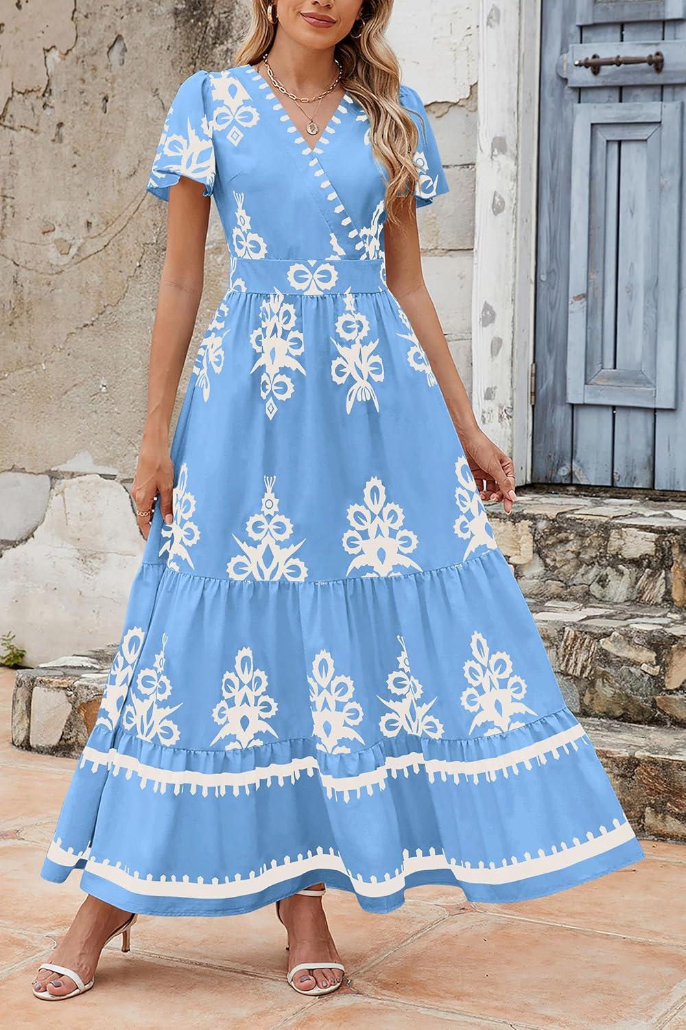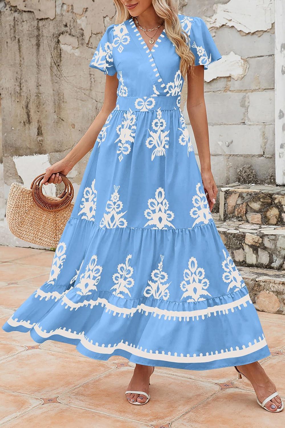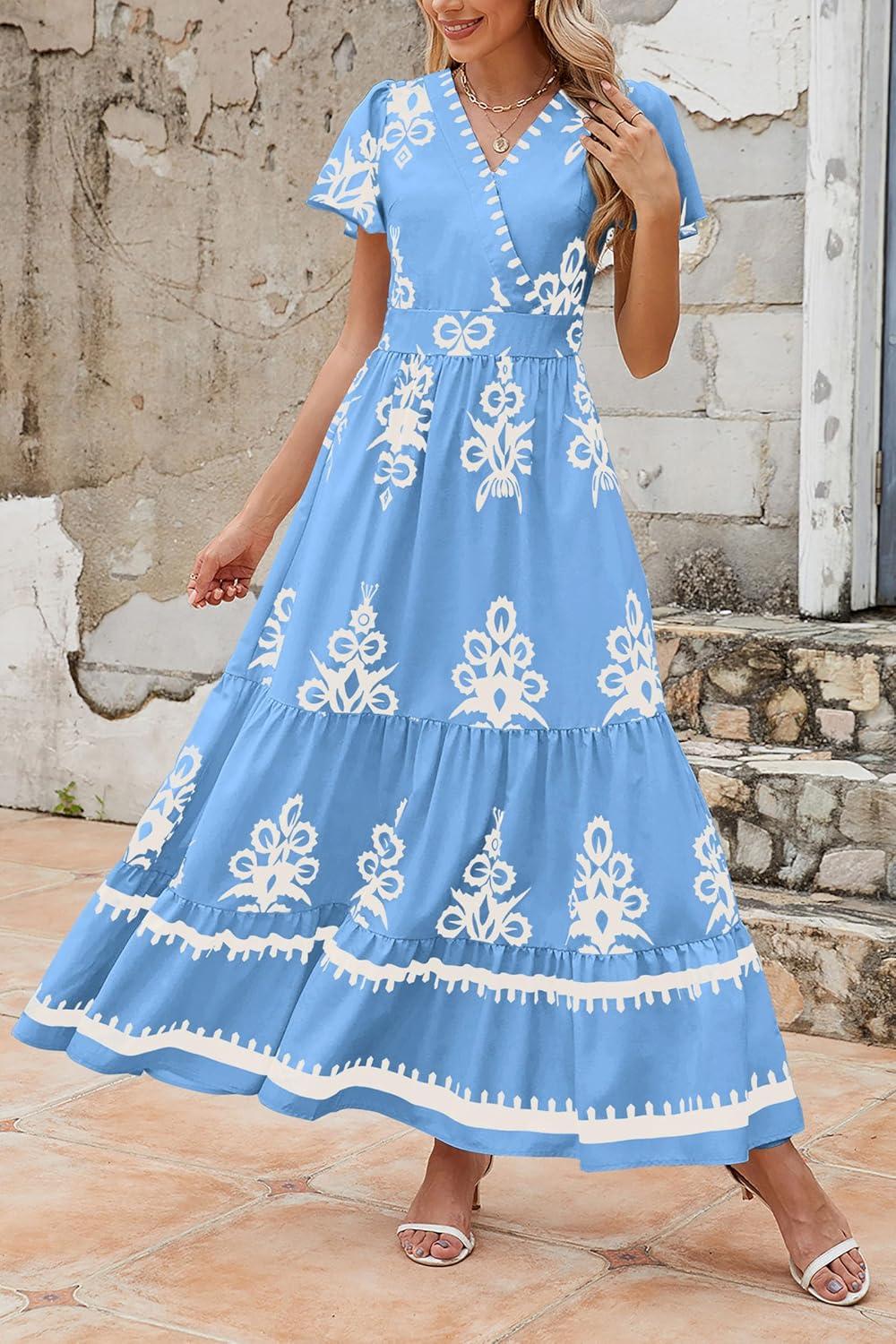 PRETTYGARDEN Womens 2025 Summer Casual V Neck Boho Maxi Dress Flowy Aline Bell Sleeve Tiered Floral Dresses with Pocket(Floral Sky Blue White)