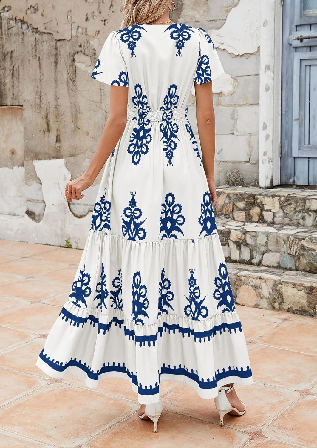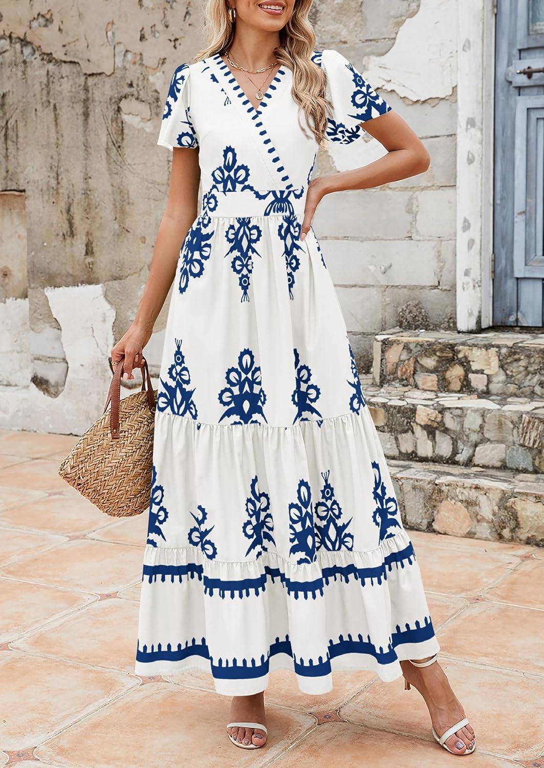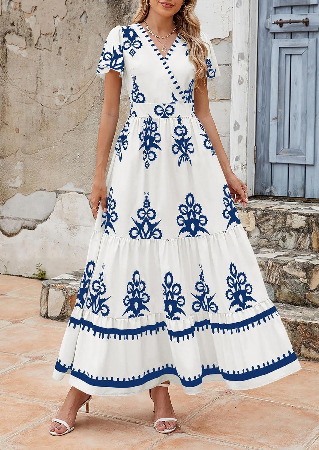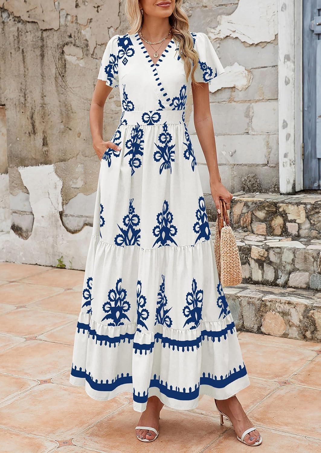 PRETTYGARDEN Womens 2025 Summer Casual V Neck Boho Maxi Dress Flowy Aline Bell Sleeve Tiered Floral Dresses with Pocket(Floral White Blue)