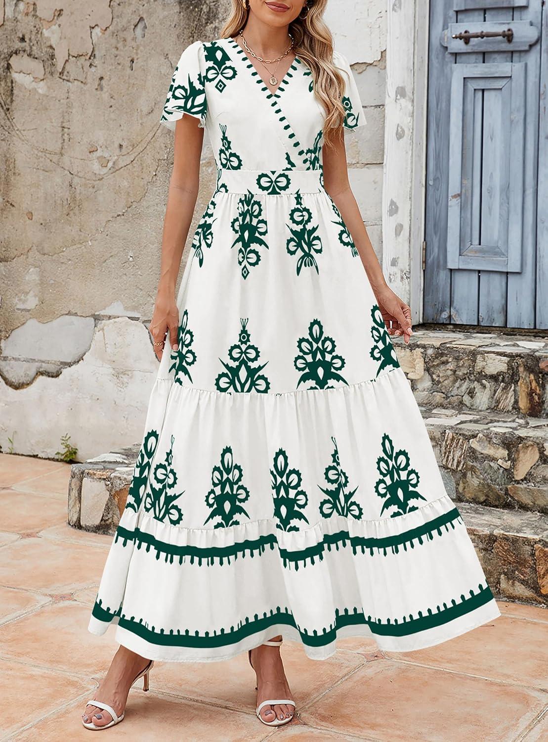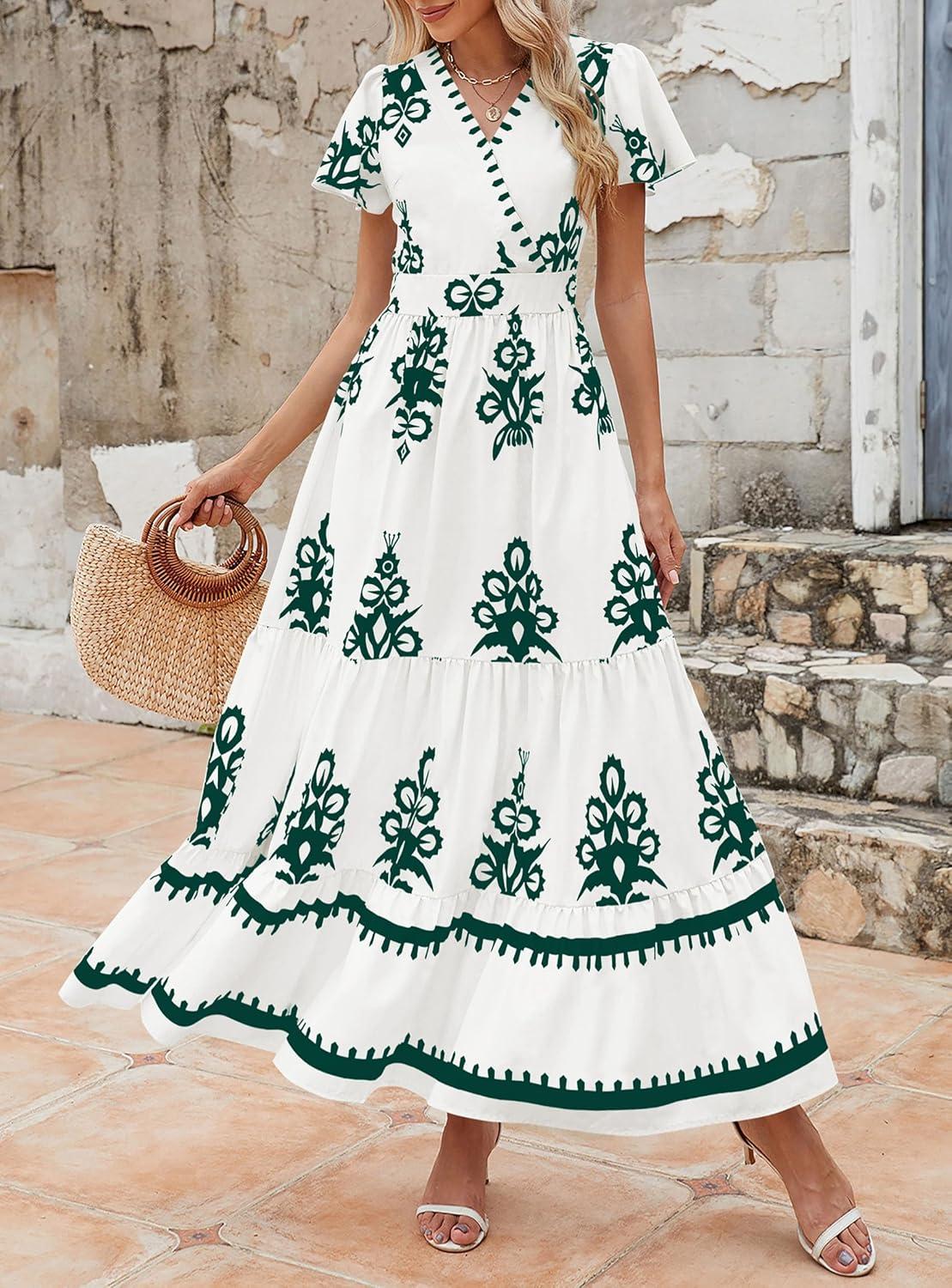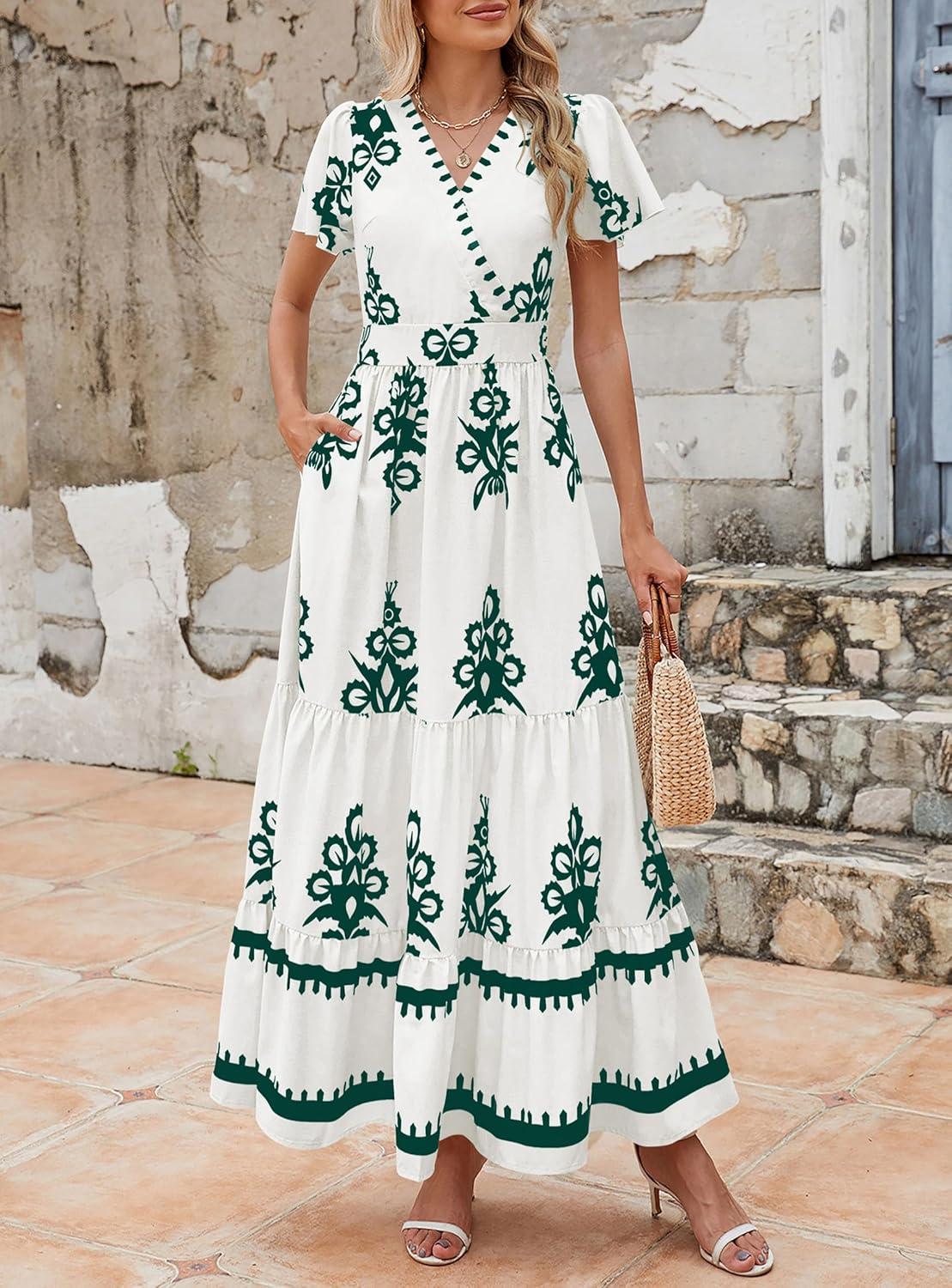 PRETTYGARDEN Womens 2025 Summer Casual V Neck Boho Maxi Dress Flowy Aline Bell Sleeve Tiered Floral Dresses with Pocket(Floral White Green)