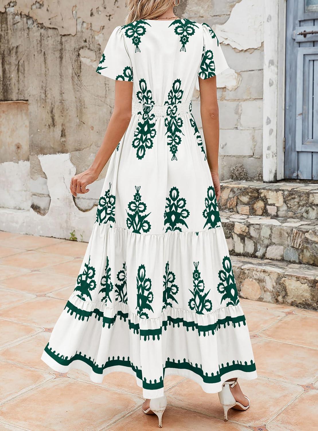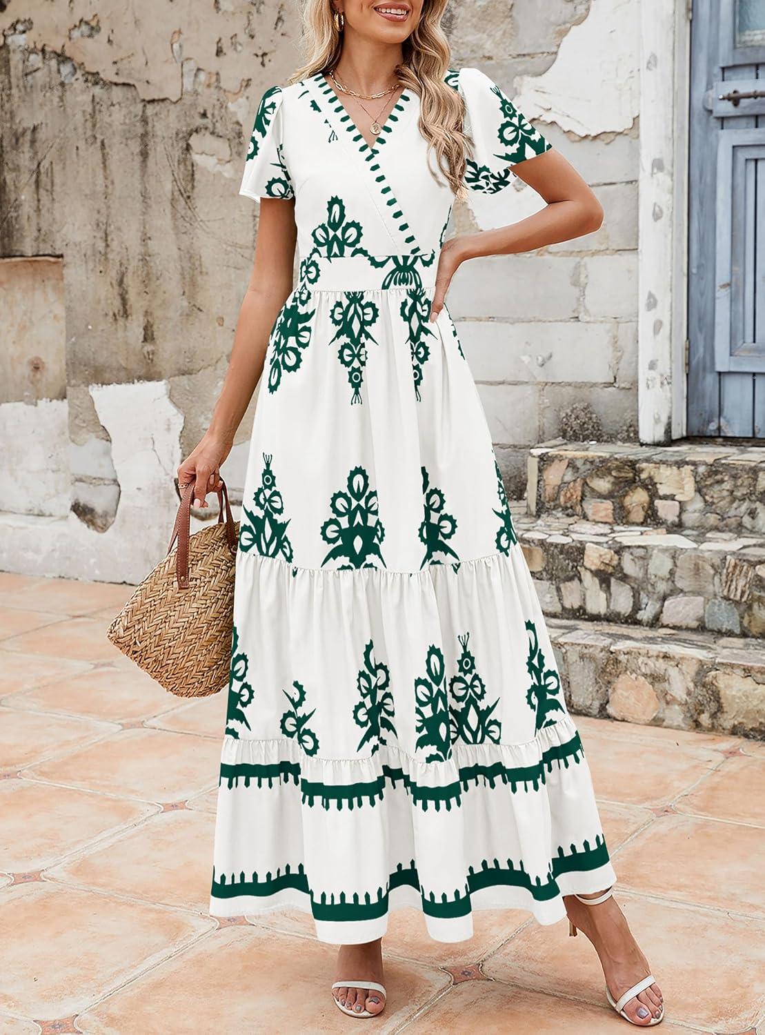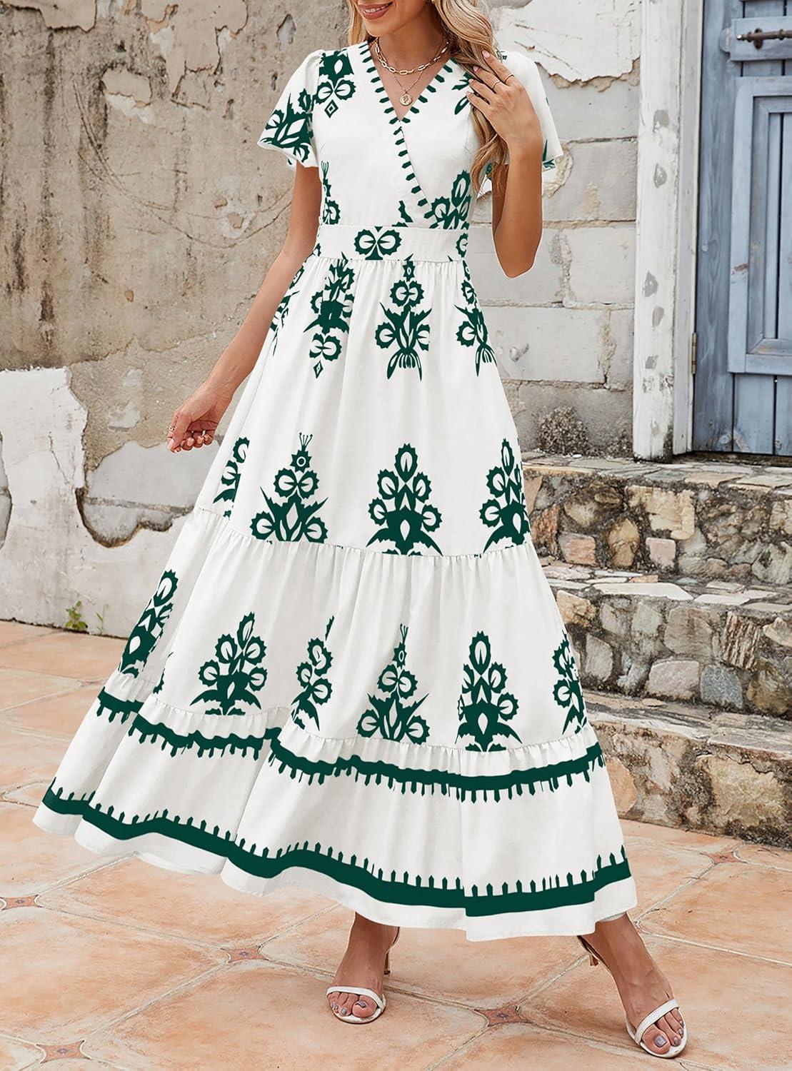 PRETTYGARDEN Womens 2025 Summer Casual V Neck Boho Maxi Dress Flowy Aline Bell Sleeve Tiered Floral Dresses with Pocket(Floral White Green)