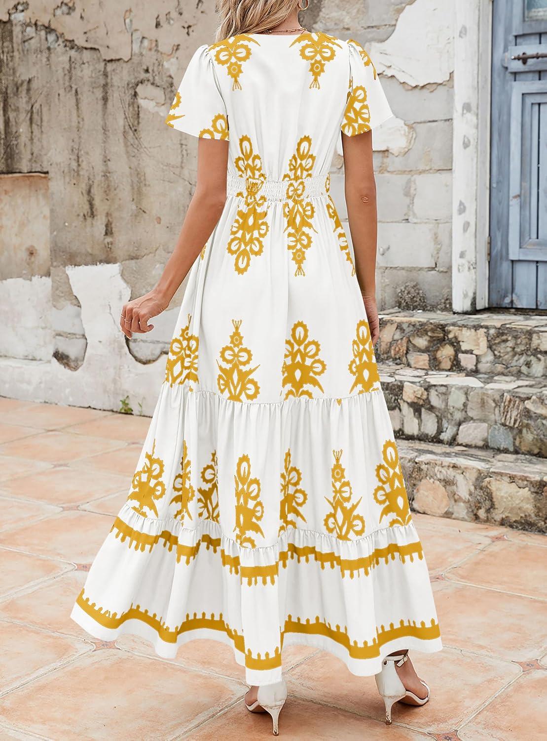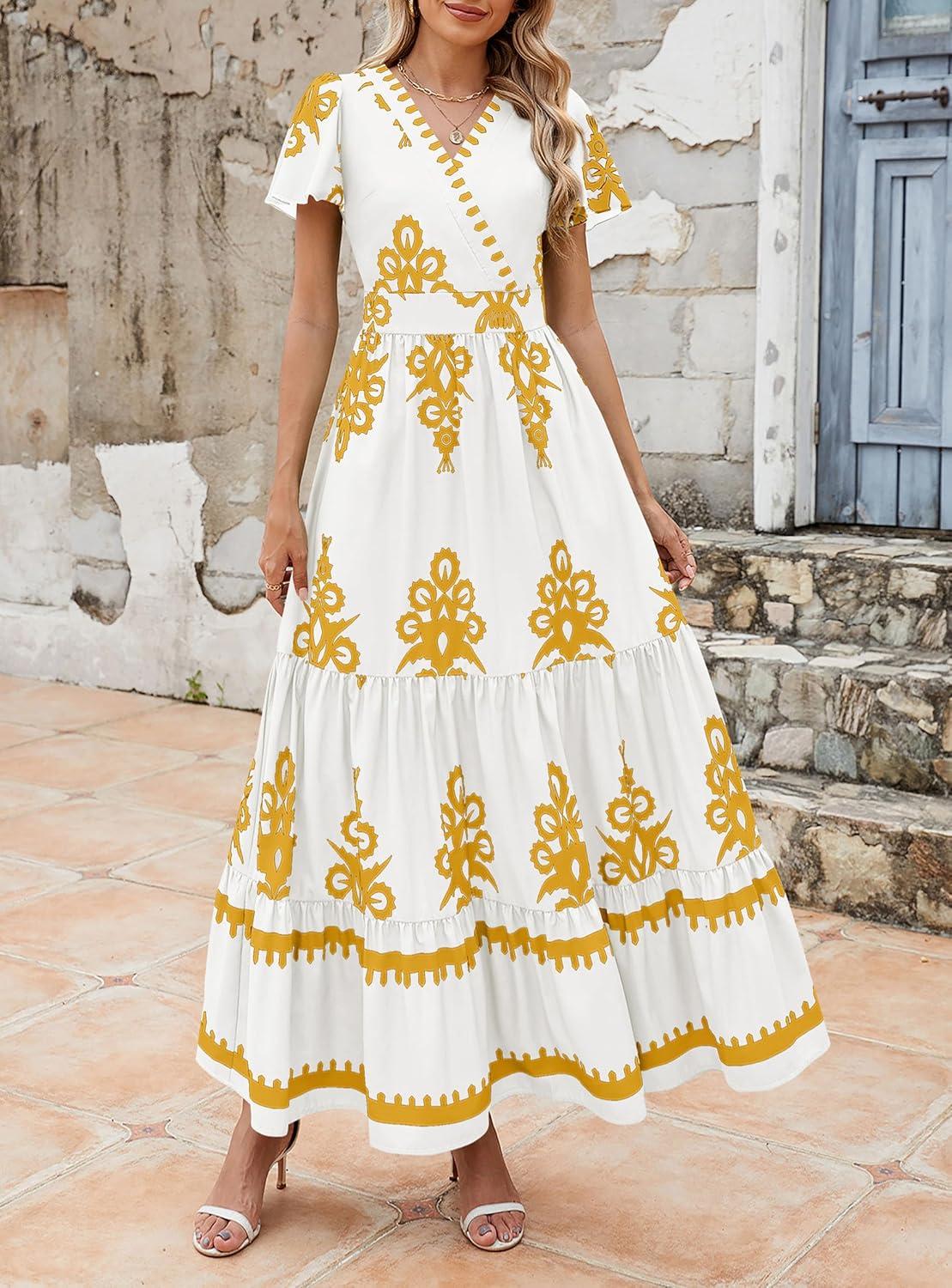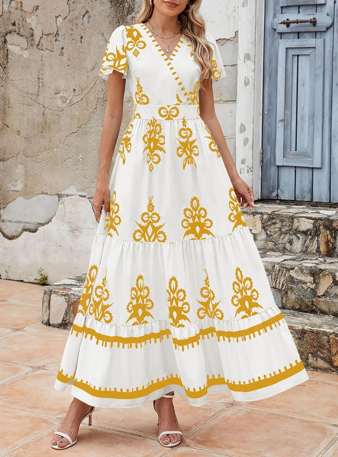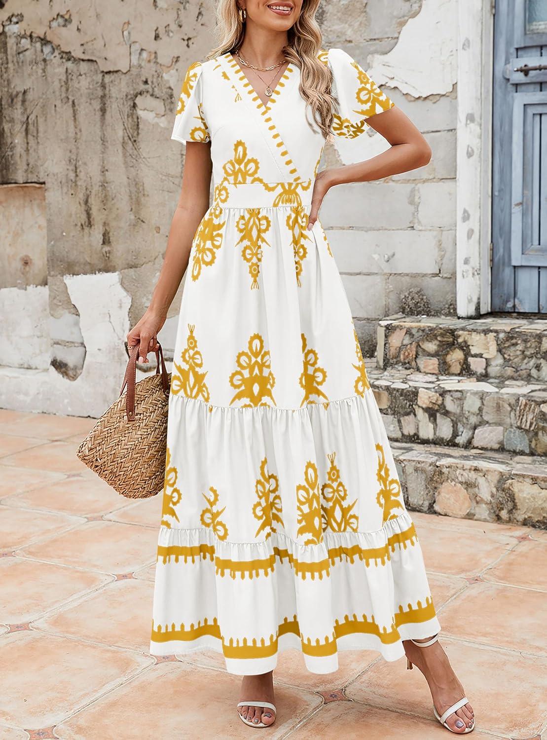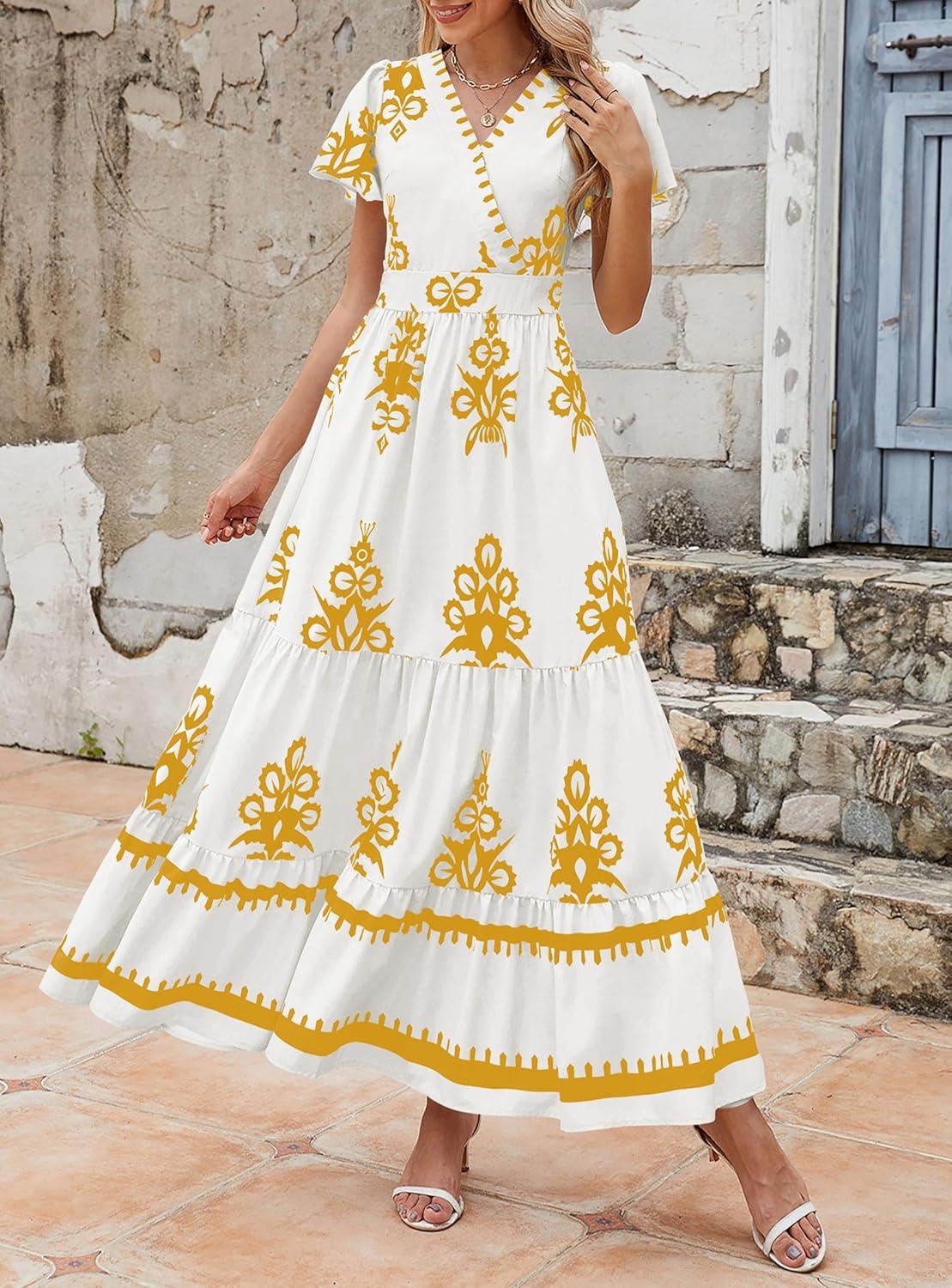 PRETTYGARDEN Womens 2025 Summer Casual V Neck Boho Maxi Dress Flowy Aline Bell Sleeve Tiered Floral Dresses with Pocket(Floral White Yellow)