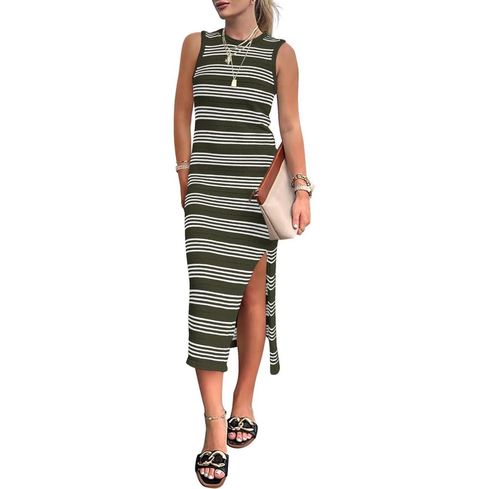 PRETTYGARDEN Women's 2025 Summer Dresses Casual Sleeveless Hollow Out Knit Side Slit Striped Midi Tank Dress(Army Green)