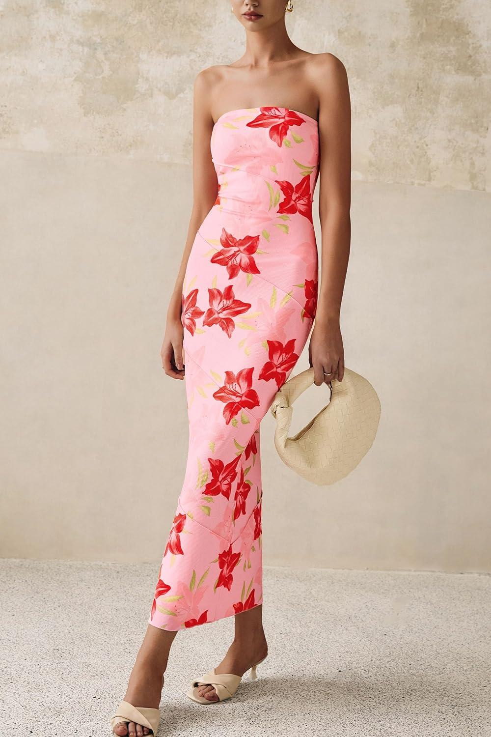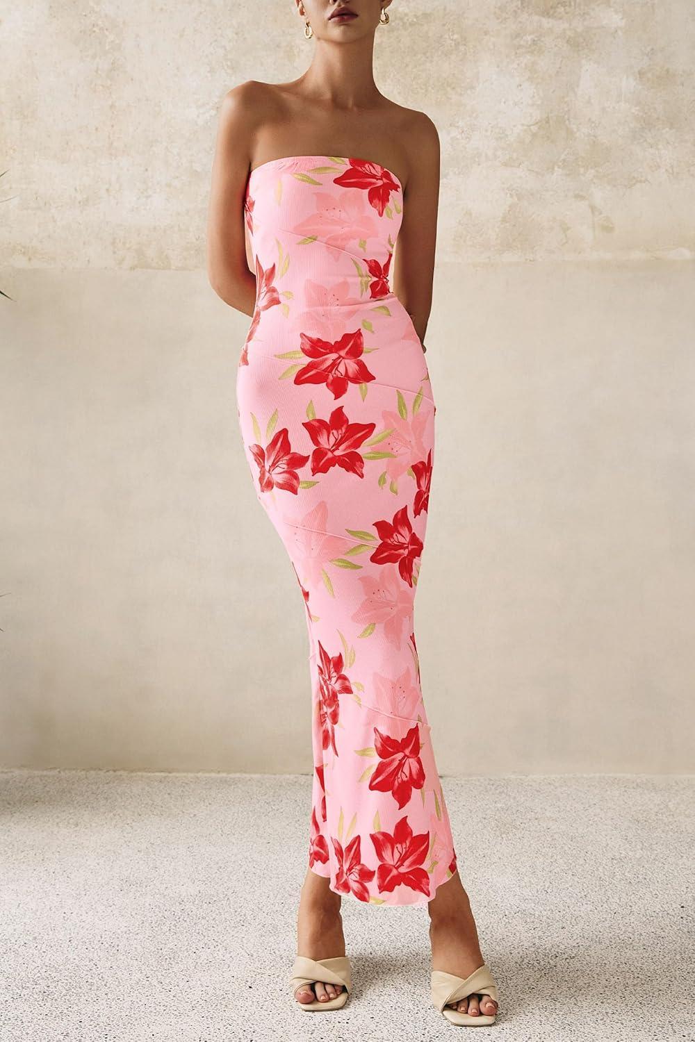 PRETTYGARDEN Women's 2025 Summer Floral Bodycon Maxi Dresses Ribbed Strapless Tube Casual Boho Party Long Dress(Floral Pink Red)