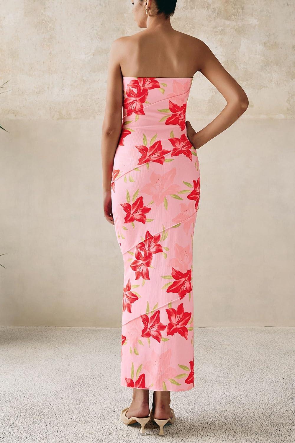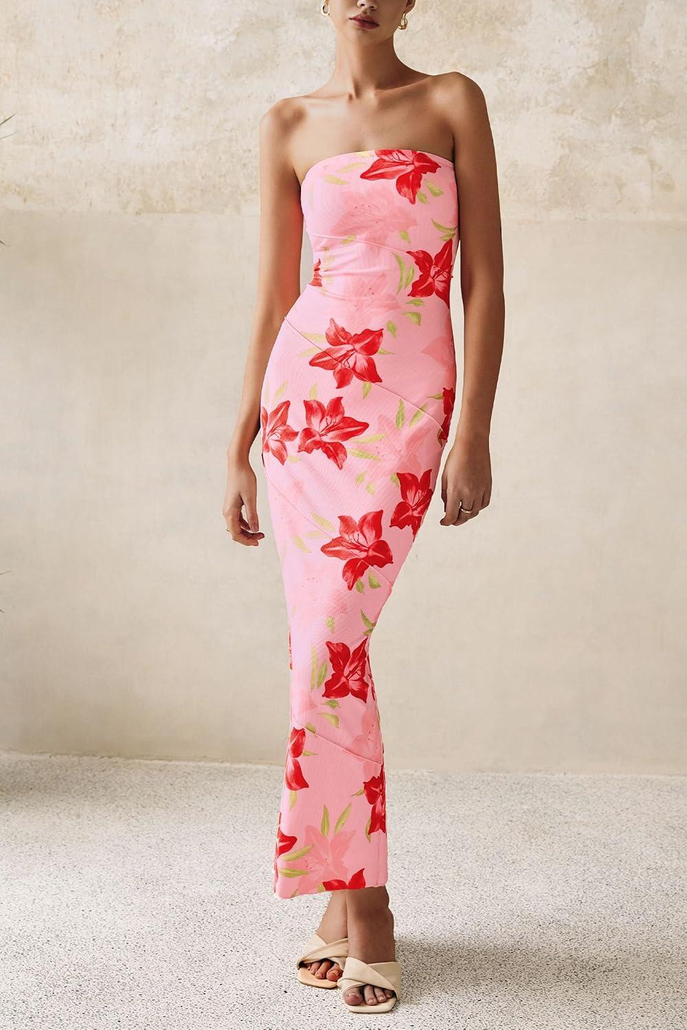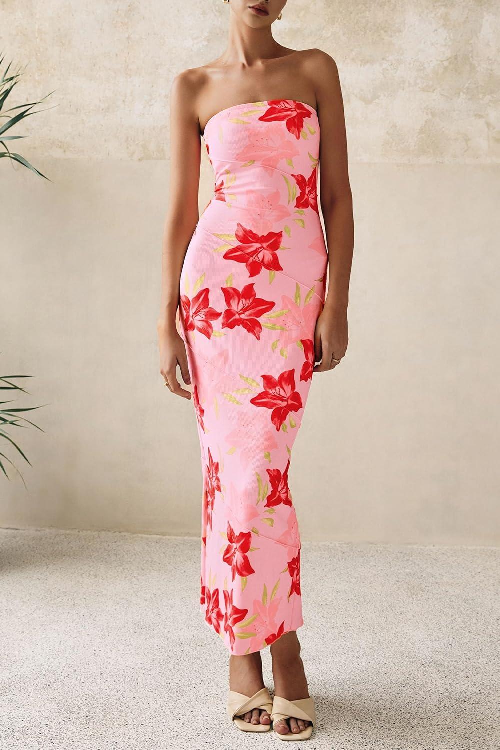 PRETTYGARDEN Women’s 2025 Summer Floral Bodycon Maxi Dresses Ribbed Strapless Tube Casual Boho Party Long Dress(Floral Pink Red)