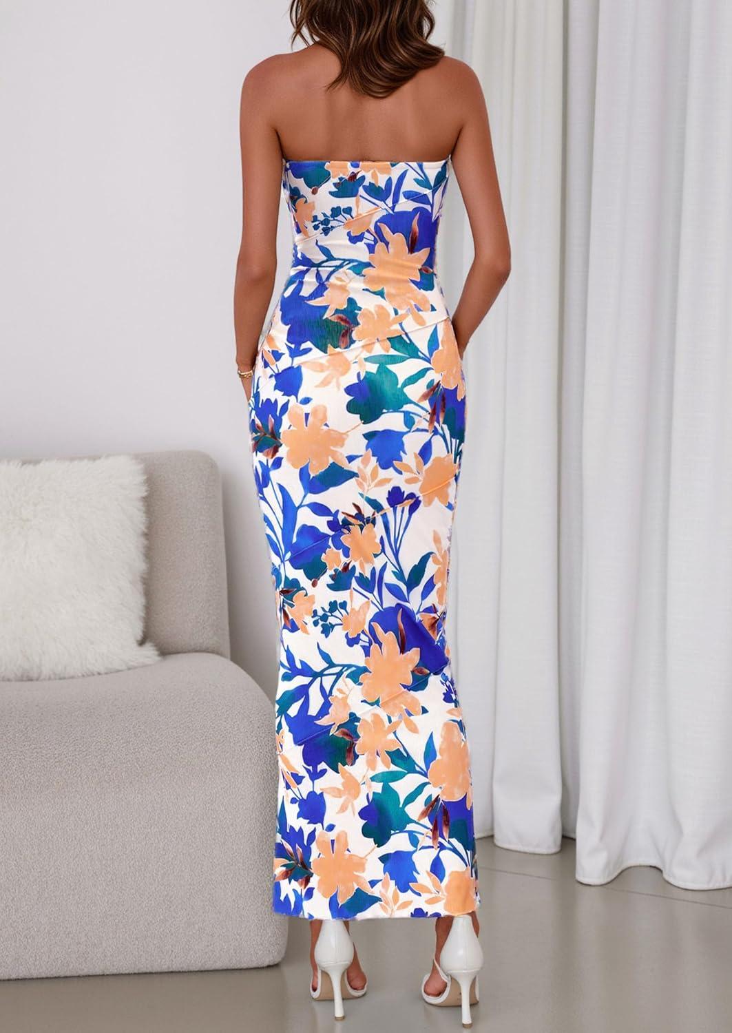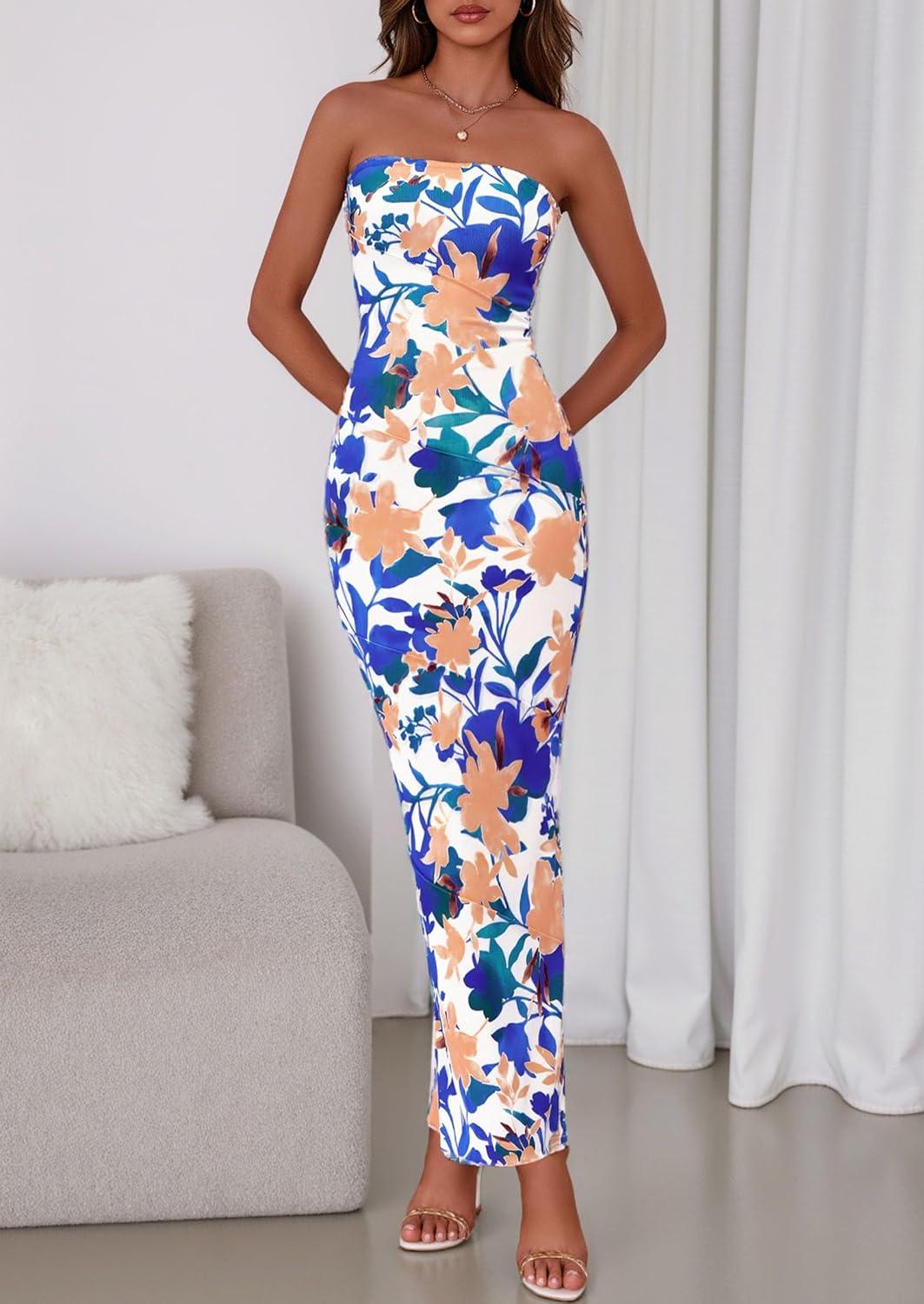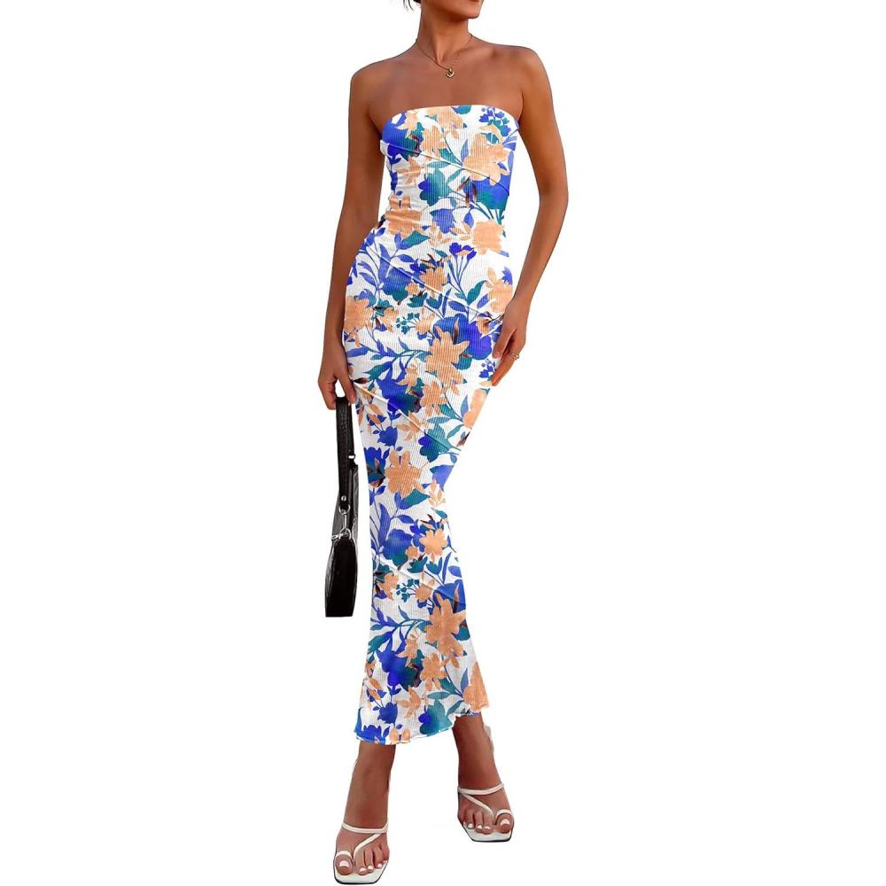 PRETTYGARDEN Women's 2025 Summer Floral Bodycon Maxi Dresses Ribbed Strapless Tube Casual Boho Party Long Dress(Floral White Blue)